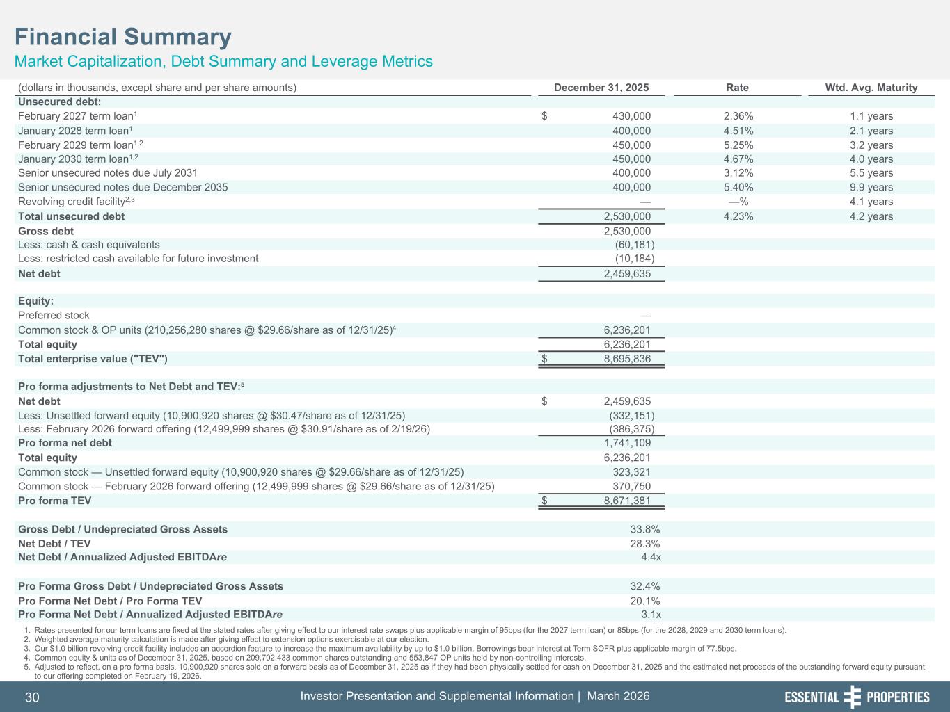Investor Presentation and Supplemental Information | March 202630 254, 192, 59 75, 108, 127 146, 204, 238 0, 0, 0 38, 169, 224 153, 223, 227 1. Rates presented for our term loans are fixed at the stated rates after giving effect to our interest rate swaps plus applicable margin of 95bps (for the 2027 term loan) or 85bps (for the 2028, 2029 and 2030 term loans). 2. Weighted average maturity calculation is made after giving effect to extension options exercisable at our election. 3. Our $1.0 billion revolving credit facility includes an accordion feature to increase the maximum availability by up to $1.0 billion. Borrowings bear interest at Term SOFR plus applicable margin of 77.5bps. 4. Common equity & units as of December 31, 2025, based on 209,702,433 common shares outstanding and 553,847 OP units held by non-controlling interests. 5. Adjusted to reflect, on a pro forma basis, 10,900,920 shares sold on a forward basis as of December 31, 2025 as if they had been physically settled for cash on December 31, 2025 and the estimated net proceeds of the outstanding forward equity pursuant to our offering completed on February 19, 2026. Financial Summary Market Capitalization, Debt Summary and Leverage Metrics 242, 242, 242 (dollars in thousands, except share and per share amounts) December 31, 2025 Rate Wtd. Avg. Maturity Unsecured debt: February 2027 term loan1 $ 430,000 2.36% 1.1 years January 2028 term loan1 400,000 4.51% 2.1 years February 2029 term loan1,2 450,000 5.25% 3.2 years January 2030 term loan1,2 450,000 4.67% 4.0 years Senior unsecured notes due July 2031 400,000 3.12% 5.5 years Senior unsecured notes due December 2035 400,000 5.40% 9.9 years Revolving credit facility2,3 — —% 4.1 years Total unsecured debt 2,530,000 4.23% 4.2 years Gross debt 2,530,000 Less: cash & cash equivalents (60,181) Less: restricted cash available for future investment (10,184) Net debt 2,459,635 Equity: Preferred stock — Common stock & OP units (210,256,280 shares @ $29.66/share as of 12/31/25)4 6,236,201 Total equity 6,236,201 Total enterprise value ("TEV") $ 8,695,836 Pro forma adjustments to Net Debt and TEV:5 Net debt $ 2,459,635 Less: Unsettled forward equity (10,900,920 shares @ $30.47/share as of 12/31/25) (332,151) Less: February 2026 forward offering (12,499,999 shares @ $30.91/share as of 2/19/26) (386,375) Pro forma net debt 1,741,109 Total equity 6,236,201 Common stock — Unsettled forward equity (10,900,920 shares @ $29.66/share as of 12/31/25) 323,321 Common stock — February 2026 forward offering (12,499,999 shares @ $29.66/share as of 12/31/25) 370,750 Pro forma TEV $ 8,671,381 Gross Debt / Undepreciated Gross Assets 33.8% Net Debt / TEV 28.3% Net Debt / Annualized Adjusted EBITDAre 4.4x Pro Forma Gross Debt / Undepreciated Gross Assets 32.4% Pro Forma Net Debt / Pro Forma TEV 20.1% Pro Forma Net Debt / Annualized Adjusted EBITDAre 3.1x