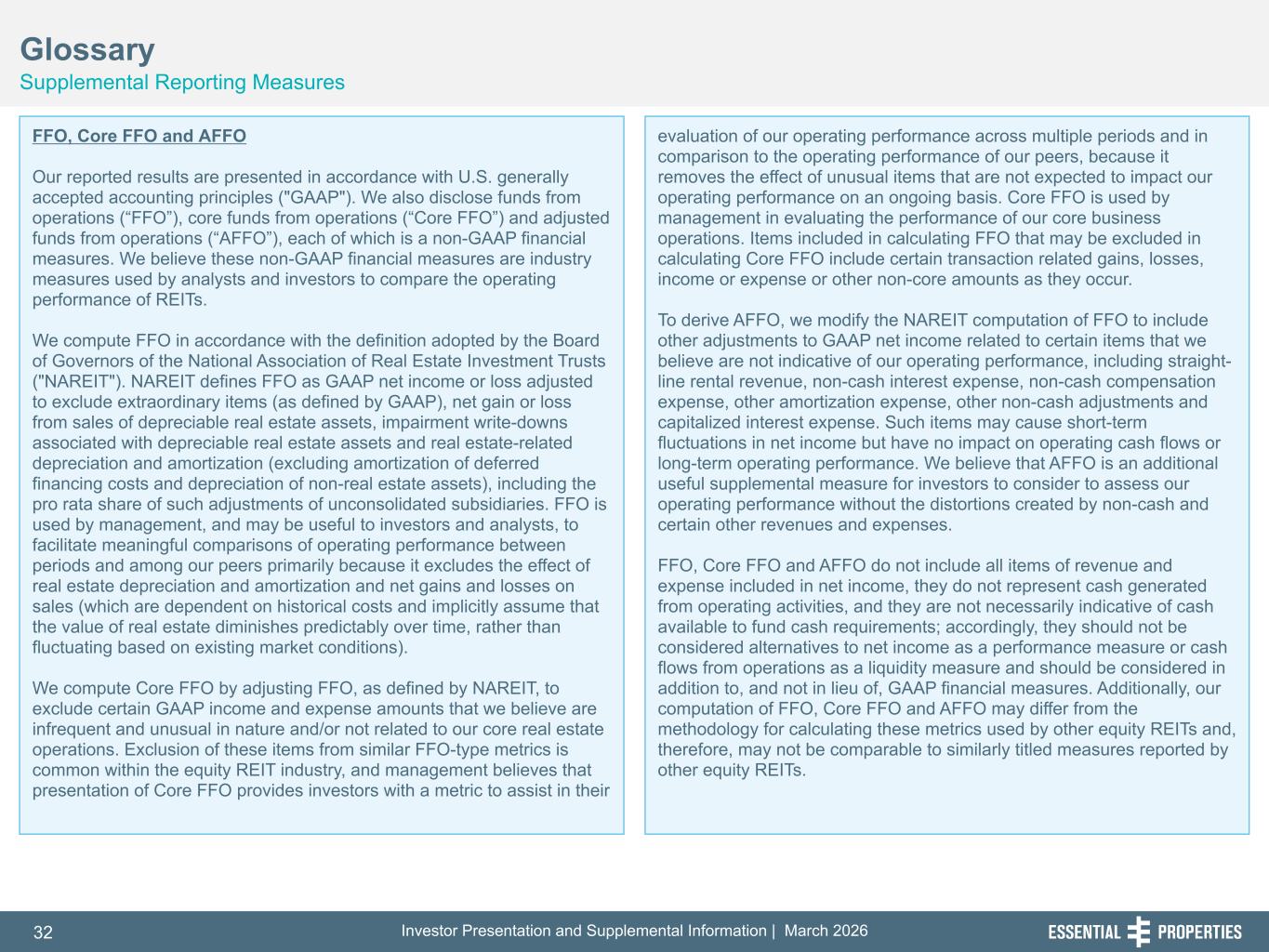 Investor Presentation and Supplemental Information | March 202632 254, 192, 59 75, 108, 127 146, 204, 238 0, 0, 0 38, 169, 224 153, 223, 227 Glossary Supplemental Reporting Measures 242, 242, 242 FFO, Core FFO and AFFO Our reported results are presented in accordance with U.S. generally accepted accounting principles ("GAAP"). We also disclose funds from operations (“FFO”), core funds from operations (“Core FFO”) and adjusted funds from operations (“AFFO”), each of which is a non-GAAP financial measures. We believe these non-GAAP financial measures are industry measures used by analysts and investors to compare the operating performance of REITs. We compute FFO in accordance with the definition adopted by the Board of Governors of the National Association of Real Estate Investment Trusts ("NAREIT"). NAREIT defines FFO as GAAP net income or loss adjusted to exclude extraordinary items (as defined by GAAP), net gain or loss from sales of depreciable real estate assets, impairment write-downs associated with depreciable real estate assets and real estate-related depreciation and amortization (excluding amortization of deferred financing costs and depreciation of non-real estate assets), including the pro rata share of such adjustments of unconsolidated subsidiaries. FFO is used by management, and may be useful to investors and analysts, to facilitate meaningful comparisons of operating performance between periods and among our peers primarily because it excludes the effect of real estate depreciation and amortization and net gains and losses on sales (which are dependent on historical costs and implicitly assume that the value of real estate diminishes predictably over time, rather than fluctuating based on existing market conditions). We compute Core FFO by adjusting FFO, as defined by NAREIT, to exclude certain GAAP income and expense amounts that we believe are infrequent and unusual in nature and/or not related to our core real estate operations. Exclusion of these items from similar FFO-type metrics is common within the equity REIT industry, and management believes that presentation of Core FFO provides investors with a metric to assist in their evaluation of our operating performance across multiple periods and in comparison to the operating performance of our peers, because it removes the effect of unusual items that are not expected to impact our operating performance on an ongoing basis. Core FFO is used by management in evaluating the performance of our core business operations. Items included in calculating FFO that may be excluded in calculating Core FFO include certain transaction related gains, losses, income or expense or other non-core amounts as they occur. To derive AFFO, we modify the NAREIT computation of FFO to include other adjustments to GAAP net income related to certain items that we believe are not indicative of our operating performance, including straight- line rental revenue, non-cash interest expense, non-cash compensation expense, other amortization expense, other non-cash adjustments and capitalized interest expense. Such items may cause short-term fluctuations in net income but have no impact on operating cash flows or long-term operating performance. We believe that AFFO is an additional useful supplemental measure for investors to consider to assess our operating performance without the distortions created by non-cash and certain other revenues and expenses. FFO, Core FFO and AFFO do not include all items of revenue and expense included in net income, they do not represent cash generated from operating activities, and they are not necessarily indicative of cash available to fund cash requirements; accordingly, they should not be considered alternatives to net income as a performance measure or cash flows from operations as a liquidity measure and should be considered in addition to, and not in lieu of, GAAP financial measures. Additionally, our computation of FFO, Core FFO and AFFO may differ from the methodology for calculating these metrics used by other equity REITs and, therefore, may not be comparable to similarly titled measures reported by other equity REITs.