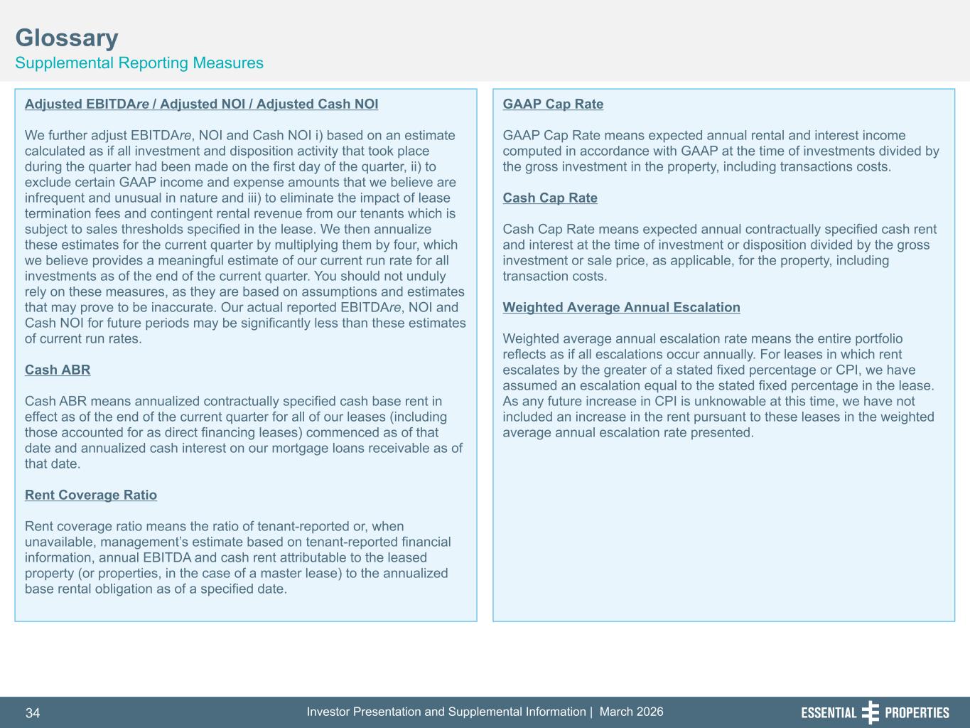 Investor Presentation and Supplemental Information | March 202634 254, 192, 59 75, 108, 127 146, 204, 238 0, 0, 0 38, 169, 224 153, 223, 227 Glossary Supplemental Reporting Measures 242, 242, 242 Adjusted EBITDAre / Adjusted NOI / Adjusted Cash NOI We further adjust EBITDAre, NOI and Cash NOI i) based on an estimate calculated as if all investment and disposition activity that took place during the quarter had been made on the first day of the quarter, ii) to exclude certain GAAP income and expense amounts that we believe are infrequent and unusual in nature and iii) to eliminate the impact of lease termination fees and contingent rental revenue from our tenants which is subject to sales thresholds specified in the lease. We then annualize these estimates for the current quarter by multiplying them by four, which we believe provides a meaningful estimate of our current run rate for all investments as of the end of the current quarter. You should not unduly rely on these measures, as they are based on assumptions and estimates that may prove to be inaccurate. Our actual reported EBITDAre, NOI and Cash NOI for future periods may be significantly less than these estimates of current run rates. Cash ABR Cash ABR means annualized contractually specified cash base rent in effect as of the end of the current quarter for all of our leases (including those accounted for as direct financing leases) commenced as of that date and annualized cash interest on our mortgage loans receivable as of that date. Rent Coverage Ratio Rent coverage ratio means the ratio of tenant-reported or, when unavailable, management’s estimate based on tenant-reported financial information, annual EBITDA and cash rent attributable to the leased property (or properties, in the case of a master lease) to the annualized base rental obligation as of a specified date. GAAP Cap Rate GAAP Cap Rate means expected annual rental and interest income computed in accordance with GAAP at the time of investments divided by the gross investment in the property, including transactions costs. Cash Cap Rate Cash Cap Rate means expected annual contractually specified cash rent and interest at the time of investment or disposition divided by the gross investment or sale price, as applicable, for the property, including transaction costs. Weighted Average Annual Escalation Weighted average annual escalation rate means the entire portfolio reflects as if all escalations occur annually. For leases in which rent escalates by the greater of a stated fixed percentage or CPI, we have assumed an escalation equal to the stated fixed percentage in the lease. As any future increase in CPI is unknowable at this time, we have not included an increase in the rent pursuant to these leases in the weighted average annual escalation rate presented.
