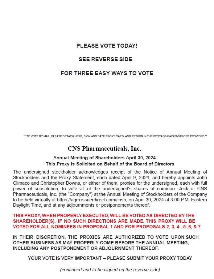 PLEASE VOTE TODAY! SEE REVERSE SIDE FOR THREE EASY WAYS TO VOTE ** TO VOTE BY MAIL, PLEASE DETACH HERE, SIGN AND DATE PROXY CARD, AND RETURN IN THE POSTAGE - PAID ENVELOPE PROVIDED ** CNS Pharmaceuticals, Inc. Annual Meeting of Shareholders April 30 , 2024 This Proxy is Solicited on Behalf of the Board of Directors The undersigned stockholder acknowledges receipt of the Notice of Annual Meeting of Stockholders and the Proxy Statement, each dated April 8 , 2024 , and hereby appoints John Climaco and Christopher Downs, or either of them, proxies for the undersigned, each with full power of substitution, to vote all of the undersigned's shares of common stock of CNS Pharmaceuticals, Inc . (the “Company”) at the Annual Meeting of Stockholders of the Company to be held virtually at https : //agm . issuerdirect . com/cnsp, on April 30 , 2024 at 3 : 00 P . M . Eastern Daylight Time, and at any adjournments or postponements thereof . THIS PROXY, WHEN PROPERLY EXECUTED, WILL BE VOTED AS DIRECTED BYTHE SHAREHOLDER(S). IF NO SUCH DIRECTIONS ARE MADE, THIS PROXY WILL BE VOTED FOR ALL NOMINEES IN PROPOSAL 1 AND FOR PROPOSALS 2, 3, 4 , 5 ,6, & 7 IN THEIR DISCRETION, THE PROXIES ARE AUTHORIZED TO VOTE UPON SUCH OTHER BUSINESS AS MAY PROPERLY COME BEFORE THE ANNUAL MEETING, INCLUDING ANY POSTPONEMENT OR ADJOURNMENT THEREOF. YOUR VOTE IS VERY IMPORTANT – PLEASE SUBMIT YOUR PROXY TODAY (continued and to be signed on the reverse side)