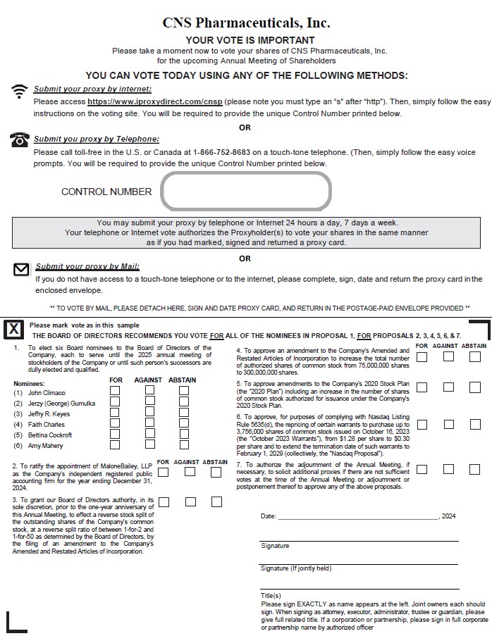 You may submit your proxy by telephone or Internet 24 hours a day, 7 days a week. Your telephone or Internet vote authorizes the Proxyholder(s) to vote your shares in the same manner as if you had marked, signed and returned a proxy card. Submit your proxy by Mail: If you do not have access to a touch - tone telephone or to the internet, please complete, sign, date and return the proxy card in the enclosed envelope. ** TO VOTE BY MAIL, PLEASE DETACH HERE, SIGN AND DATE PROXY CARD, AND RETURN IN THE POSTAGE - PAID ENVELOPE PROVIDED ** OR CNS Pharmaceuticals, Inc. YOUR VOTE IS IMPORTANT Please take a moment now to vote your shares of CNS Pharmaceuticals, Inc. for the upcoming Annual Meeting of Shareholders YOU CAN VOTE TODAY USING ANY OF THE FOLLOWING METHODS: Submit your proxy by internet: Please access http s://www.iproxydirect.com/cnsp (please note you must type an “s” after “http”). Then, simply follow the easy instructions on the voting site. You will be required to provide the unique Control Number printed below. OR Submit you proxy by Telephone: Please call toll - free in the U.S. or Canada at 1 - 866 - 752 - 8683 on a touch - tone telephone. (Then, simply follow the easy voice prompts. You will be required to provide the unique Control Number printed below. CONTROL NUMBER X Please mark vote as in this sample THE BOARD OF DIRECTORS RECOMMENDS YOU VOTE FOR ALL OF THE NOMINEES IN PROPOSAL 1, FOR PROPOSALS 2, 3, 4, 5, 6, & 7. 4. To approve an amendment to the Company’s Amended and Restated Articles of Incorporation to increase the total number of authorized shares of common stock from 75 , 000 , 000 shares to 300 , 000 , 000 shares . 5. To approve amendments to the Company's 2020 Stock Plan (the “ 2020 Plan”) including an increase in the number of shares of common stock authorized for issuance under the Company's 2020 Stock Plan . 6. To approve, for purposes of complying with Nasdaq Listing Rule 5635 (d), the repricing of certain warrants to purchase up to 3 , 756 , 000 shares of common stock issued on October 16 , 2023 (the “October 2023 Warrants”), from $ 1 . 28 per share to $ 0 . 30 per share and to extend the termination date of such warrants to February 1 , 2029 (collectively, the “Nasdaq Proposal”) . 7. To authorize the adjournment of the Annual Meeting, if necessary, to solicit additional proxies if there are not sufficient votes at the time of the Annual Meeting or adjournment or postponement thereof to approve any of the above proposals . 1. To elect six Board nominees to the Board of Directors of the Company, each to serve until the 2025 annual meeting of stockholders of the Company or until such person’s successors are dully elected and qualified. Nominees: (1) John Climaco (2) Jerzy (George) Gumulka (3) Jeffry R. Keyes (4) Faith Charles (5) Bettina Cockroft (6) Amy Mahery FOR AGAINST ABSTAIN Signature Date: , 2024 Signature (If jointly held) Title(s) Please sign EXACTLY as name appears at the left. Joint owners each should sign. When signing as attorney, executor, administrator, trustee or guardian, please give full related title. If a corporation or partnership, please sign in full corporate or partnership name by authorized officer FOR AGAINST ABSTAIN 2. To ratify the appointment of MaloneBailey, LLP as the Company’s independent registered public accounting firm for the year ending December 31 , 2024 . 3. To grant our Board of Directors authority, in its sole discretion, prior to the one - year anniversary of this Annual Meeting, to effect a reverse stock split of the outstanding shares of the Company’s common stock, at a reverse split ratio of between 1 - for - 2 and 1 - for - 50 as determined by the Board of Directors, by the filing of an amendment to the Company's Amended and Restated Articles of Incorporation . FOR AGAINST ABSTAIN