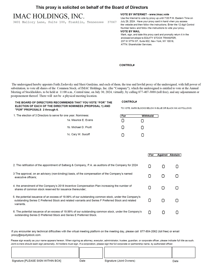 The annual meeting of stockholders (the “Annual Meeting”) of IMAC Holdings, Inc. (“IMAC” or the “Company”) will be held virtually on July 30, 2024 at 11:00 a.m., central time as a listen-only conference call by calling (877) 407-3088 (toll free) or +1 (877) 407-3088 (international). At the Annual Meeting, you will be asked to consider and vote on: