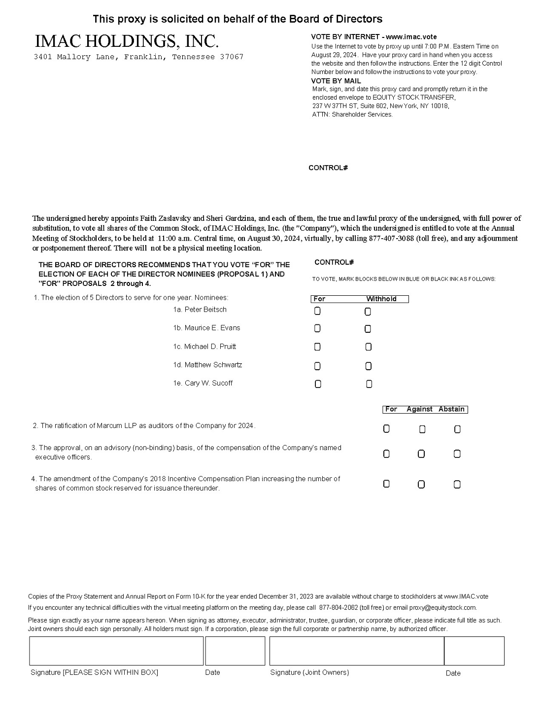 The annual meeting of stockholders (the “Annual Meeting”) of IMAC Holdings, Inc. (“IMAC” or the “Company”) will be held virtually on August 30, 2024 at 11:00 a.m., central time as a listen-only conference call by calling (877) 407-3088 (toll free) or +1 (877) 407-3088 (international). At the Annual Meeting, you will be asked to consider and vote on: