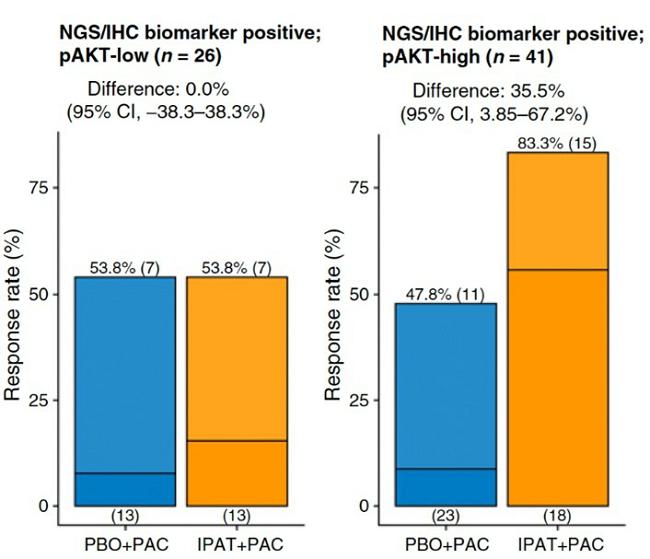 | ● | phosphorylated AKT, which is shown to be a predictor of response to the drug ipatasertib independent of the traditional biomarkers. The findings are clinically significant (95% confidence level of 4%-67% improvement over standard of care), even though the sample size is small. The study is published at https://pmc.ncbi.nlm.nih.gov/articles/PMC9377742/. |