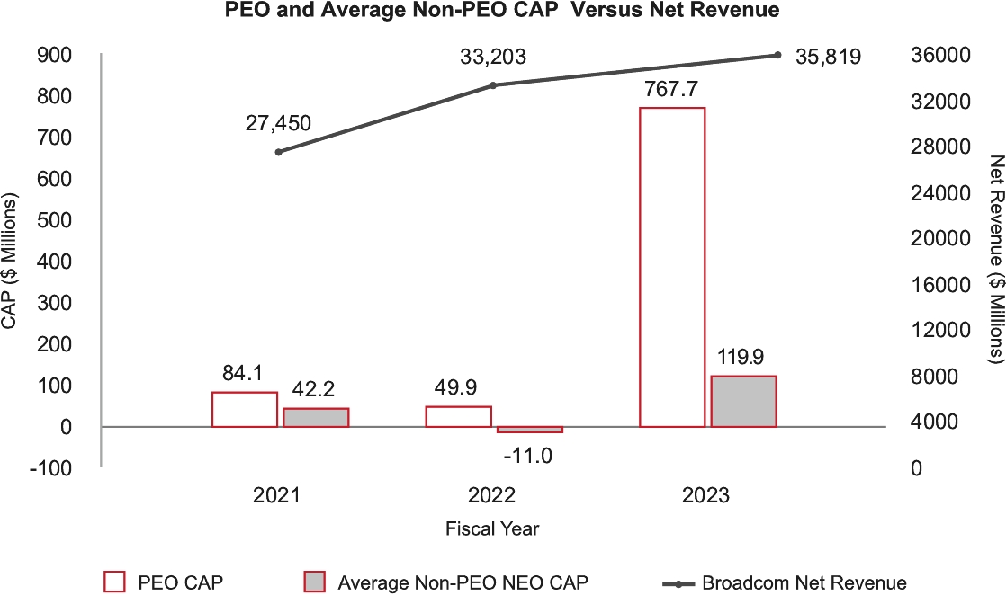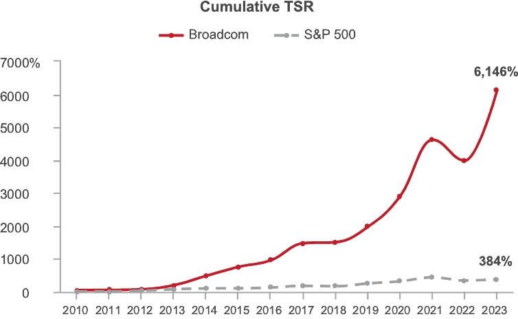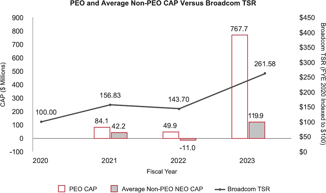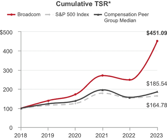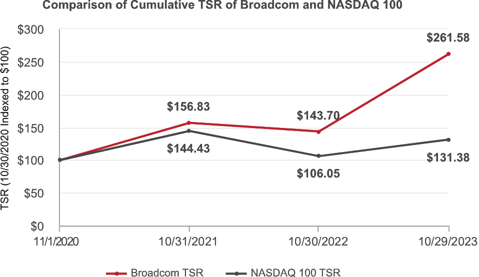 The stock price hurdles of $825, $950 and $1,125 are significantly higher than the $470.12 closing price of Broadcom common stock on the Grant Date and the stock price levels previously achieved by Broadcom as of the Grant Date. The stock price hurdles reflect a 75.5%, 102.1% and 139.3% increase to the $470.12 closing price of Broadcom common stock over a five-year period.