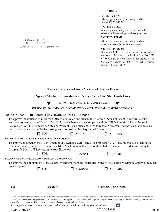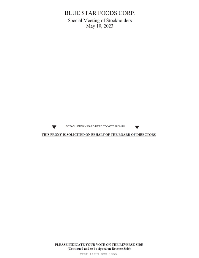 You are cordially invited to attend the special meeting of the stockholders (the “Special Meeting”) of Blue Star Foods Corp., a Delaware corporation (the “Company”), to be held at the offices of the Company, located at 3000 NW 109th Avenue, Miami, Florida 33172 on May 10, 2023, at 10:00 a.m. Eastern Time. The enclosed Notice of Special Meeting and Proxy Statement describe the business to be transacted at the Special Meeting.