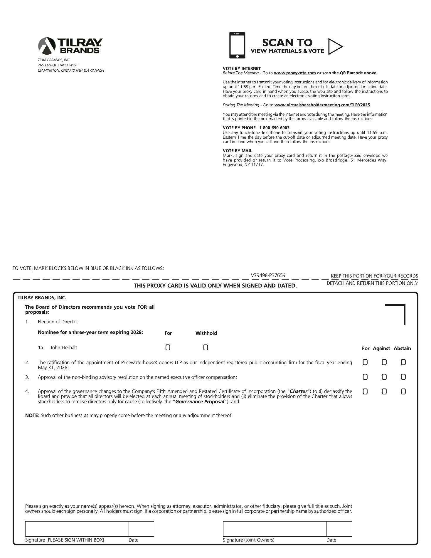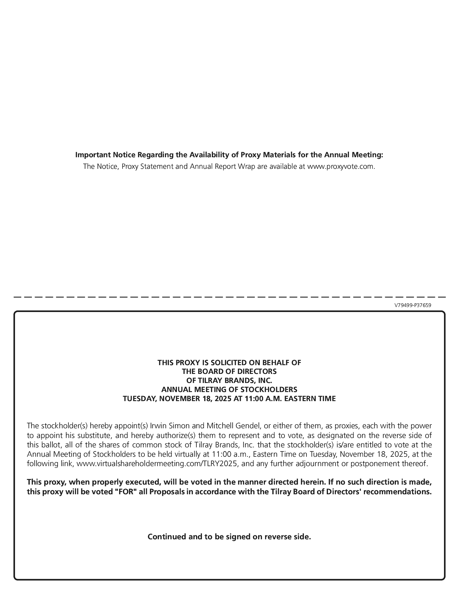 You are cordially invited to attend the Annual Meeting of Stockholders (“Annual Meeting”) of Tilray Brands, Inc. (the “Company”) to be held on Tuesday, November 18, 2025, at 11:00 a.m. EST. The Annual Meeting will be held in a virtual format, via live webcast over the internet.