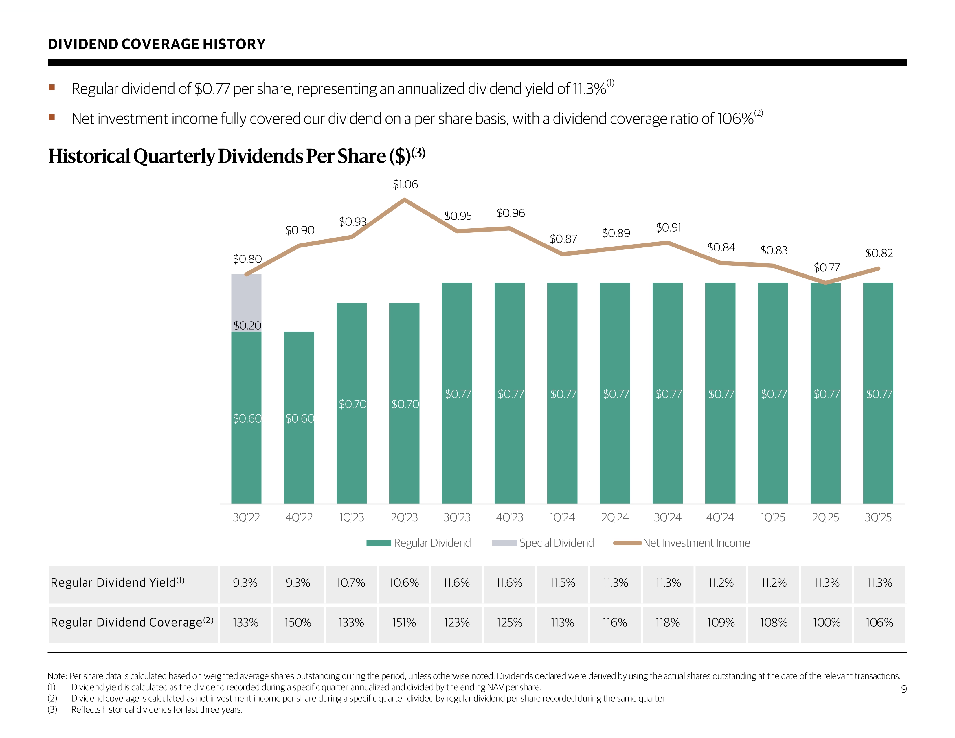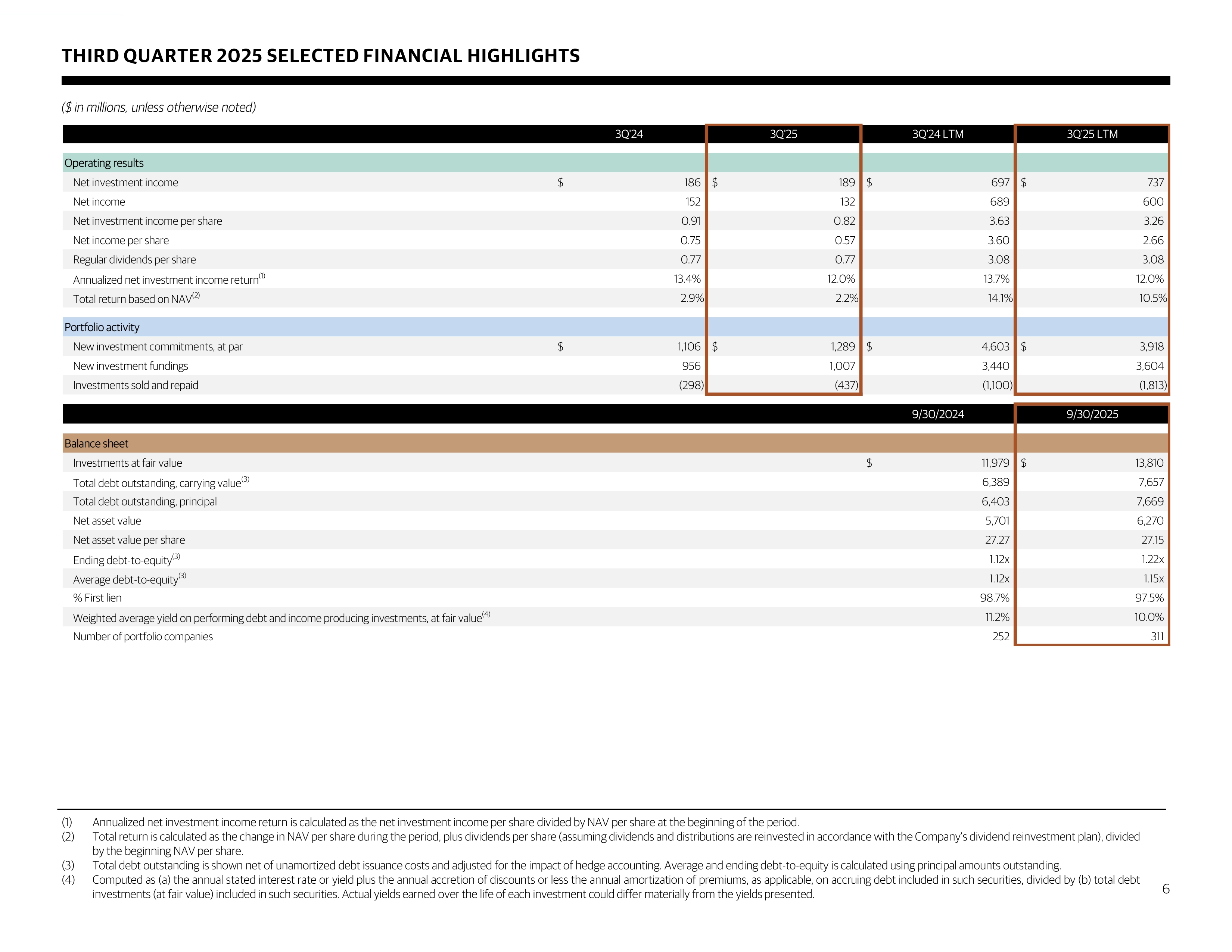 SELECTED FINANCIAL HIGHLIGHTS ($ in millions, except share and per share data) (1) Annualized net investment income return is calculated as the total quarterly net investment income per share (annualized) divided by NAV per share at the beginning of the quarter . (2) Total return is calculated as the change in NAV per share during the period, plus dividends per share (assuming dividends and distributions are reinvested in accordance with the Company's dividend reinvestment plan), divided by the beginning NAV per share . (3) Total debt outstanding is shown net of unamortized debt issuance costs and adjusted for the impact of hedge accounting . Average and ending debt - to - equity is calculated using principal amounts outstanding . (4) Computed as (a) the annual stated interest rate or yield plus the annual accretion of discounts or less the annual amortization of premiums, as applicable, on accruing debt included in such securities, divided by (b) total debt investments (at cost or fair value, as applicable) included in such securities . Actual yields earned over the life of each investment could differ materially from the yields presented . 17 3Q'24 4Q'24 1Q'25 2Q'25 3Q'25 Operating results Net investment income $ 186 $ 183 $ 189 $ 176 $ 189 Net income 152 162 150 155 132 Net investment income per share 0.91 0.84 0.83 0.77 0.82 Net income per share 0.75 0.75 0.66 0.68 0.57 Regular dividends per share 0.77 0.77 0.77 0.77 0.77 Annualized net investment income return (1) 13.4% 12.3% 12.1% 11.2% 12.0% Quarterly total return based on NAV (2) 2.9% 2.9% 2.8% 2.3% 2.2% Portfolio activity New investment commitments, at par 1,106$ 1,241$ 756$ 631$ 1,289$ New investment fundings 956 1,377 689 530 1,007 Investments sold and repaid (298) (213) (978) (185) (437) 9/30/2024 12/31/2024 3/31/2025 6/30/2025 9/30/2025 Balance sheet Investments at fair value $ 11,979 $ 13,093 $ 12,834 $ 13,253 $ 13,810 Total debt outstanding, carrying value (3) 6,389 7,056 7,383 7,091 7,657 Total debt outstanding, principal 6,403 7,094 7,414 7,108 7,669 Net asset value 5,701 6,077 6,241 6,288 6,270 Net asset value per share 27.27 27.39 27.39 27.33 27.15 Ending debt-to-equity (3) 1.12x 1.17x 1.19x 1.13x 1.22x Average debt-to-equity (3) 1.12x 1.15x 1.16x 1.13x 1.15x % First lien 98.7% 98.0% 98.2% 98.2% 97.5% Weighted average yield on performing debt and income producing investments, at fair value (4) 11.2% 10.4% 10.2% 10.2% 10.0% Number of portfolio companies 252 276 284 295 311