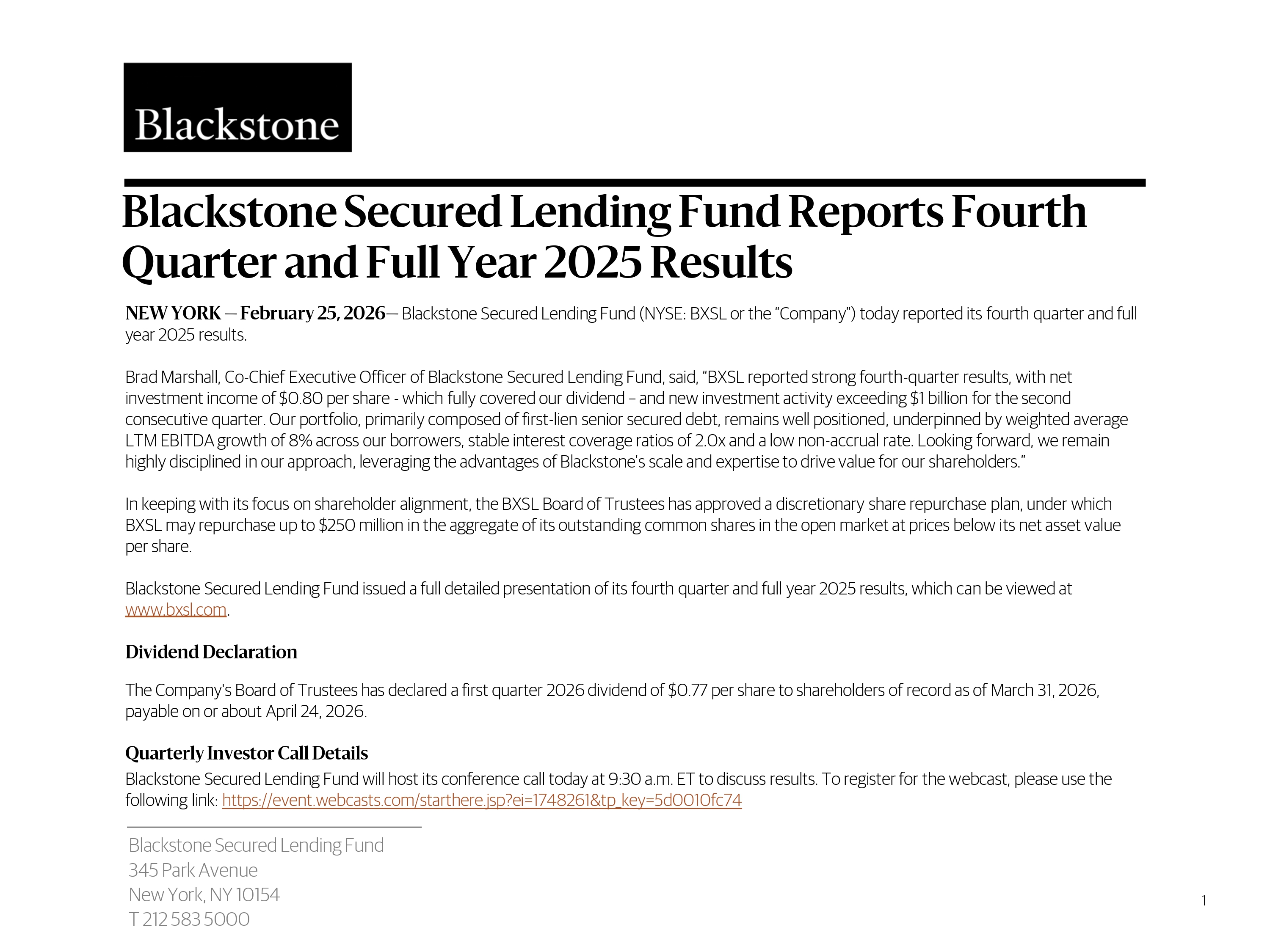 NEW YORK — February 25, 2026 — Blackstone Secured Lending Fund (NYSE: BXSL or the “Company”) today reported its fourth quarter and full year 2025 results. Brad Marshall, Co - Chief Executive Officer of Blackstone Secured Lending Fund, said, “BXSL reported strong fourth - quarter results , with net investment income of $0.80 per share - which fully covered our dividend – and new investment activity exceeding $1 billion for t he second consecutive quarter. Our portfolio, primarily composed of first - lien senior secured debt, remains well positioned, underpinned b y weighted average LTM EBITDA growth of 8% across our borrowers, stable interest coverage ratios of 2.0x and a low non - accrual rate. Lookin g forward, we remain highly disciplined in our approach, leveraging the advantages of Blackstone’s scale and expertise to drive value fo r o ur shareholders.” In keeping with its focus on shareholder alignment, the BXSL Board of Trustees has approved a discretionary share repurchase pla n, under which BXSL may repurchase up to $250 million in the aggregate of its outstanding common shares in the open market at prices b elo w its net asset value per share. Blackstone Secured Lending Fund issued a full detailed presentation of its fourth quarter and full year 2025 results, which c an be viewed at www.bxsl.com . Dividend Declaration The Company's Board of Trustees has declared a first quarter 2026 dividend of $0.77 per share to shareholders of record as of March 31, 2026, payable on or about April 24, 2026 . Quarterly Investor Call Details Blackstone Secured Lending Fund will host its conference call today at 9:30 a.m. ET to discuss results. To register for the w ebc ast, please use the following link: https://event.webcasts.com/starthere.jsp?ei=1748261&tp_key=5d0010fc74 Blackstone Secured Lending Fund 345 Park Avenue New York , NY 10154 T 212 583 5000 Blackstone Secured Lending Fund Reports Fourth Quarter and Full Year 2025 Results 1