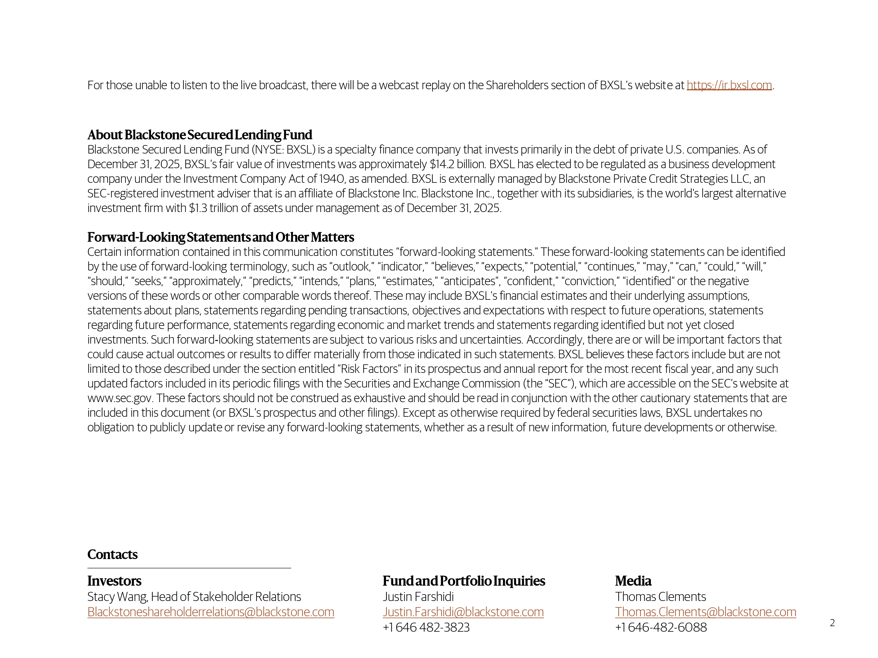 2 For those unable to listen to the live broadcast, there will be a webcast replay on the Shareholders section of BXSL’s websit e at https://ir.bxsl.com . About Blackstone Secured Lending Fund Blackstone Secured Lending Fund (NYSE: BXSL) is a specialty finance company that invests primarily in the debt of private U.S . c ompanies. As of December 31, 2025 , BXSL’s fair value of investments was approximately $14.2 billion. BXSL has elected to be regulated as a business development company under the Investment Company Act of 1940, as amended. BXSL is externally managed by Blackstone Private Cr edi t Strategies LLC, an SEC - registered investment adviser that is an affiliate of Blackstone Inc. Blackstone Inc., together with its subsidiaries, is the world’s largest alternative investment firm with $ 1.3 trillion of assets under management as of December 31, 2025 . Forward - Looking Statements and Other Matters Certain information contained in this communication constitutes “forward - looking statements.” These forward - looking statements c an be identified by the use of forward - looking terminology, such as “outlook,” “indicator,” “believes,” “expects,” “potential,” “conti nues,” “may,” “can,” “could,” “will,” “should,” “seeks,” “approximately,” “predicts,” “intends,” “plans,” “estimates,” “anticipates”, “conf ide nt,” “conviction,” “identified” or the negative versions of these words or other comparable words thereof. These may include BXSL’s financial es tim ates and their underlying assumptions, statements about plans, statements regarding pending transactions, objectives and expectations wit h respect to future operations, statements regarding future performance, statements regarding economic and market trends and statements re garding identified but not yet closed investments. Such forward-looking statements are subject to various risks and uncertainties. Ac cor dingly, there are or will be important factors that could cause actual outcomes or results to differ materially from those indicated in suc h s tatements. BXSL believes these factors include but are not limited to those described under the section entitled “Risk Factors” in its prospe ctu s and annual report for the most recent fiscal year, and any such updated factors included in its periodic filings with the Securities and Ex change Commission (the “SEC”), which are accessible on the SEC’s website at www.sec.gov. These factors should not be construed as ex hau stive and should be read in conjunction with the other cautionary statements that are included in this document (or BXSL’s prospectus a nd other filings). Except as otherwise required by federal securities laws, BXSL undertakes no obligation to publicly update or revise an y forward - looking statements, whether as a result of new information, future developments or otherwise. Contacts Fund and Portfolio Inquiries Justin Farshidi Justin. Farshidi @blackstone.com +1 646 482 - 3823 Media Thomas Clements Thomas. Clements @blackstone.com +1 646 - 482 - 6088 Investors Stacy Wang, Head of Stakeholder Relations Blackstoneshareholderrelations@blackstone.co m