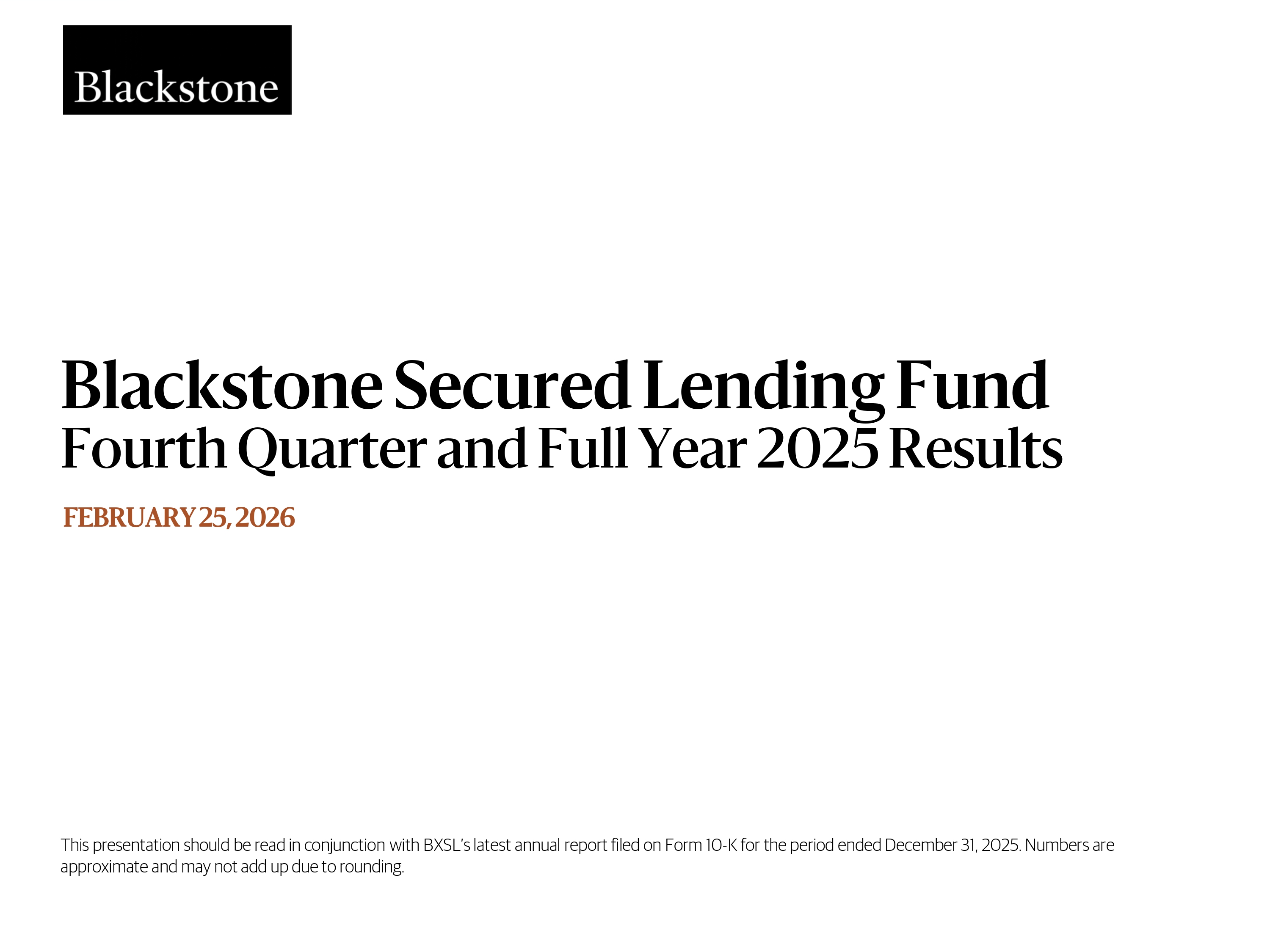 BXSL – Quarter Ended September 30, 2024 Blackstone Secured Lending Fund Fourth Quarter and Full Year 2025 Results FEBRUARY 25, 2026 This presentation should be read in conjunction with BXSL’s latest annual report filed on Form 10 - K for the period ended December 31, 2025. Numbers are approximate and may not add up due to rounding.