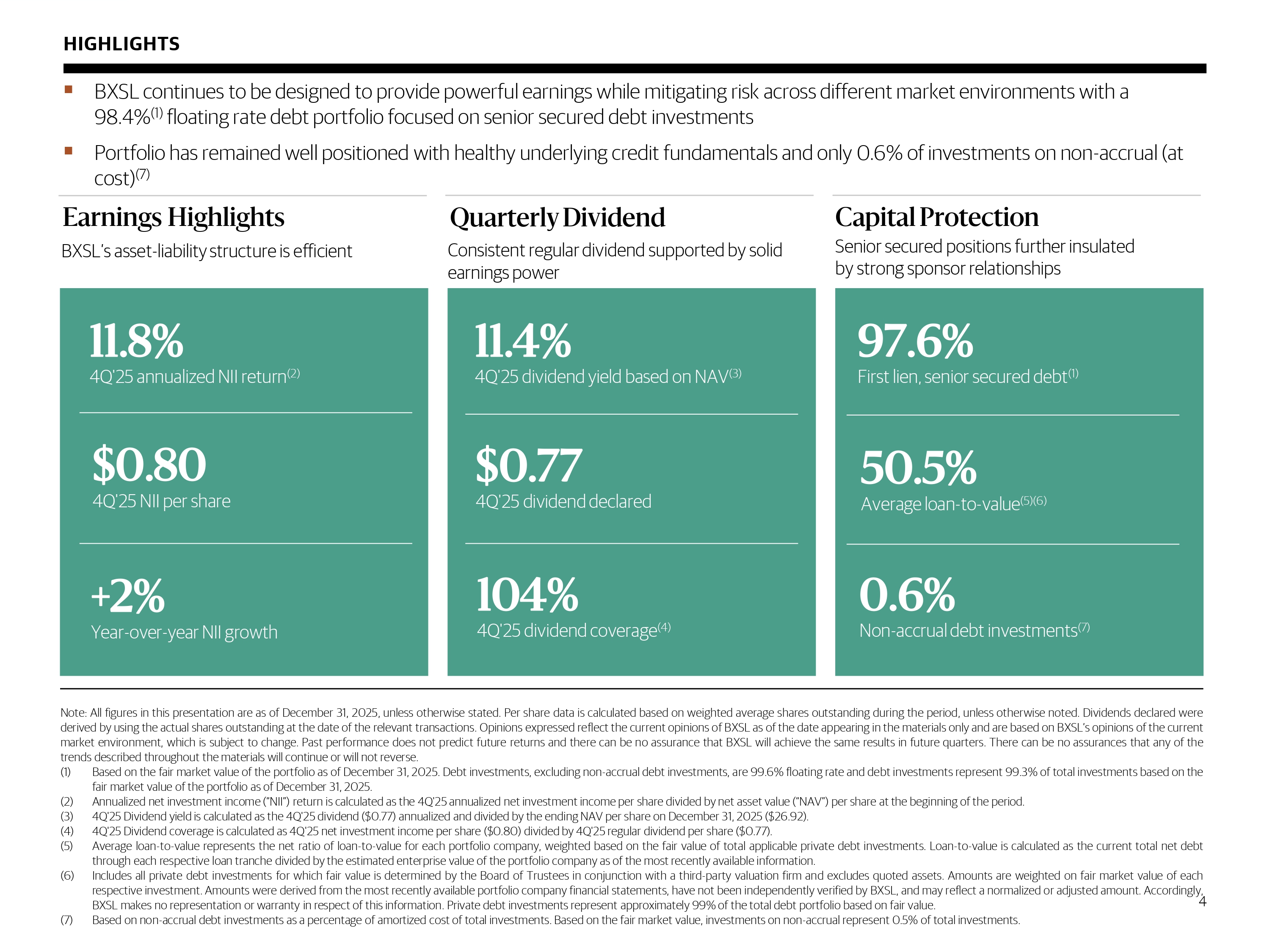 1 HIGHLIGHTS ▪ BXSL continues to be designed to provide powerful earnings while mitigating risk across different market environments with a 98.4% ( 1) floating rate debt portfolio focused on senior secured debt investments ▪ Portfolio has remained well positioned with healthy underlying credit fundamentals and only 0.6% of investments on non - accrual (at cost) (7) Consistent, disciplined focus on low - leverage loans to strong sponsors Note : All figures in this presentation are as of December 31 , 2025 , unless otherwise stated . Per share data is calculated based on weighted average shares outstanding during the period, unless otherwise noted . Dividends declared were derived by using the actual shares outstanding at the date of the relevant transactions . Opinions expressed reflect the current opinions of BXSL as of the date appearing in the materials only and are based on BXSL’s opinions of the current market environment, which is subject to change . Past performance does not predict future returns and there can be no assurance that BXSL will achieve the same results in future quarters . There can be no assurances that any of the trends described throughout the materials will continue or will not reverse . (1) Based on the fair market value of the portfolio as of December 31 , 2025 . Debt investments, excluding non - accrual debt investments, are 99 . 6 % floating rate and debt investments represent 99 . 3 % of total investments based on the fair market value of the portfolio as of December 31 , 2025 . (2) Annualized net investment income (“NII”) return is calculated as the 4 Q' 25 annualized net investment income per share divided by net asset value (“NAV”) per share at the beginning of the period . (3) 4 Q' 25 Dividend yield is calculated as the 4 Q' 25 dividend ( $ 0 . 77 ) annualized and divided by the ending NAV per share on December 31 , 2025 ( $ 26 . 92 ) . (4) 4 Q' 25 Dividend coverage is calculated as 4 Q' 25 net investment income per share ( $ 0 . 80 ) divided by 4 Q' 25 regular dividend per share ( $ 0 . 77 ) . (5) Average loan - to - value represents the net ratio of loan - to - value for each portfolio company, weighted based on the fair value of total applicable private debt investments . Loan - to - value is calculated as the current total net debt through each respective loan tranche divided by the estimated enterprise value of the portfolio company as of the most recently available information . (6) Includes all private debt investments for which fair value is determined by the Board of Trustees in conjunction with a third - party valuation firm and excludes quoted assets . Amounts are weighted on fair market value of each respective investment . Amounts were derived from the most recently available portfolio company financial statements, have not been independently verified by BXSL, and may reflect a normalized or adjusted amount . Accordingly, BXSL makes no representation or warranty in respect of this information . Private debt investments represent approximately 99 % of the total debt portfolio based on fair value . (7) Based on non - accrual debt investments as a percentage of amortized cost of total investments . Based on the fair market value, investments on non - accrual represent 0 . 5 % of total investments . Earnings Highlights Quarterly Dividend Capital Protection 11.8% 4Q'25 annualized NII return (2) $ 0.80 4Q'25 NII per share + 2% Year - over - year NII growth 11.4% 4Q'25 dividend yield based on NAV (3) $ 0.77 4Q'25 dividend declared 104% 4Q'25 dividend coverage (4) 97.6% First lien, senior secured debt (1) 50.5% Average loan - to - value (5)(6) 0.6% Non - accrual debt investments (7) BXSL’s asset - liability structure is efficient Consistent regular dividend supported by solid earnings power Senior secured positions further insulated by strong sponsor relationships