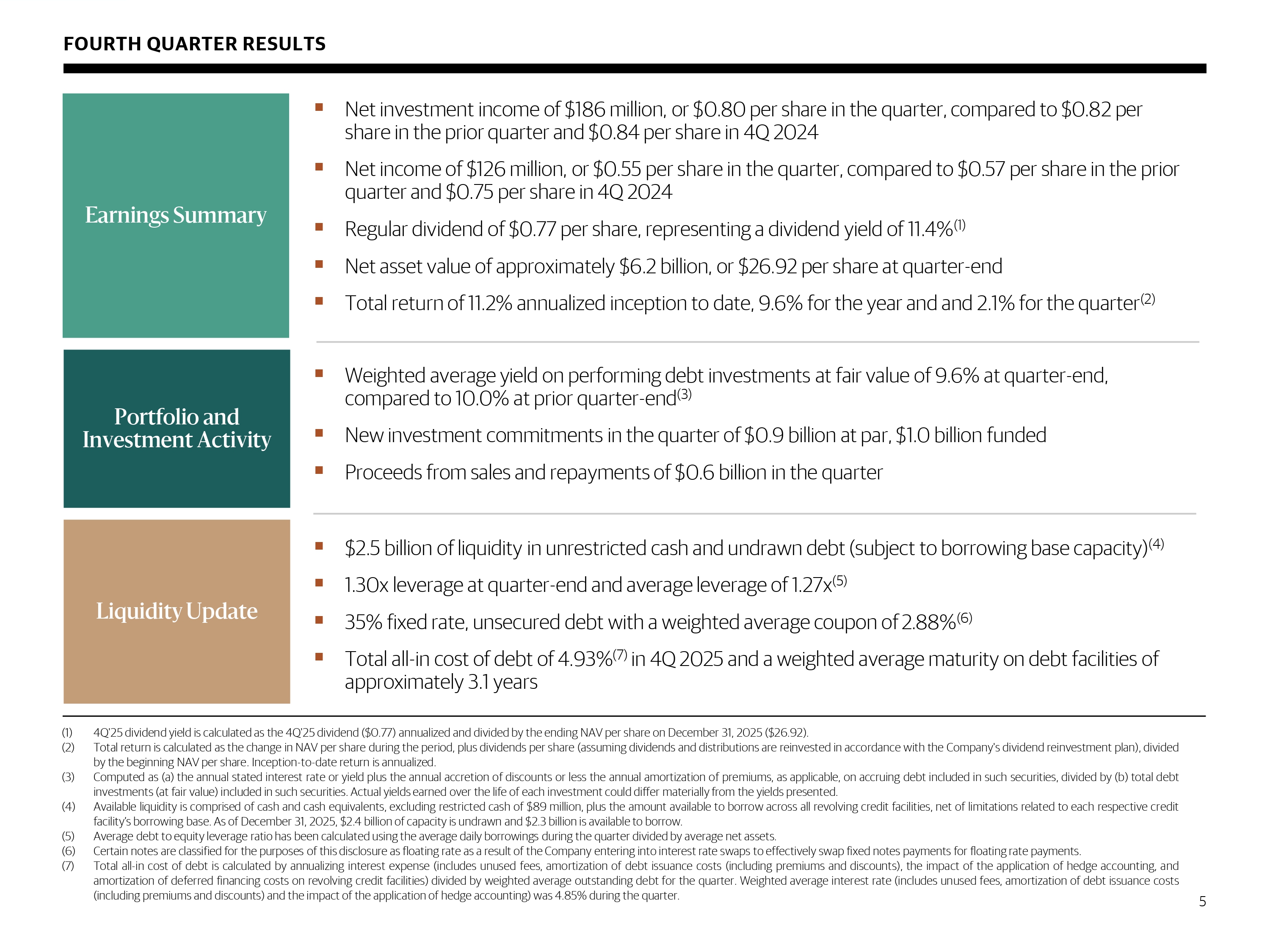 Portfolio and Investment Activity ▪ Weighted average yield on performing debt investments at fair value of 9.6% at quarter - end, compared to 10.0% at prior quarter - end (3) ▪ New investment commitments in the quarter of $ 0.9 billion at par, $ 1.0 billion funded ▪ Proceeds from sales and repayments of $ 0.6 billion in the quarter Earnings Summary ▪ Net investment income of $ 186 million , or $ 0.80 per share in the quarter, compared to $ 0.82 per share in the prior quarter and $ 0.84 per share in 4Q 2024 ▪ Net income of $ 126 million, or $ 0.55 per share in the quarter, compared to $ 0.57 per share in the prior quarter and $ 0.75 per share in 4Q 2024 ▪ Regular dividend of $ 0.77 per share, representing a dividend yield of 11.4% (1) ▪ Net asset value of approximately $ 6.2 billion, or $ 26.92 per share at quarter - end ▪ Total return of 11.2% annualized inception to date, 9.6% for the year and and 2.1% for the quarter (2) (1) 4 Q' 25 dividend yield is calculated as the 4 Q' 25 dividend ( $ 0 . 77 ) annualized and divided by the ending NAV per share on December 31 , 2025 ( $ 26 . 92 ) . (2) Total return is calculated as the change in NAV per share during the period, plus dividends per share (assuming dividends and distributions are reinvested in accordance with the Company's dividend reinvestment plan), divided by the beginning NAV per share . Inception - to - date return is annualized . (3) Computed as (a) the annual stated interest rate or yield plus the annual accretion of discounts or less the annual amortization of premiums, as applicable, on accruing debt included in such securities, divided by (b) total debt investments (at fair value) included in such securities . Actual yields earned over the life of each investment could differ materially from the yields presented . (4) Available liquidity is comprised of cash and cash equivalents, excluding restricted cash of $ 89 million, plus the amount available to borrow across all revolving credit facilities, net of limitations related to each respective credit facility’s borrowing base . As of December 31 , 2025 , $ 2 . 4 billion of capacity is undrawn and $ 2 . 3 billion is available to borrow . (5) Average debt to equity leverage ratio has been calculated using the average daily borrowings during the quarter divided by average net assets . (6) Certain notes are classified for the purposes of this disclosure as floating rate as a result of the Company entering into interest rate swaps to effectively swap fixed notes payments for floating rate payments . (7) Total all - in cost of debt is calculated by annualizing interest expense (includes unused fees, amortization of debt issuance costs (including premiums and discounts), the impact of the application of hedge accounting, and amortization of deferred financing costs on revolving credit facilities) divided by weighted average outstanding debt for the quarter . Weighted average interest rate (includes unused fees, amortization of debt issuance costs (including premiums and discounts) and the impact of the application of hedge accounting) was 4 . 85 % during the quarter . FOURTH QUARTER RESULTS 5 Liquidity Update ▪ $ 2.5 billion of liquidity in unrestricted cash and undrawn debt (subject to borrowing base capacity) (4) ▪ 1.30x leverage at quarter - end and average leverage of 1.27x (5) ▪ 35% fixed rate, unsecured debt with a weighted average coupon of 2.88% (6) ▪ Total all - in cost of debt of 4.93% (7) in 4Q 2025 and a weighted average maturity on debt facilities of approximately 3.1 years
