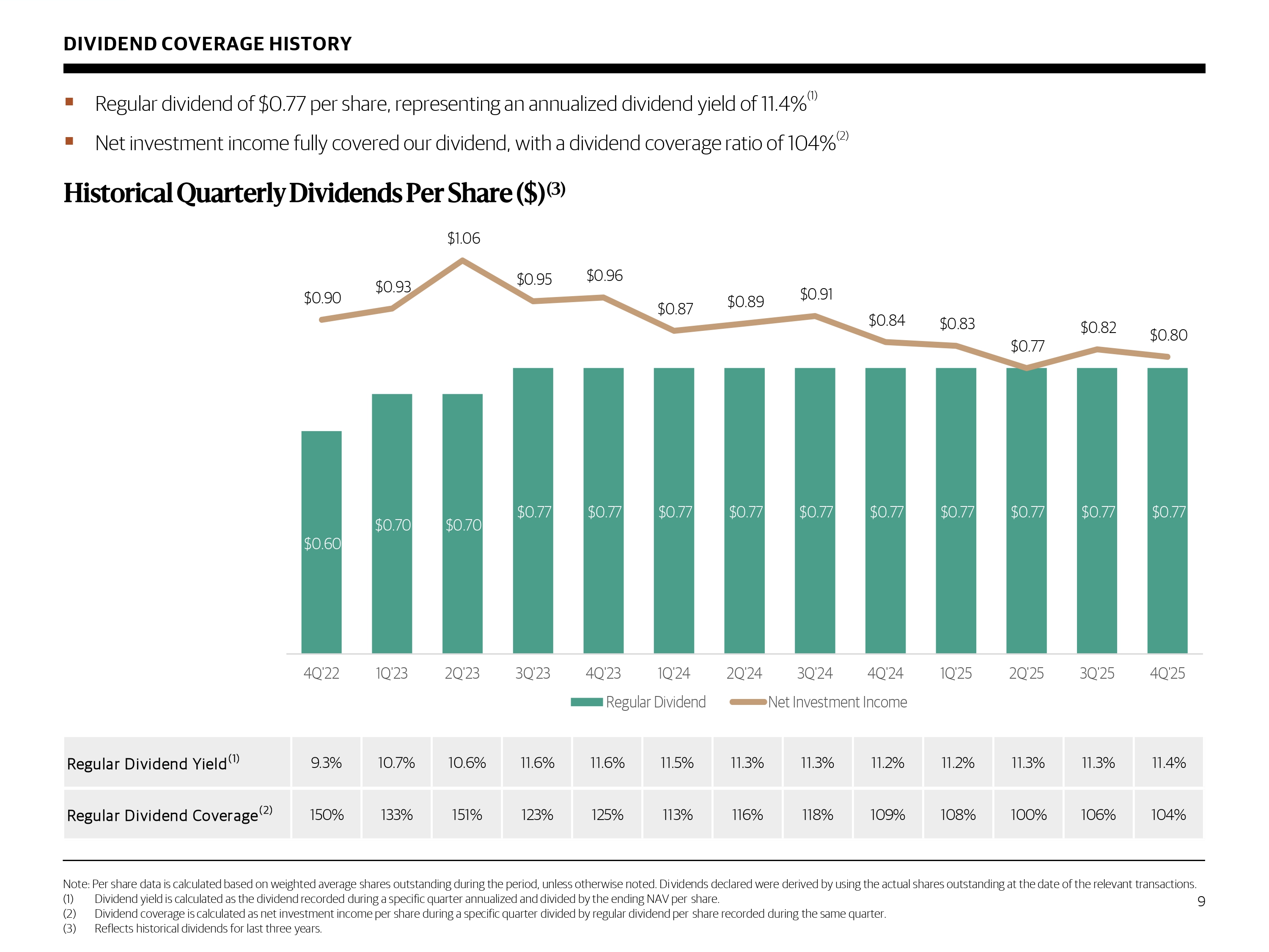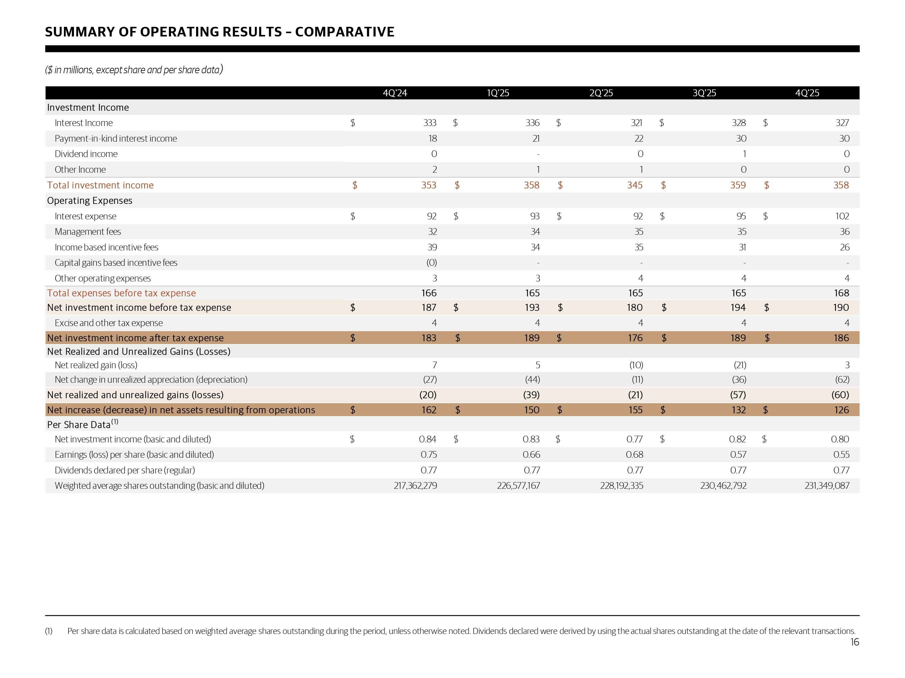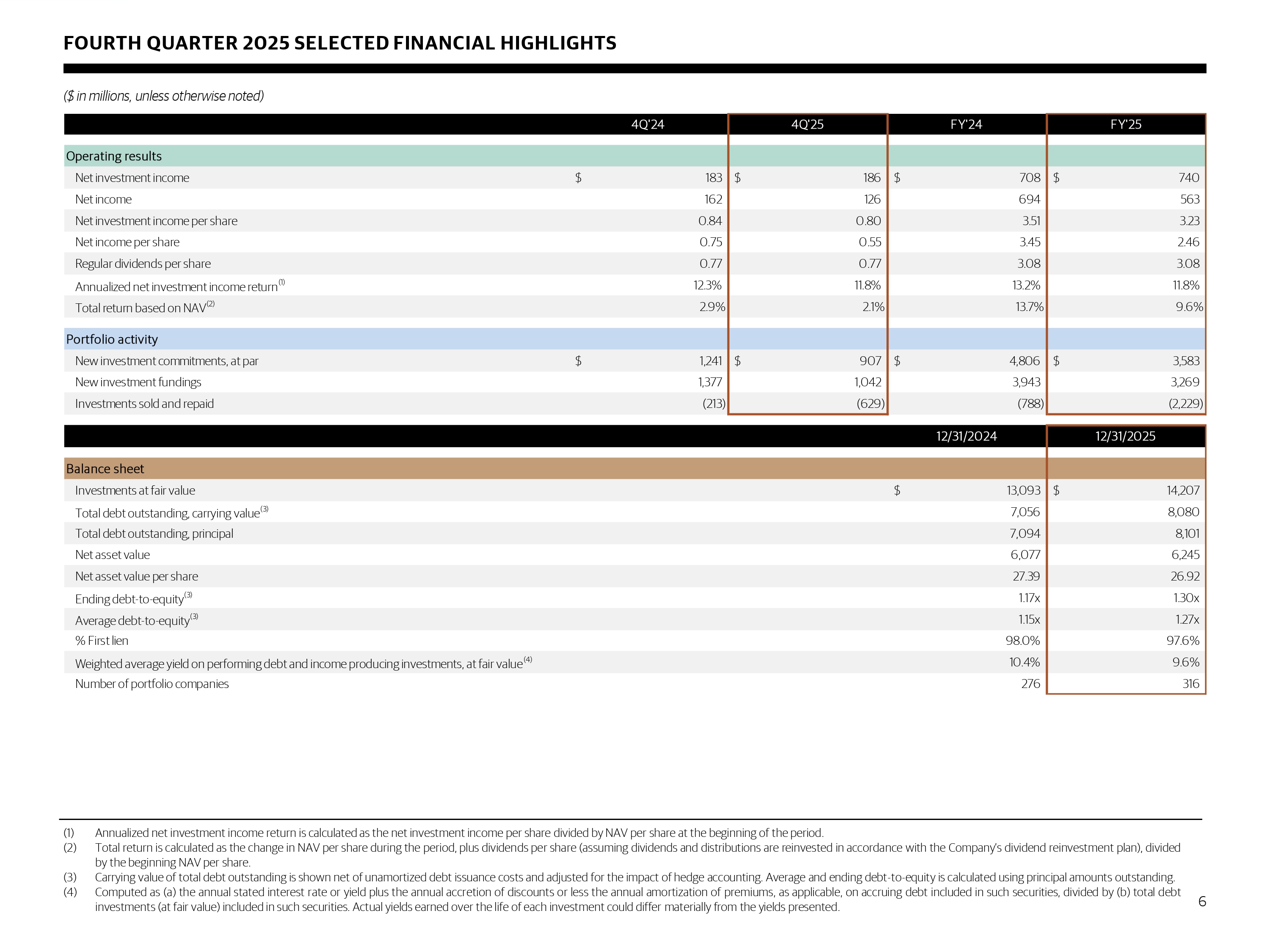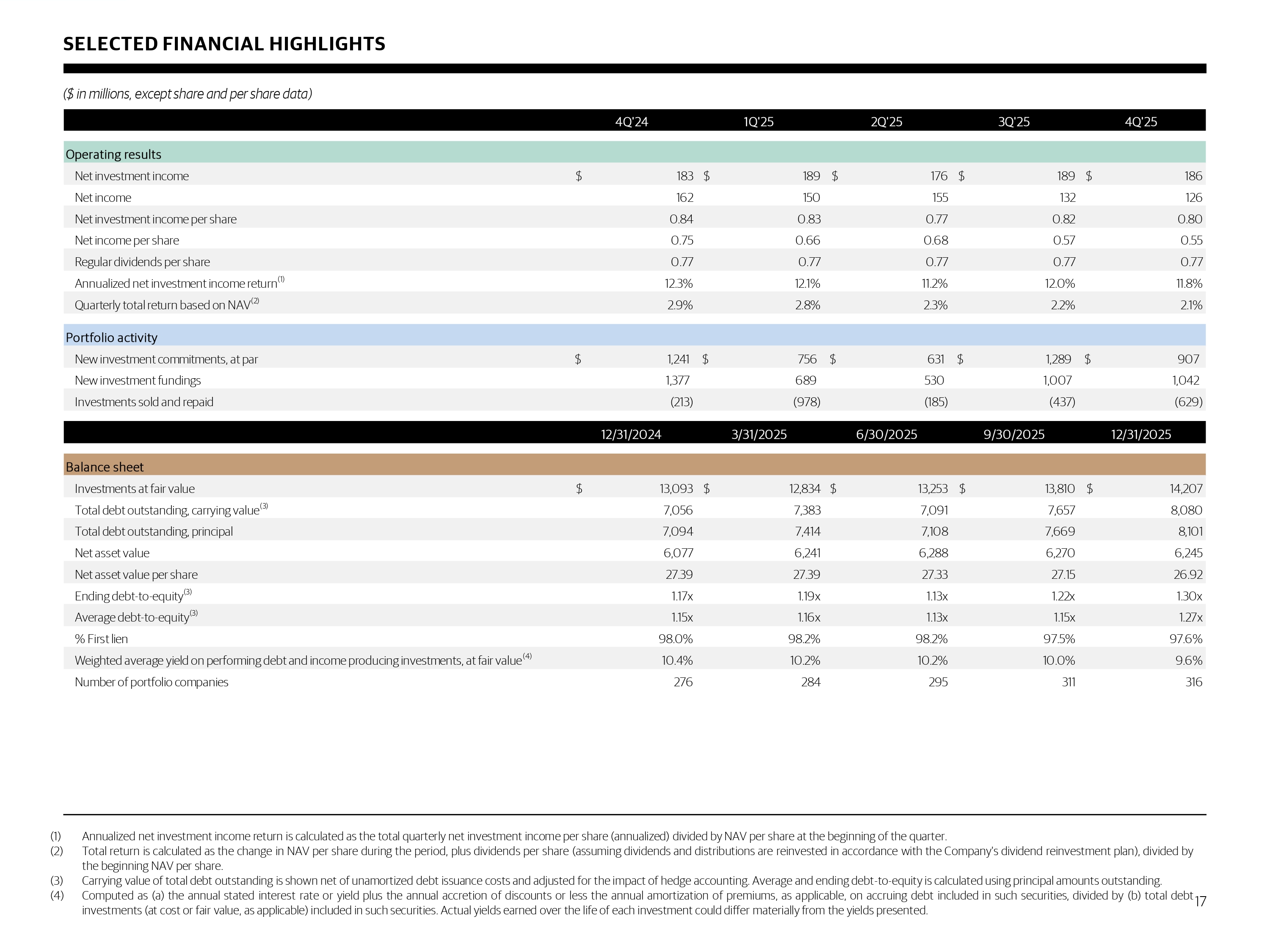 SELECTED FINANCIAL HIGHLIGHTS ($ in millions, except share and per share data) (1) Annualized net investment income return is calculated as the total quarterly net investment income per share (annualized) divided by NAV per share at the beginning of the quarter . (2) Total return is calculated as the change in NAV per share during the period, plus dividends per share (assuming dividends and distributions are reinvested in accordance with the Company's dividend reinvestment plan), divided by the beginning NAV per share . (3) Carrying value of total debt outstanding is shown net of unamortized debt issuance costs and adjusted for the impact of hedge accounting . Average and ending debt - to - equity is calculated using principal amounts outstanding . (4) Computed as (a) the annual stated interest rate or yield plus the annual accretion of discounts or less the annual amortization of premiums, as applicable, on accruing debt included in such securities, divided by (b) total debt investments (at cost or fair value, as applicable) included in such securities . Actual yields earned over the life of each investment could differ materially from the yields presented . 17 4Q'24 1Q'25 2Q'25 3Q'25 4Q'25 Operating results Net investment income $ 183 $ 189 $ 176 $ 189 $ 186 Net income 162 150 155 132 126 Net investment income per share 0.84 0.83 0.77 0.82 0.80 Net income per share 0.75 0.66 0.68 0.57 0.55 Regular dividends per share 0.77 0.77 0.77 0.77 0.77 Annualized net investment income return (1) 12.3% 12.1% 11.2% 12.0% 11.8% Quarterly total return based on NAV (2) 2.9% 2.8% 2.3% 2.2% 2.1% Portfolio activity New investment commitments, at par 1,241$ 756$ 631$ 1,289$ 907$ New investment fundings 1,377 689 530 1,007 1,042 Investments sold and repaid (213) (978) (185) (437) (629) 12/31/2024 3/31/2025 6/30/2025 9/30/2025 12/31/2025 Balance sheet Investments at fair value $ 13,093 $ 12,834 $ 13,253 $ 13,810 $ 14,207 Total debt outstanding, carrying value (3) 7,056 7,383 7,091 7,657 8,080 Total debt outstanding, principal 7,094 7,414 7,108 7,669 8,101 Net asset value 6,077 6,241 6,288 6,270 6,245 Net asset value per share 27.39 27.39 27.33 27.15 26.92 Ending debt-to-equity (3) 1.17x 1.19x 1.13x 1.22x 1.30x Average debt-to-equity (3) 1.15x 1.16x 1.13x 1.15x 1.27x % First lien 98.0% 98.2% 98.2% 97.5% 97.6% Weighted average yield on performing debt and income producing investments, at fair value (4) 10.4% 10.2% 10.2% 10.0% 9.6% Number of portfolio companies 276 284 295 311 316