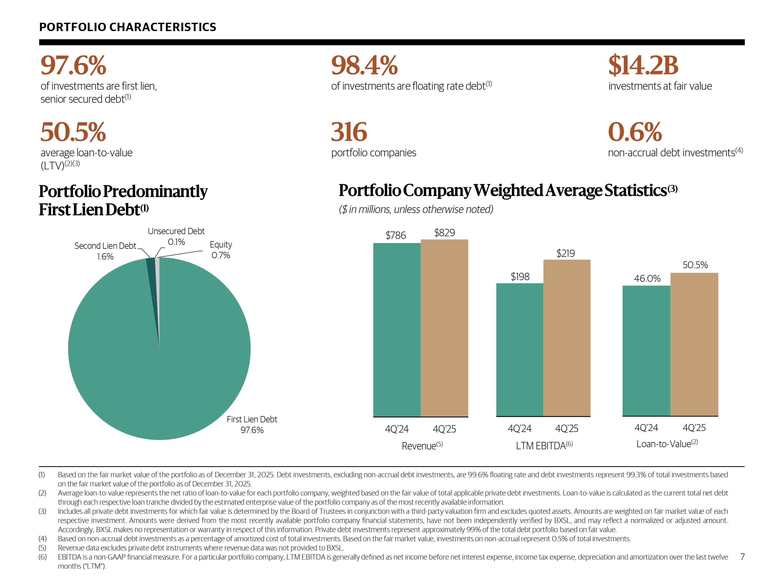 46.0% 50.5% 4Q'24 4Q'25 Loan - to - Value (2) $198 $219 4Q'24 4Q'25 LTM EBITDA (6) $786 $829 4Q'24 4Q'25 Revenue (5) PORTFOLIO CHARACTERISTICS Portfolio Predominantly First Lien Debt (1) $ 14.2 B investments at fair value 316 portfolio companies 0.6% non - accrual debt investments (4) 98.4% of investments are floating rate debt (1) 97.6% of investments are first lien, senior secured debt (1) 50.5% a verage loan - to - value (LTV) (2)(3) (1) Based on the fair market value of the portfolio as of December 31 , 2025 . Debt investments, excluding non - accrual debt investments, are 99 . 6 % floating rate and debt investments represent 99 . 3 % of total investments based on the fair market value of the portfolio as of December 31 , 2025 . (2) Average loan - to - value represents the net ratio of loan - to - value for each portfolio company, weighted based on the fair value of total applicable private debt investments . Loan - to - value is calculated as the current total net debt through each respective loan tranche divided by the estimated enterprise value of the portfolio company as of the most recently available information . (3) Includes all private debt investments for which fair value is determined by the Board of Trustees in conjunction with a third - party valuation firm and excludes quoted assets . Amounts are weighted on fair market value of each respective investment . Amounts were derived from the most recently available portfolio company financial statements, have not been independently verified by BXSL, and may reflect a normalized or adjusted amount . Accordingly, BXSL makes no representation or warranty in respect of this information . Private debt investments represent approximately 99 % of the total debt portfolio based on fair value . (4) Based on non - accrual debt investments as a percentage of amortized cost of total investments . Based on the fair market value, investments on non - accrual represent 0 . 5 % of total investments . (5) Revenue data excludes private debt instruments where revenue data was not provided to BXSL . (6) EBITDA is a non - GAAP financial measure . For a particular portfolio company, LTM EBITDA is generally defined as net income before net interest expense, income tax expense, depreciation and amortization over the last twelve months (“LTM”) . Portfolio Company Weighted Average Statistics (3) ($ in millions, unless otherwise noted) 7 First Lien Debt 97.6% Second Lien Debt 1.6% Unsecured Debt 0.1% Equity 0.7%