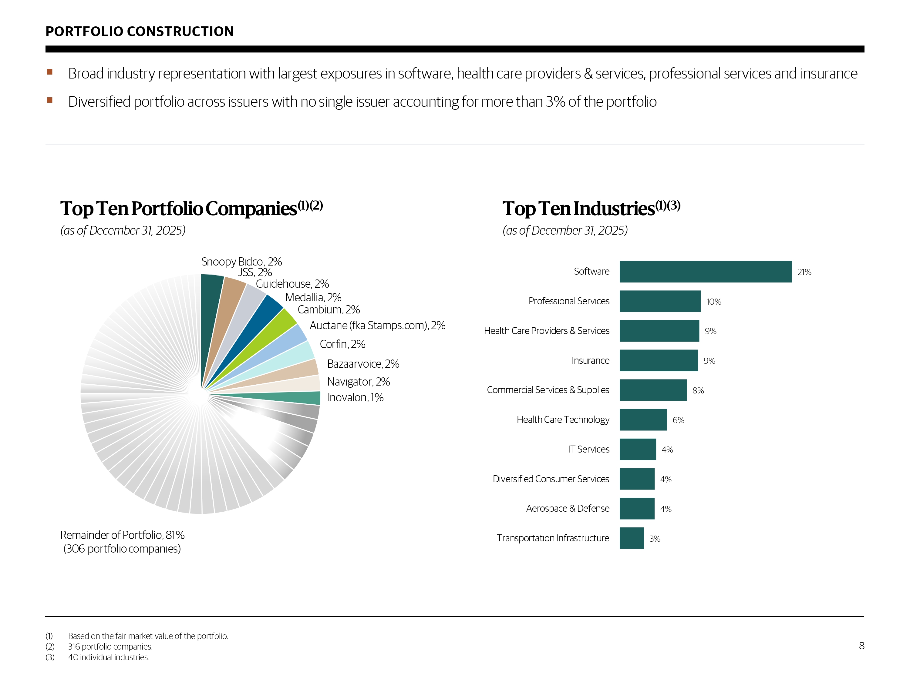 PORTFOLIO CONSTRUCTION ▪ Broad industry representation with largest exposures in software, health care providers & services, professional services and insurance ▪ Diversified portfolio across issuers with no single issuer accounting for more than 3% of the portfolio Top Ten Portfolio Companies (1)(2) (as of December 31, 2025 ) Top Ten Industries (1)(3) (as of December 31, 2025 ) 8 (1) Based on the fair market value of the portfolio. (2) 316 portfolio companies. (3) 40 individual industries. 21% 10% 9% 9% 8% 6% 4% 4% 4% 3% Software Professional Services Health Care Providers & Services Insurance Commercial Services & Supplies Health Care Technology IT Services Diversified Consumer Services Aerospace & Defense Transportation Infrastructure Snoopy Bidco , 2% JSS , 2% Guidehouse , 2% Medallia , 2% Cambium , 2% Auctane (fka Stamps.com) , 2% Corfin , 2% Bazaarvoice , 2% Navigator , 2% Inovalon , 1% Remainder of Portfolio, 81% (306 portfolio companies)
