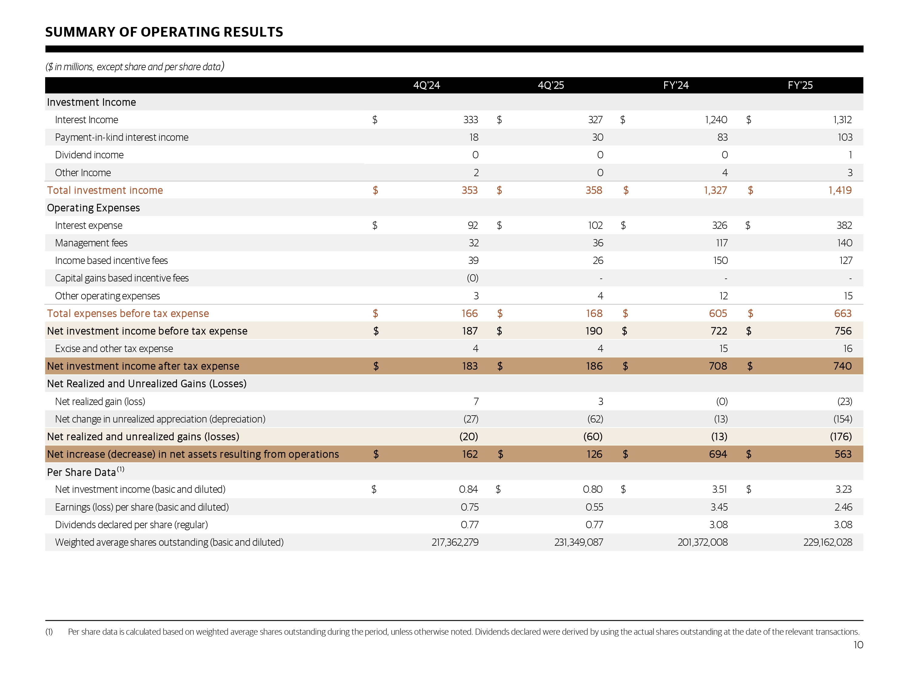 SUMMARY OF OPERATING RESULTS (1) Per share data is calculated based on weighted average shares outstanding during the period, unless otherwise noted . Dividends declared were derived by using the actual shares outstanding at the date of the relevant transactions . ($ in millions, except share and per share data ) 10 4Q'24 4Q'25 FY'24 FY'25 Investment Income Interest Income $ 333 $ 327 $ 1,240 $ 1,312 Payment-in-kind interest income 18 30 83 103 Dividend income 0 0 0 1 Other Income 2 0 4 3 Total investment income $ 353 $ 358 $ 1,327 $ 1,419 Operating Expenses Interest expense $ 92 $ 102 $ 326 $ 382 Management fees 32 36 117 140 Income based incentive fees 39 26 150 127 Capital gains based incentive fees (0) - - - Other operating expenses 3 4 12 15 Total expenses before tax expense $ 166 $ 168 $ 605 $ 663 Net investment income before tax expense $ 187 $ 190 $ 722 $ 756 Excise and other tax expense 4 4 15 16 Net investment income after tax expense $ 183 $ 186 $ 708 $ 740 Net Realized and Unrealized Gains (Losses) Net realized gain (loss) 7 3 (0) (23) Net change in unrealized appreciation (depreciation) (27) (62) (13) (154) Net realized and unrealized gains (losses) (20) (60) (13) (176) Net increase (decrease) in net assets resulting from operations $ 162 $ 126 $ 694 $ 563 Per Share Data (1) Net investment income (basic and diluted) $ 0.84 $ 0.80 $ 3.51 $ 3.23 Earnings (loss) per share (basic and diluted) 0.75 0.55 3.45 2.46 Dividends declared per share (regular) 0.77 0.77 3.08 3.08 Weighted average shares outstanding (basic and diluted) 217,362,279 231,349,087 201,372,008 229,162,028