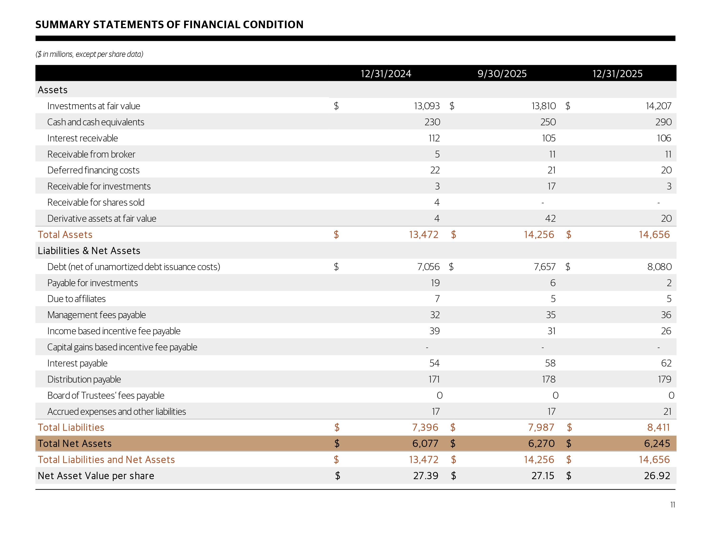 SUMMARY STATEMENTS OF FINANCIAL CONDITION ($ in millions, except per share data) 11 12/31/2024 9/30/2025 12/31/2025 Assets Investments at fair value 13,093$ 13,810$ 14,207$ Cash and cash equivalents 230 250 290 Interest receivable 112 105 106 Receivable from broker 5 11 11 Deferred financing costs 22 21 20 Receivable for investments 3 17 3 Receivable for shares sold 4 - - Derivative assets at fair value 4 42 20 Total Assets 13,472$ 14,256$ 14,656$ Liabilities & Net Assets Debt (net of unamortized debt issuance costs) 7,056$ 7,657$ 8,080$ Payable for investments 19 6 2 Due to affiliates 7 5 5 Management fees payable 32 35 36 Income based incentive fee payable 39 31 26 Capital gains based incentive fee payable - - - Interest payable 54 58 62 Distribution payable 171 178 179 Board of Trustees’ fees payable 0 0 0 Accrued expenses and other liabilities 17 17 21 Total Liabilities 7,396$ 7,987$ 8,411$ Total Net Assets 6,077$ 6,270$ 6,245$ Total Liabilities and Net Assets 13,472$ 14,256$ 14,656$ Net Asset Value per share 27.39$ 27.15$ 26.92$