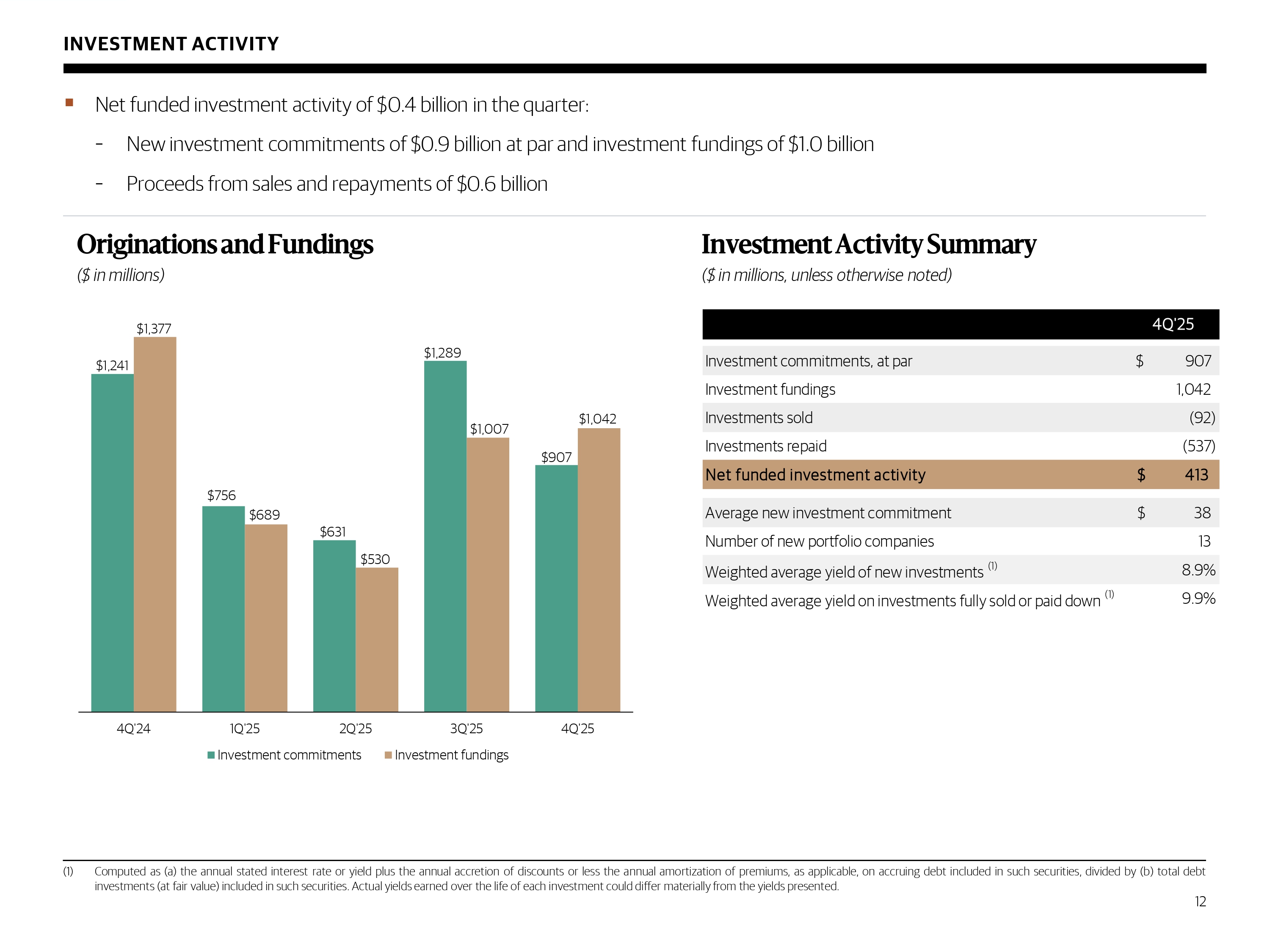 $1,241 $756 $631 $1,289 $907 $1,377 $689 $530 $1,007 $1,042 4Q'24 1Q'25 2Q'25 3Q'25 4Q'25 Investment commitments Investment fundings INVESTMENT ACTIVITY ▪ Net funded investment activity of $ 0.4 billion in the quarter: – New investment commitments of $ 0.9 billion at par and investment fundings of $ 1.0 billion – Proceeds from sales and repayments of $ 0.6 billion Originations and Fundings ($ in millions) Investment Activity Summary ($ in millions, unless otherwise noted) (1) Computed as (a) the annual stated interest rate or yield plus the annual accretion of discounts or less the annual amortization of premiums, as applicable, on accruing debt included in such securities, divided by (b) total debt investments (at fair value) included in such securities . Actual yields earned over the life of each investment could differ materially from the yields presented . 12 4Q'25 Investment commitments, at par 907$ Investment fundings 1,042 Investments sold (92) Investments repaid (537) Net funded investment activity 413$ Average new investment commitment 38$ Number of new portfolio companies 13 Weighted average yield of new investments (1) 8.9% Weighted average yield on investments fully sold or paid down (1) 9.9%