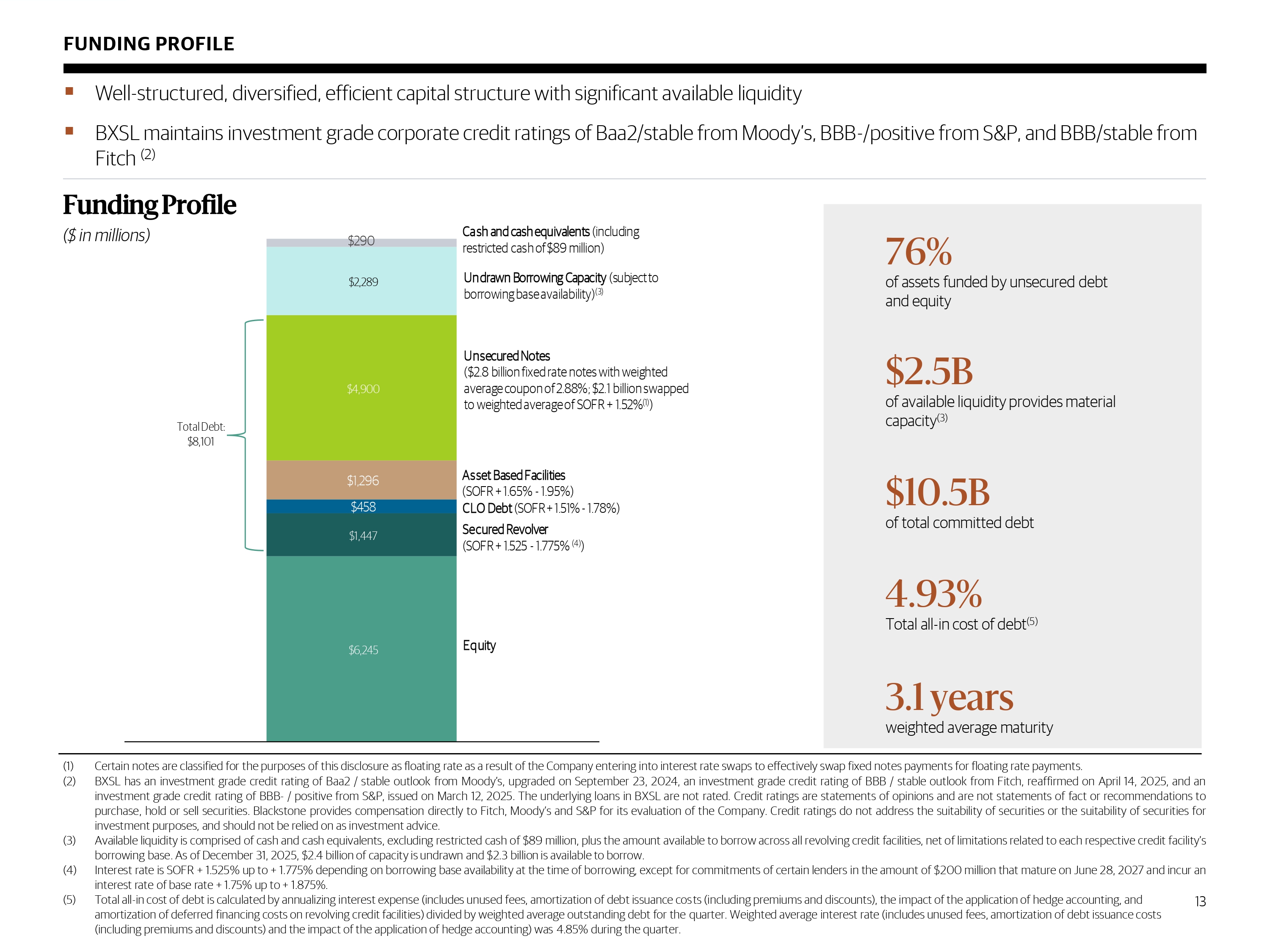$6,245 $1,447 $458 $1,296 $4,900 $2,289 $290 Total Debt: $8,101 Secured Revolver (SOFR + 1.525 - 1.775% (4 ) ) Equity Asset Based Facilities (SOFR + 1.65% - 1.95%) Unsecured Notes ($2.8 billion fixed rate notes with weighted average coupon of 2.88%; $2.1 billion swapped to weighted average of SOFR + 1.52% (1) ) Undrawn Borrowing Capacity (subject to borrowing base availability) (3) Cash and cash equivalents (including restricted cash of $89 million) CLO Debt (SOFR + 1.51% - 1.78%) (1) Certain notes are classified for the purposes of this disclosure as floating rate as a result of the Company entering into interest rate swaps to effectively swap fixed notes payments for floating rate payments . (2) BXSL has an investment grade credit rating of Baa 2 / stable outlook from Moody’s, upgraded on September 23 , 2024 , an investment grade credit rating of BBB / stable outlook from Fitch, reaffirmed on April 14 , 2025 , and an investment grade credit rating of BBB - / positive from S&P, issued on March 12 , 2025 . The underlying loans in BXSL are not rated . Credit ratings are statements of opinions and are not statements of fact or recommendations to purchase, hold or sell securities . Blackstone provides compensation directly to Fitch, Moody’s and S&P for its evaluation of the Company . Credit ratings do not address the suitability of securities or the suitability of securities for investment purposes, and should not be relied on as investment advice . (3) Available liquidity is comprised of cash and cash equivalents, excluding restricted cash of $ 89 million, plus the amount available to borrow across all revolving credit facilities, net of limitations related to each respective credit facility’s borrowing base . As of December 31 , 2025 , $ 2 . 4 billion of capacity is undrawn and $ 2 . 3 billion is available to borrow . (4) Interest rate is SOFR + 1 . 525 % up to + 1 . 775 % depending on borrowing base availability at the time of borrowing, except for commitments of certain lenders in the amount of $ 200 million that mature on June 28 , 2027 and incur an interest rate of base rate + 1 . 75 % up to + 1 . 875 % . (5) Total all - in cost of debt is calculated by annualizing interest expense (includes unused fees, amortization of debt issuance cos ts (including premiums and discounts), the impact of the application of hedge accounting, and amortization of deferred financing costs on revolving credit facilities) divided by weighted average outstanding debt for the qu arter. Weighted average interest rate (includes unused fees, amortization of debt issuance costs (including premiums and discounts) and the impact of the application of hedge accounting) was 4.85% during the quarter. FUNDING PROFILE 76% of assets funded by unsecured debt and equity 3.1 years weighted average maturity ▪ Well - structured, diversified, efficient capital structure with significant available liquidity ▪ BXSL maintains investment grade corporate credit ratings of Baa2/stable from Moody’s, BBB - /positive from S&P, and BBB/stable from Fitch (2) 4.93% Total all - in cost of debt (5) $ 2.5 B of available liquidity provides material capacity (3) $ 10.5 B of total committed debt 13 Funding Profile ($ in millions)