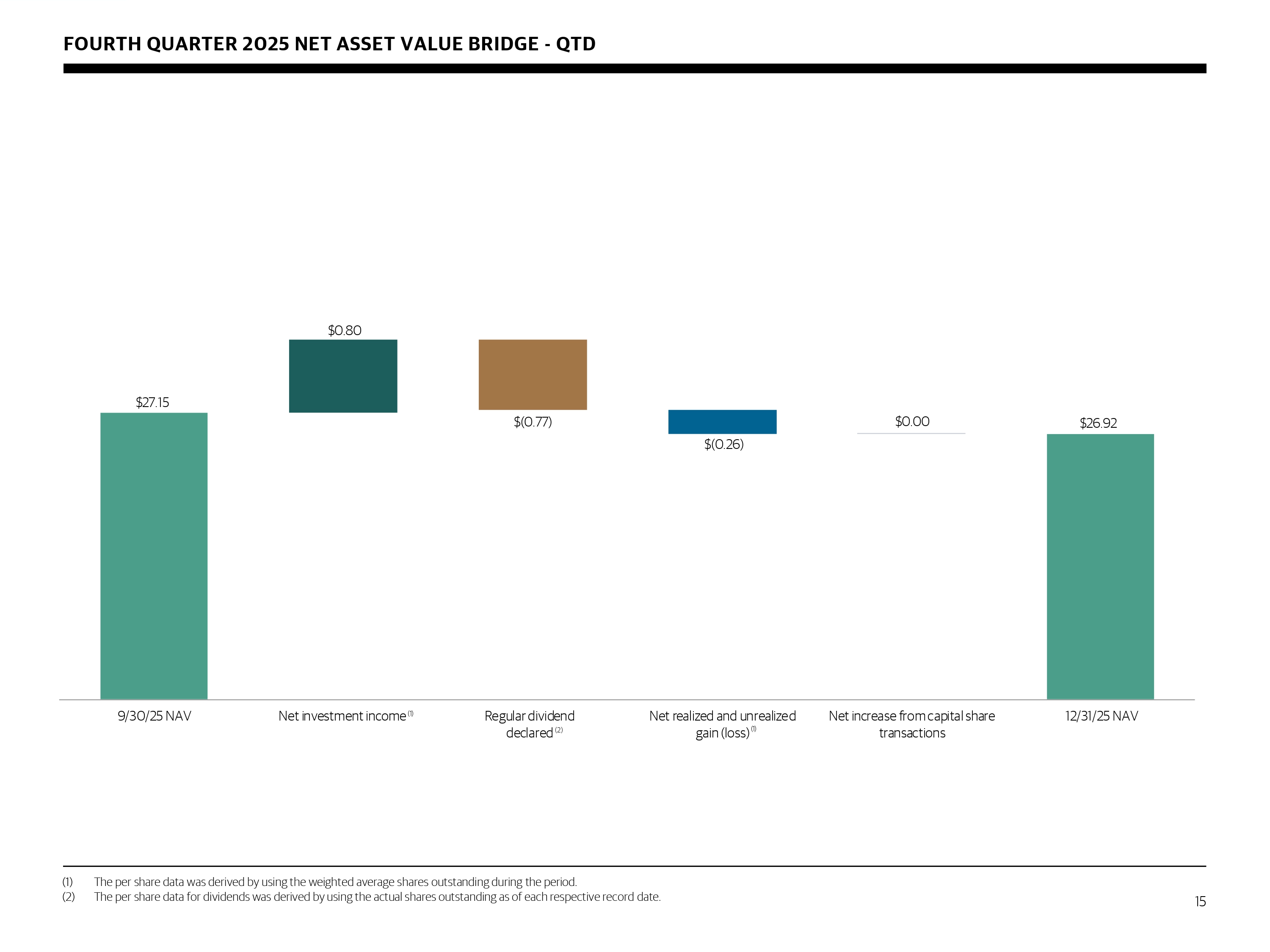 FOURTH QUARTER 2025 NET ASSET VALUE BRIDGE - QTD (1) The per share data was derived by using the weighted average shares outstanding during the period. (2) The per share data for dividends was derived by using the actual shares outstanding as of each respective record date. 15 $27.15 $26.92 $0.80 $(0.77) $(0.26) $0.00 9/30/25 NAV Net investment income Regular dividend declared Net realized and unrealized gain (loss) Net increase from capital share transactions 12/31/25 NAV (1) (2) (1)