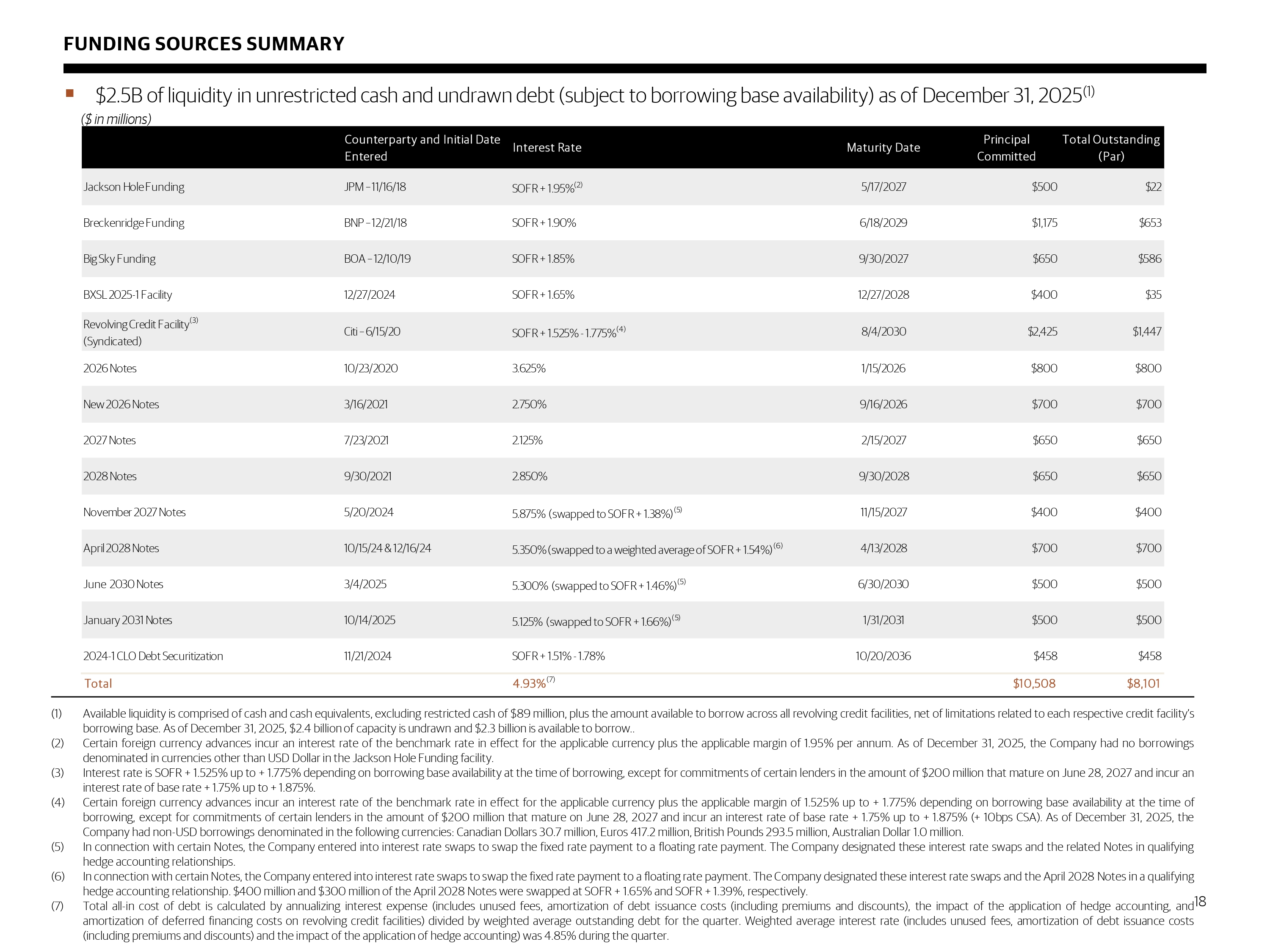 FUNDING SOURCES SUMMARY 18 ▪ $ 2.5 B of liquidity in unrestricted cash and undrawn debt (subject to borrowing base availability) as of December 31, 2025 (1) ($ in millions) (1) Available liquidity is comprised of cash and cash equivalents, excluding restricted cash of $ 89 million, plus the amount available to borrow across all revolving credit facilities, net of limitations related to each respective credit facility’s borrowing base . As of December 31 , 2025 , $ 2 . 4 billion of capacity is undrawn and $ 2 . 3 billion is available to borrow . . (2) Certain foreign currency advances incur an interest rate of the benchmark rate in effect for the applicable currency plus the applicable margin of 1 . 95 % per annum . As of December 31 , 2025 , the Company had no borrowings denominated in currencies other than USD Dollar in the Jackson Hole Funding facility . (3) Interest rate is SOFR + 1 . 525 % up to + 1 . 775 % depending on borrowing base availability at the time of borrowing, except for commitments of certain lenders in the amount of $ 200 million that mature on June 28 , 2027 and incur an interest rate of base rate + 1 . 75 % up to + 1 . 875 % . (4) Certain foreign currency advances incur an interest rate of the benchmark rate in effect for the applicable currency plus the applicable margin of 1 . 525 % up to + 1 . 775 % depending on borrowing base availability at the time of borrowing, except for commitments of certain lenders in the amount of $ 200 million that mature on June 28 , 2027 and incur an interest rate of base rate + 1 . 75 % up to + 1 . 875 % (+ 10 bps CSA) . As of December 31 , 2025 , the Company had non - USD borrowings denominated in the following currencies : Canadian Dollars 30 . 7 million, Euros 417 . 2 million, British Pounds 293 . 5 million, Australian Dollar 1 . 0 million . (5) In connection with certain Notes, the Company entered into interest rate swaps to swap the fixed rate payment to a floating rate payment . The Company designated these interest rate swaps and the related Notes in qualifying hedge accounting relationships . (6) In connection with certain Notes, the Company entered into interest rate swaps to swap the fixed rate payment to a floating rate payment . The Company designated these interest rate swaps and the April 2028 Notes in a qualifying hedge accounting relationship . $ 400 million and $ 300 million of the April 2028 Notes were swapped at SOFR + 1 . 65 % and SOFR + 1 . 39 % , respectively . (7) Total all - in cost of debt is calculated by annualizing interest expense (includes unused fees, amortization of debt issuance costs (including premiums and discounts), the impact of the application of hedge accounting, and amortization of deferred financing costs on revolving credit facilities) divided by weighted average outstanding debt for the quarter . Weighted average interest rate (includes unused fees, amortization of debt issuance costs (including premiums and discounts) and the impact of the application of hedge accounting) was 4 . 85 % during the quarter . Counterparty and Initial Date Entered Interest Rate Maturity Date Principal Committed Total Outstanding (Par) Jackson Hole Funding JPM – 11/16/18 SOFR + 1.95% (2) 5/17/2027 $500 $22 Breckenridge Funding BNP – 12/21/18 SOFR + 1.90% 6/18/2029 $1,175 $653 Big Sky Funding BOA – 12/10/19 SOFR + 1.85% 9/30/2027 $650 $586 BXSL 2025-1 Facility 12/27/2024 SOFR + 1.65% 12/27/2028 $400 $35 Revolving Credit Facility (3) (Syndicated) Citi – 6/15/20 SOFR + 1.525% - 1.775% (4) 8/4/2030 $2,425 $1,447 2026 Notes 10/23/2020 3.625% 1/15/2026 $800 $800 New 2026 Notes 3/16/2021 2.750% 9/16/2026 $700 $700 2027 Notes 7/23/2021 2.125% 2/15/2027 $650 $650 2028 Notes 9/30/2021 2.850% 9/30/2028 $650 $650 November 2027 Notes 5/20/2024 5.875% (swapped to SOFR + 1.38%) (5) 11/15/2027 $400 $400 April 2028 Notes 10/15/24 & 12/16/24 5.350% (swapped to a weighted average of SOFR + 1.54%) (6) 4/13/2028 $700 $700 June 2030 Notes 3/4/2025 5.300% (swapped to SOFR + 1.46%) (5) 6/30/2030 $500 $500 January 2031 Notes 10/14/2025 5.125% (swapped to SOFR + 1.66%) (5) 1/31/2031 $500 $500 2024-1 CLO Debt Securitization 11/21/2024 SOFR + 1.51% - 1.78% 10/20/2036 $458 $458 Total 4.93% $10,508 $8,101 (7)