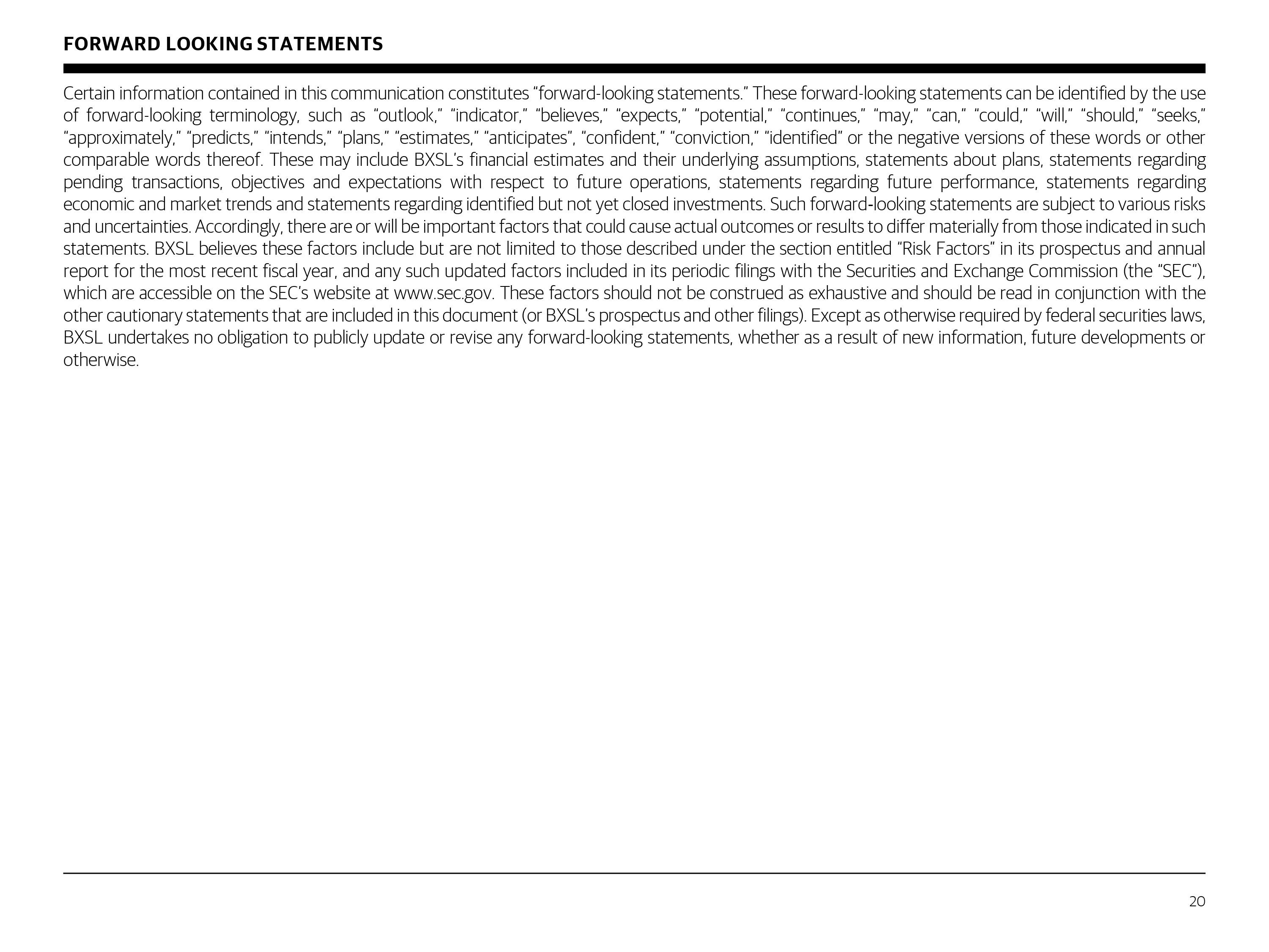 FORWARD LOOKING STATEMENTS Certain information contained in this communication constitutes “forward - looking statements . ” These forward - looking statements can be identified by the use of forward - looking terminology, such as “outlook,” “indicator,” “believes,” “expects,” “potential,” “continues,” “may,” “can,” “could,” “will,” “should,” “seeks,” “approximately,” “predicts,” “intends,” “plans,” “estimates,” “anticipates”, “confident,” “conviction,” “identified” or the negative versions of these words or other comparable words thereof . These may include BXSL’s financial estimates and their underlying assumptions, statements about plans, statements regarding pending transactions, objectives and expectations with respect to future operations, statements regarding future performance, statements regarding economic and market trends and statements regarding identified but not yet closed investments . Such forward-looking statements are subject to various risks and uncertainties . Accordingly, there are or will be important factors that could cause actual outcomes or results to differ materially from those indicated in such statements . BXSL believes these factors include but are not limited to those described under the section entitled “Risk Factors” in its prospectus and annual report for the most recent fiscal year, and any such updated factors included in its periodic filings with the Securities and Exchange Commission (the “SEC”), which are accessible on the SEC’s website at www . sec . gov . These factors should not be construed as exhaustive and should be read in conjunction with the other cautionary statements that are included in this document (or BXSL’s prospectus and other filings) . Except as otherwise required by federal securities laws, BXSL undertakes no obligation to publicly update or revise any forward - looking statements, whether as a result of new information, future developments or otherwise . 20
