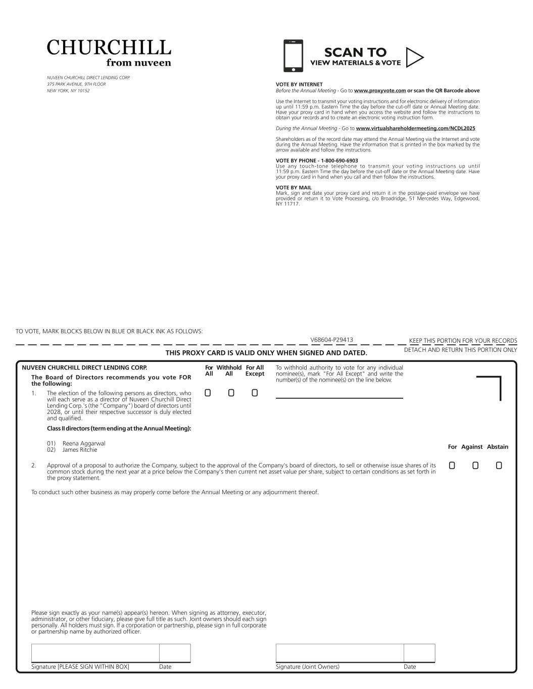 Signature [PLEASE SIGN WITHIN BOX] Date Signature (Joint Owners) Date TO VOTE, MARK BLOCKS BELOW IN BLUE OR BLACK INK AS FOLLOWS: KEEP THIS PORTION FOR YOUR RECORDS DETACH AND RETURN THIS PORTION ONLYTHIS PROXY CARD IS VALID ONLY WHEN SIGNED AND DATED. V68604-P29413 ! ! ! 01) Reena Aggarwal 02) James Ritchie For All Withhold All For All Except For Against Abstain To withhold authority to vote for any individual nominee(s), mark "For All Except" and write the number(s) of the nominee(s) on the line below. NUVEEN CHURCHILL DIRECT LENDING CORP. 375 PARK AVENUE, 9TH FLOOR NEW YORK, NY 10152 VOTE BY INTERNET Before the Annual Meeting - Go to www.proxyvote.com or scan the QR Barcode above Use the Internet to transmit your voting instructions and for electronic delivery of information up until 11:59 p.m. Eastern Time the day before the cut-off date or Annual Meeting date. Have your proxy card in hand when you access the website and follow the instructions to obtain your records and to create an electronic voting instruction form. During the Annual Meeting - Go to www.virtualshareholdermeeting.com/NCDL2025 Shareholders as of the record date may attend the Annual Meeting via the Internet and vote during the Annual Meeting. Have the information that is printed in the box marked by the arrow available and follow the instructions. VOTE BY PHONE - 1-800-690-6903 Use any touch-tone telephone to transmit your voting instructions up until 11:59 p.m. Eastern Time the day before the cut-off date or the Annual Meeting date. Have your proxy card in hand when you call and then follow the instructions. VOTE BY MAIL Mark, sign and date your proxy card and return it in the postage-paid envelope we have provided or return it to Vote Processing, c/o Broadridge, 51 Mercedes Way, Edgewood, NY 11717. Class II directors (term ending at the Annual Meeting): 1. The election of the following persons as directors, who will each serve as a director of Nuveen Churchill Direct Lending Corp.'s (the "Company") board of directors until 2028, or until their respective successor is duly elected and qualified. 2. Approval of a proposal to authorize the Company, subject to the approval of the Company's board of directors, to sell or otherwise issue shares of its common stock during the next year at a price below the Company's then current net asset value per share, subject to certain conditions as set forth in the proxy statement. NUVEEN CHURCHILL DIRECT LENDING CORP. The Board of Directors recommends you vote FOR the following: To conduct such other business as may properly come before the Annual Meeting or any adjournment thereof. Please sign exactly as your name(s) appear(s) hereon. When signing as attorney, executor, administrator, or other fiduciary, please give full title as such. Joint owners should each sign personally. All holders must sign. If a corporation or partnership, please sign in full corporate or partnership name by authorized officer. ! !! SCAN TO VIEW MATERIALS & VOTEw