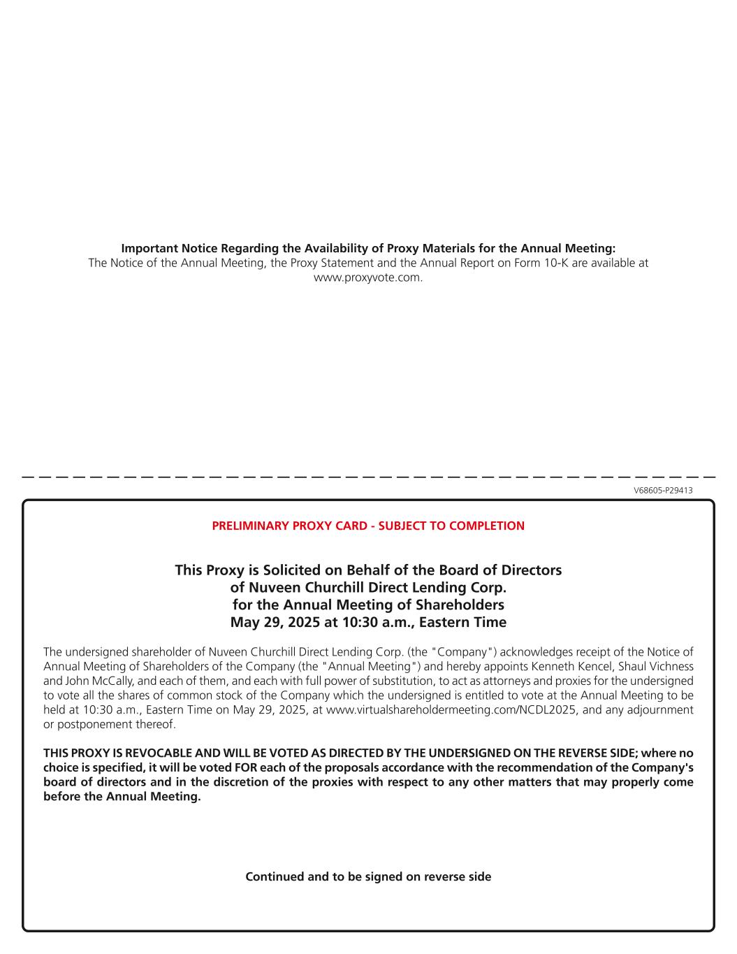V68605-P29413 Important Notice Regarding the Availability of Proxy Materials for the Annual Meeting: The Notice of the Annual Meeting, the Proxy Statement and the Annual Report on Form 10-K are available at www.proxyvote.com. This Proxy is Solicited on Behalf of the Board of Directors of Nuveen Churchill Direct Lending Corp. for the Annual Meeting of Shareholders May 29, 2025 at 10:30 a.m., Eastern Time The undersigned shareholder of Nuveen Churchill Direct Lending Corp. (the "Company") acknowledges receipt of the Notice of Annual Meeting of Shareholders of the Company (the "Annual Meeting") and hereby appoints Kenneth Kencel, Shaul Vichness and John McCally, and each of them, and each with full power of substitution, to act as attorneys and proxies for the undersigned to vote all the shares of common stock of the Company which the undersigned is entitled to vote at the Annual Meeting to be held at 10:30 a.m., Eastern Time on May 29, 2025, at www.virtualshareholdermeeting.com/NCDL2025, and any adjournment or postponement thereof. THIS PROXY IS REVOCABLE AND WILL BE VOTED AS DIRECTED BY THE UNDERSIGNED ON THE REVERSE SIDE; where no choice is specified, it will be voted FOR each of the proposals accordance with the recommendation of the Company's board of directors and in the discretion of the proxies with respect to any other matters that may properly come before the Annual Meeting. Continued and to be signed on reverse side PRELIMINARY PROXY CARD - SUBJECT TO COMPLETION