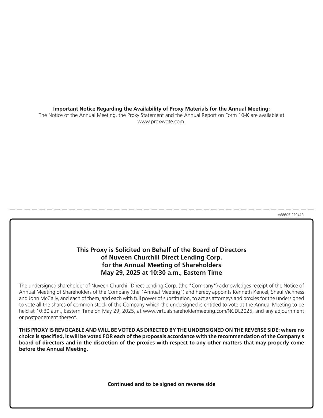 V68605-P29413 Important Notice Regarding the Availability of Proxy Materials for the Annual Meeting: The Notice of the Annual Meeting, the Proxy Statement and the Annual Report on Form 10-K are available at www.proxyvote.com. This Proxy is Solicited on Behalf of the Board of Directors of Nuveen Churchill Direct Lending Corp. for the Annual Meeting of Shareholders May 29, 2025 at 10:30 a.m., Eastern Time The undersigned shareholder of Nuveen Churchill Direct Lending Corp. (the "Company") acknowledges receipt of the Notice of Annual Meeting of Shareholders of the Company (the "Annual Meeting") and hereby appoints Kenneth Kencel, Shaul Vichness and John McCally, and each of them, and each with full power of substitution, to act as attorneys and proxies for the undersigned to vote all the shares of common stock of the Company which the undersigned is entitled to vote at the Annual Meeting to be held at 10:30 a.m., Eastern Time on May 29, 2025, at www.virtualshareholdermeeting.com/NCDL2025, and any adjournment or postponement thereof. THIS PROXY IS REVOCABLE AND WILL BE VOTED AS DIRECTED BY THE UNDERSIGNED ON THE REVERSE SIDE; where no choice is specified, it will be voted FOR each of the proposals accordance with the recommendation of the Company's board of directors and in the discretion of the proxies with respect to any other matters that may properly come before the Annual Meeting. Continued and to be signed on reverse side