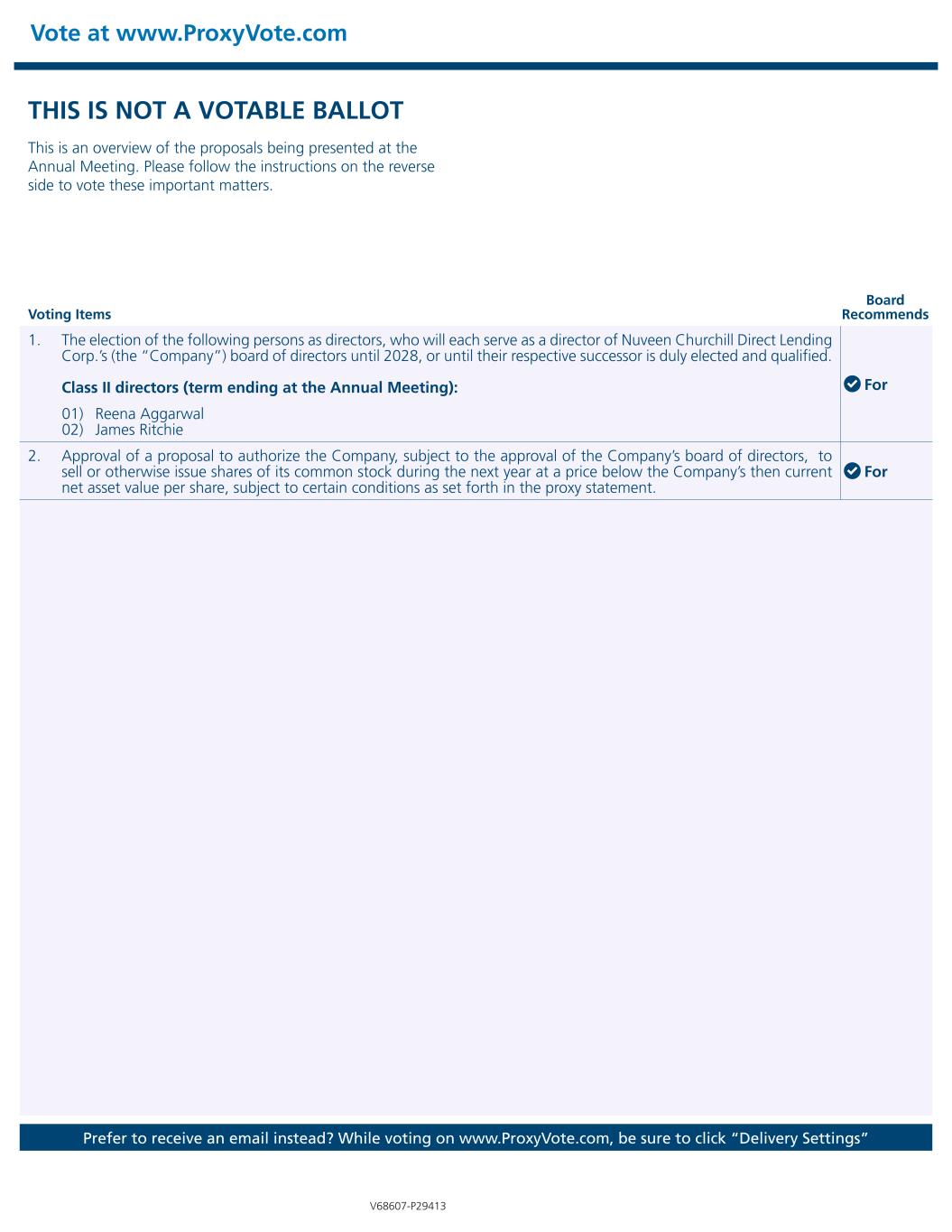 Vote at www.ProxyVote.com Prefer to receive an email instead? While voting on www.ProxyVote.com, be sure to click “Delivery Settings” Voting Items Board Recommends V68607-P29413 THIS IS NOT A VOTABLE BALLOT This is an overview of the proposals being presented at the Annual Meeting. Please follow the instructions on the reverse side to vote these important matters. 1. The election of the following persons as directors, who will each serve as a director of Nuveen Churchill Direct Lending Corp.’s (the “Company”) board of directors until 2028, or until their respective successor is duly elected and qualified. Class II directors (term ending at the Annual Meeting): For 01) Reena Aggarwal 02) James Ritchie 2. Approval of a proposal to authorize the Company, subject to the approval of the Company’s board of directors, to sell or otherwise issue shares of its common stock during the next year at a price below the Company’s then current net asset value per share, subject to certain conditions as set forth in the proxy statement. For