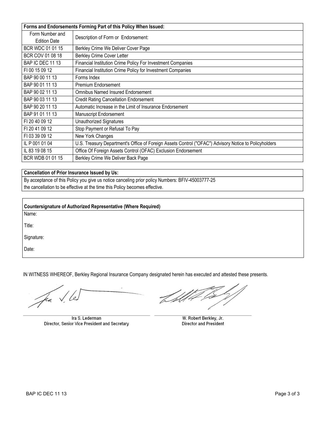 BAP IC DEC 11 13 Page 3 of 3 Forms and Endorsements Forming Part of this Policy When Issued: Form Number and Edition Date Description of Form or Endorsement: BCR WDC 01 01 15 Berkley Crime We Deliver Cover Page BCR COV 01 08 18 Berkley Crime Cover Letter BAP IC DEC 11 13 Financial Institution Crime Policy For Investment Companies FI 00 15 09 12 Financial Institution Crime Policy for Investment Companies BAP 90 00 11 13 Forms Index BAP 90 01 11 13 Premium Endorsement BAP 90 02 11 13 Omnibus Named Insured Endorsement BAP 90 03 11 13 Credit Rating Cancellation Endorsement BAP 90 20 11 13 Automatic Increase in the Limit of Insurance Endorsement BAP 91 01 11 13 Manuscript Endorsement FI 20 40 09 12 Unauthorized Signatures FI 20 41 09 12 Stop Payment or Refusal To Pay FI 03 39 09 12 New York Changes IL P 001 01 04 U.S. Treasury Department's Office of Foreign Assets Control ("OFAC") Advisory Notice to Policyholders IL 83 19 08 15 Office Of Foreign Assets Control (OFAC) Exclusion Endorsement BCR WDB 01 01 15 Berkley Crime We Deliver Back Page Cancellation of Prior Insurance Issued by Us: By acceptance of this Policy you give us notice canceling prior policy Numbers: BFIV-45003777-25 the cancellation to be effective at the time this Policy becomes effective. Countersignature of Authorized Representative (Where Required) Name: Title: Signature: Date: IN WITNESS WHEREOF, Berkley Regional Insurance Company designated herein has executed and attested these presents.
