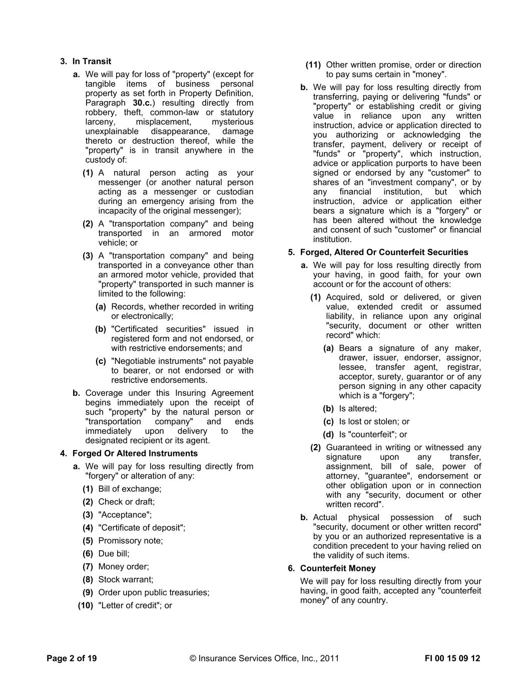 Page 2 of 19 © Insurance Services Office, Inc., 2011 FI 00 15 09 12 3. In Transit a. We will pay for loss of "property" (except for tangible items of business personal property as set forth in Property Definition, Paragraph 30.c.) resulting directly from robbery, theft, common-law or statutory larceny, misplacement, mysterious unexplainable disappearance, damage thereto or destruction thereof, while the "property" is in transit anywhere in the custody of: (1) A natural person acting as your messenger (or another natural person acting as a messenger or custodian during an emergency arising from the incapacity of the original messenger); (2) A "transportation company" and being transported in an armored motor vehicle; or (3) A "transportation company" and being transported in a conveyance other than an armored motor vehicle, provided that "property" transported in such manner is limited to the following: (a) Records, whether recorded in writing or electronically; (b) "Certificated securities" issued in registered form and not endorsed, or with restrictive endorsements; and (c) "Negotiable instruments" not payable to bearer, or not endorsed or with restrictive endorsements. b. Coverage under this Insuring Agreement begins immediately upon the receipt of such "property" by the natural person or "transportation company" and ends immediately upon delivery to the designated recipient or its agent. 4. Forged Or Altered Instruments a. We will pay for loss resulting directly from "forgery" or alteration of any: (1) Bill of exchange; (2) Check or draft; (3) "Acceptance"; (4) "Certificate of deposit"; (5) Promissory note; (6) Due bill; (7) Money order; (8) Stock warrant; (9) Order upon public treasuries; (10) "Letter of credit"; or (11) Other written promise, order or direction to pay sums certain in "money". b. We will pay for loss resulting directly from transferring, paying or delivering "funds" or "property" or establishing credit or giving value in reliance upon any written instruction, advice or application directed to you authorizing or acknowledging the transfer, payment, delivery or receipt of "funds" or "property", which instruction, advice or application purports to have been signed or endorsed by any "customer" to shares of an "investment company", or by any financial institution, but which instruction, advice or application either bears a signature which is a "forgery" or has been altered without the knowledge and consent of such "customer" or financial institution. 5. Forged, Altered Or Counterfeit Securities a. We will pay for loss resulting directly from your having, in good faith, for your own account or for the account of others: (1) Acquired, sold or delivered, or given value, extended credit or assumed liability, in reliance upon any original "security, document or other written record" which: (a) Bears a signature of any maker, drawer, issuer, endorser, assignor, lessee, transfer agent, registrar, acceptor, surety, guarantor or of any person signing in any other capacity which is a "forgery"; (b) Is altered; (c) Is lost or stolen; or (d) Is "counterfeit"; or (2) Guaranteed in writing or witnessed any signature upon any transfer, assignment, bill of sale, power of attorney, "guarantee", endorsement or other obligation upon or in connection with any "security, document or other written record". b. Actual physical possession of such "security, document or other written record" by you or an authorized representative is a condition precedent to your having relied on the validity of such items. 6. Counterfeit Money We will pay for loss resulting directly from your having, in good faith, accepted any "counterfeit money" of any country.