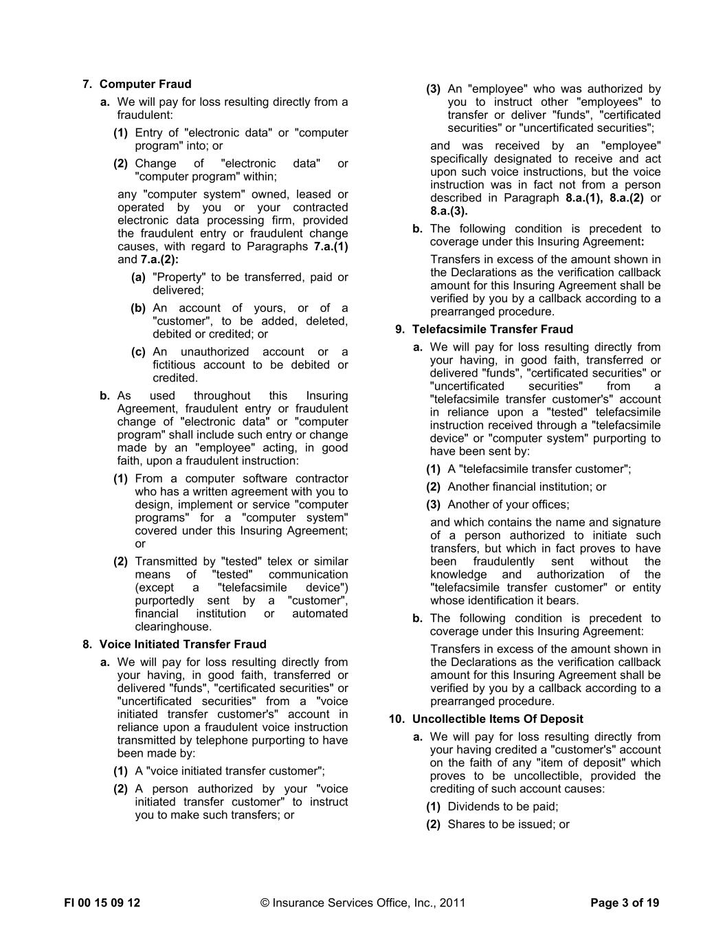 FI 00 15 09 12 © Insurance Services Office, Inc., 2011 Page 3 of 19 7. Computer Fraud a. We will pay for loss resulting directly from a fraudulent: (1) Entry of "electronic data" or "computer program" into; or (2) Change of "electronic data" or "computer program" within; any "computer system" owned, leased or operated by you or your contracted electronic data processing firm, provided the fraudulent entry or fraudulent change causes, with regard to Paragraphs 7.a.(1) and 7.a.(2): (a) "Property" to be transferred, paid or delivered; (b) An account of yours, or of a "customer", to be added, deleted, debited or credited; or (c) An unauthorized account or a fictitious account to be debited or credited. b. As used throughout this Insuring Agreement, fraudulent entry or fraudulent change of "electronic data" or "computer program" shall include such entry or change made by an "employee" acting, in good faith, upon a fraudulent instruction: (1) From a computer software contractor who has a written agreement with you to design, implement or service "computer programs" for a "computer system" covered under this Insuring Agreement; or (2) Transmitted by "tested" telex or similar means of "tested" communication (except a "telefacsimile device") purportedly sent by a "customer", financial institution or automated clearinghouse. 8. Voice Initiated Transfer Fraud a. We will pay for loss resulting directly from your having, in good faith, transferred or delivered "funds", "certificated securities" or "uncertificated securities" from a "voice initiated transfer customer's" account in reliance upon a fraudulent voice instruction transmitted by telephone purporting to have been made by: (1) A "voice initiated transfer customer"; (2) A person authorized by your "voice initiated transfer customer" to instruct you to make such transfers; or (3) An "employee" who was authorized by you to instruct other "employees" to transfer or deliver "funds", "certificated securities" or "uncertificated securities"; and was received by an "employee" specifically designated to receive and act upon such voice instructions, but the voice instruction was in fact not from a person described in Paragraph 8.a.(1), 8.a.(2) or 8.a.(3). b. The following condition is precedent to coverage under this Insuring Agreement: Transfers in excess of the amount shown in the Declarations as the verification callback amount for this Insuring Agreement shall be verified by you by a callback according to a prearranged procedure. 9. Telefacsimile Transfer Fraud a. We will pay for loss resulting directly from your having, in good faith, transferred or delivered "funds", "certificated securities" or "uncertificated securities" from a "telefacsimile transfer customer's" account in reliance upon a "tested" telefacsimile instruction received through a "telefacsimile device" or "computer system" purporting to have been sent by: (1) A "telefacsimile transfer customer"; (2) Another financial institution; or (3) Another of your offices; and which contains the name and signature of a person authorized to initiate such transfers, but which in fact proves to have been fraudulently sent without the knowledge and authorization of the "telefacsimile transfer customer" or entity whose identification it bears. b. The following condition is precedent to coverage under this Insuring Agreement: Transfers in excess of the amount shown in the Declarations as the verification callback amount for this Insuring Agreement shall be verified by you by a callback according to a prearranged procedure. 10. Uncollectible Items Of Deposit a. We will pay for loss resulting directly from your having credited a "customer's" account on the faith of any "item of deposit" which proves to be uncollectible, provided the crediting of such account causes: (1) Dividends to be paid; (2) Shares to be issued; or