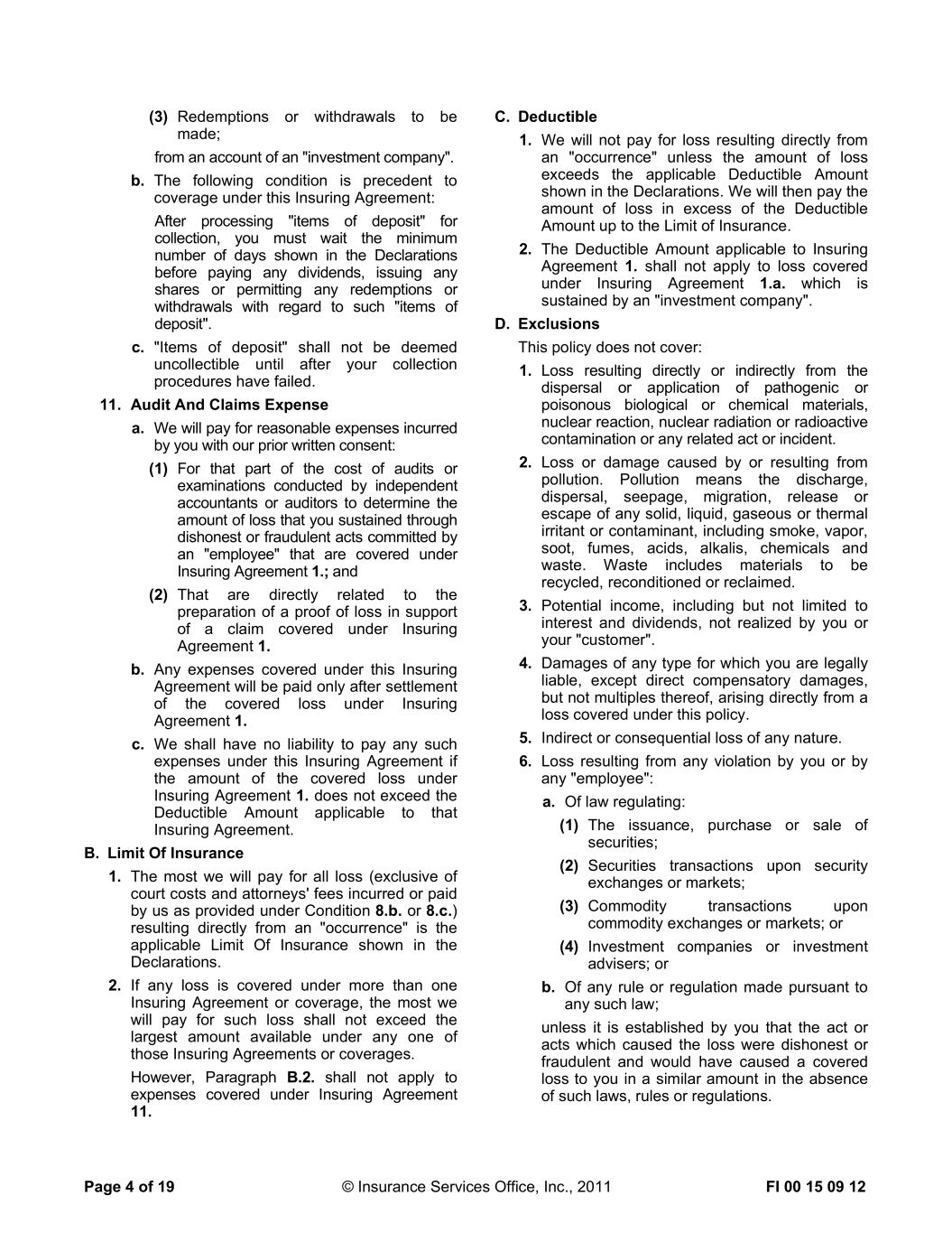 Page 4 of 19 © Insurance Services Office, Inc., 2011 FI 00 15 09 12 (3) Redemptions or withdrawals to be made; from an account of an "investment company". b. The following condition is precedent to coverage under this Insuring Agreement: After processing "items of deposit" for collection, you must wait the minimum number of days shown in the Declarations before paying any dividends, issuing any shares or permitting any redemptions or withdrawals with regard to such "items of deposit". c. "Items of deposit" shall not be deemed uncollectible until after your collection procedures have failed. 11. Audit And Claims Expense a. We will pay for reasonable expenses incurred by you with our prior written consent: (1) For that part of the cost of audits or examinations conducted by independent accountants or auditors to determine the amount of loss that you sustained through dishonest or fraudulent acts committed by an "employee" that are covered under Insuring Agreement 1.; and (2) That are directly related to the preparation of a proof of loss in support of a claim covered under Insuring Agreement 1. b. Any expenses covered under this Insuring Agreement will be paid only after settlement of the covered loss under Insuring Agreement 1. c. We shall have no liability to pay any such expenses under this Insuring Agreement if the amount of the covered loss under Insuring Agreement 1. does not exceed the Deductible Amount applicable to that Insuring Agreement. B. Limit Of Insurance 1. The most we will pay for all loss (exclusive of court costs and attorneys' fees incurred or paid by us as provided under Condition 8.b. or 8.c.) resulting directly from an "occurrence" is the applicable Limit Of Insurance shown in the Declarations. 2. If any loss is covered under more than one Insuring Agreement or coverage, the most we will pay for such loss shall not exceed the largest amount available under any one of those Insuring Agreements or coverages. However, Paragraph B.2. shall not apply to expenses covered under Insuring Agreement 11. C. Deductible 1. We will not pay for loss resulting directly from an "occurrence" unless the amount of loss exceeds the applicable Deductible Amount shown in the Declarations. We will then pay the amount of loss in excess of the Deductible Amount up to the Limit of Insurance. 2. The Deductible Amount applicable to Insuring Agreement 1. shall not apply to loss covered under Insuring Agreement 1.a. which is sustained by an "investment company". D. Exclusions This policy does not cover: 1. Loss resulting directly or indirectly from the dispersal or application of pathogenic or poisonous biological or chemical materials, nuclear reaction, nuclear radiation or radioactive contamination or any related act or incident. 2. Loss or damage caused by or resulting from pollution. Pollution means the discharge, dispersal, seepage, migration, release or escape of any solid, liquid, gaseous or thermal irritant or contaminant, including smoke, vapor, soot, fumes, acids, alkalis, chemicals and waste. Waste includes materials to be recycled, reconditioned or reclaimed. 3. Potential income, including but not limited to interest and dividends, not realized by you or your "customer". 4. Damages of any type for which you are legally liable, except direct compensatory damages, but not multiples thereof, arising directly from a loss covered under this policy. 5. Indirect or consequential loss of any nature. 6. Loss resulting from any violation by you or by any "employee": a. Of law regulating: (1) The issuance, purchase or sale of securities; (2) Securities transactions upon security exchanges or markets; (3) Commodity transactions upon commodity exchanges or markets; or (4) Investment companies or investment advisers; or b. Of any rule or regulation made pursuant to any such law; unless it is established by you that the act or acts which caused the loss were dishonest or fraudulent and would have caused a covered loss to you in a similar amount in the absence of such laws, rules or regulations.