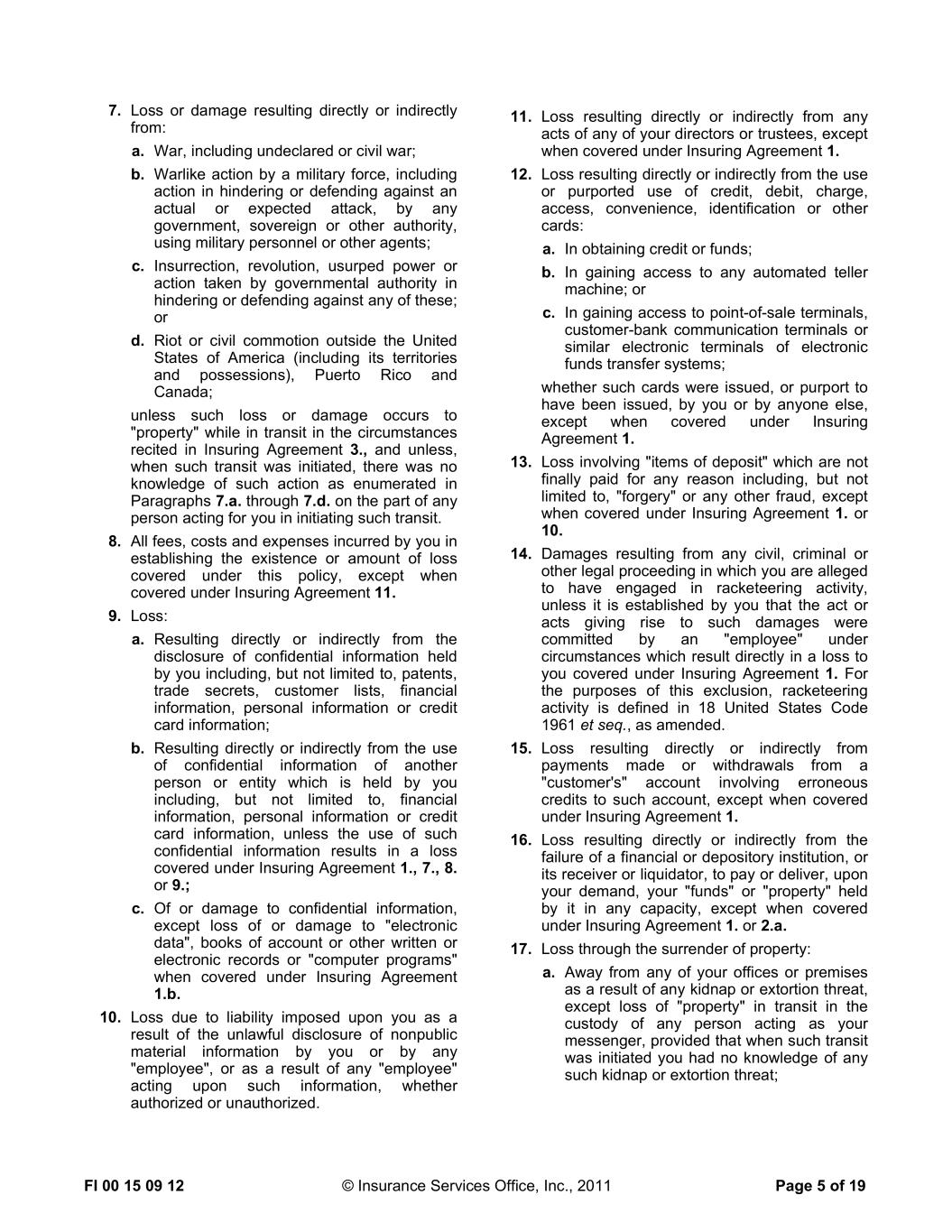 FI 00 15 09 12 © Insurance Services Office, Inc., 2011 Page 5 of 19 7. Loss or damage resulting directly or indirectly from: a. War, including undeclared or civil war; b. Warlike action by a military force, including action in hindering or defending against an actual or expected attack, by any government, sovereign or other authority, using military personnel or other agents; c. Insurrection, revolution, usurped power or action taken by governmental authority in hindering or defending against any of these; or d. Riot or civil commotion outside the United States of America (including its territories and possessions), Puerto Rico and Canada; unless such loss or damage occurs to "property" while in transit in the circumstances recited in Insuring Agreement 3., and unless, when such transit was initiated, there was no knowledge of such action as enumerated in Paragraphs 7.a. through 7.d. on the part of any person acting for you in initiating such transit. 8. All fees, costs and expenses incurred by you in establishing the existence or amount of loss covered under this policy, except when covered under Insuring Agreement 11. 9. Loss: a. Resulting directly or indirectly from the disclosure of confidential information held by you including, but not limited to, patents, trade secrets, customer lists, financial information, personal information or credit card information; b. Resulting directly or indirectly from the use of confidential information of another person or entity which is held by you including, but not limited to, financial information, personal information or credit card information, unless the use of such confidential information results in a loss covered under Insuring Agreement 1., 7., 8. or 9.; c. Of or damage to confidential information, except loss of or damage to "electronic data", books of account or other written or electronic records or "computer programs" when covered under Insuring Agreement 1.b. 10. Loss due to liability imposed upon you as a result of the unlawful disclosure of nonpublic material information by you or by any "employee", or as a result of any "employee" acting upon such information, whether authorized or unauthorized. 11. Loss resulting directly or indirectly from any acts of any of your directors or trustees, except when covered under Insuring Agreement 1. 12. Loss resulting directly or indirectly from the use or purported use of credit, debit, charge, access, convenience, identification or other cards: a. In obtaining credit or funds; b. In gaining access to any automated teller machine; or c. In gaining access to point-of-sale terminals, customer-bank communication terminals or similar electronic terminals of electronic funds transfer systems; whether such cards were issued, or purport to have been issued, by you or by anyone else, except when covered under Insuring Agreement 1. 13. Loss involving "items of deposit" which are not finally paid for any reason including, but not limited to, "forgery" or any other fraud, except when covered under Insuring Agreement 1. or 10. 14. Damages resulting from any civil, criminal or other legal proceeding in which you are alleged to have engaged in racketeering activity, unless it is established by you that the act or acts giving rise to such damages were committed by an "employee" under circumstances which result directly in a loss to you covered under Insuring Agreement 1. For the purposes of this exclusion, racketeering activity is defined in 18 United States Code 1961 et seq., as amended. 15. Loss resulting directly or indirectly from payments made or withdrawals from a "customer's" account involving erroneous credits to such account, except when covered under Insuring Agreement 1. 16. Loss resulting directly or indirectly from the failure of a financial or depository institution, or its receiver or liquidator, to pay or deliver, upon your demand, your "funds" or "property" held by it in any capacity, except when covered under Insuring Agreement 1. or 2.a. 17. Loss through the surrender of property: a. Away from any of your offices or premises as a result of any kidnap or extortion threat, except loss of "property" in transit in the custody of any person acting as your messenger, provided that when such transit was initiated you had no knowledge of any such kidnap or extortion threat;