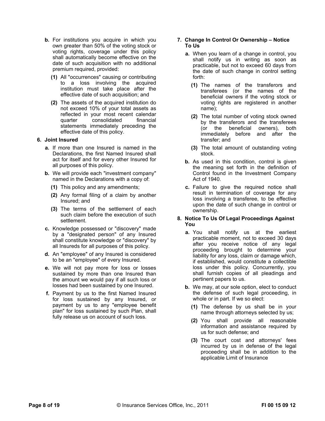 Page 8 of 19 © Insurance Services Office, Inc., 2011 FI 00 15 09 12 b. For institutions you acquire in which you own greater than 50% of the voting stock or voting rights, coverage under this policy shall automatically become effective on the date of such acquisition with no additional premium required, provided: (1) All "occurrences" causing or contributing to a loss involving the acquired institution must take place after the effective date of such acquisition; and (2) The assets of the acquired institution do not exceed 10% of your total assets as reflected in your most recent calendar quarter consolidated financial statements immediately preceding the effective date of this policy. 6. Joint Insured a. If more than one Insured is named in the Declarations, the first Named Insured shall act for itself and for every other Insured for all purposes of this policy. b. We will provide each "investment company" named in the Declarations with a copy of: (1) This policy and any amendments; (2) Any formal filing of a claim by another Insured; and (3) The terms of the settlement of each such claim before the execution of such settlement. c. Knowledge possessed or "discovery" made by a "designated person" of any Insured shall constitute knowledge or "discovery" by all Insureds for all purposes of this policy. d. An "employee" of any Insured is considered to be an "employee" of every Insured. e. We will not pay more for loss or losses sustained by more than one Insured than the amount we would pay if all such loss or losses had been sustained by one Insured. f. Payment by us to the first Named Insured for loss sustained by any Insured, or payment by us to any "employee benefit plan" for loss sustained by such Plan, shall fully release us on account of such loss. 7. Change In Control Or Ownership – Notice To Us a. When you learn of a change in control, you shall notify us in writing as soon as practicable, but not to exceed 60 days from the date of such change in control setting forth: (1) The names of the transferors and transferees (or the names of the beneficial owners if the voting stock or voting rights are registered in another name); (2) The total number of voting stock owned by the transferors and the transferees (or the beneficial owners), both immediately before and after the transfer; and (3) The total amount of outstanding voting stock. b. As used in this condition, control is given the meaning set forth in the definition of Control found in the Investment Company Act of 1940. c. Failure to give the required notice shall result in termination of coverage for any loss involving a transferee, to be effective upon the date of such change in control or ownership. 8. Notice To Us Of Legal Proceedings Against You a. You shall notify us at the earliest practicable moment, not to exceed 30 days after you receive notice of any legal proceeding brought to determine your liability for any loss, claim or damage which, if established, would constitute a collectible loss under this policy. Concurrently, you shall furnish copies of all pleadings and pertinent papers to us. b. We may, at our sole option, elect to conduct the defense of such legal proceeding, in whole or in part. If we so elect: (1) The defense by us shall be in your name through attorneys selected by us; (2) You shall provide all reasonable information and assistance required by us for such defense; and (3) The court cost and attorneys' fees incurred by us in defense of the legal proceeding shall be in addition to the applicable Limit of Insurance