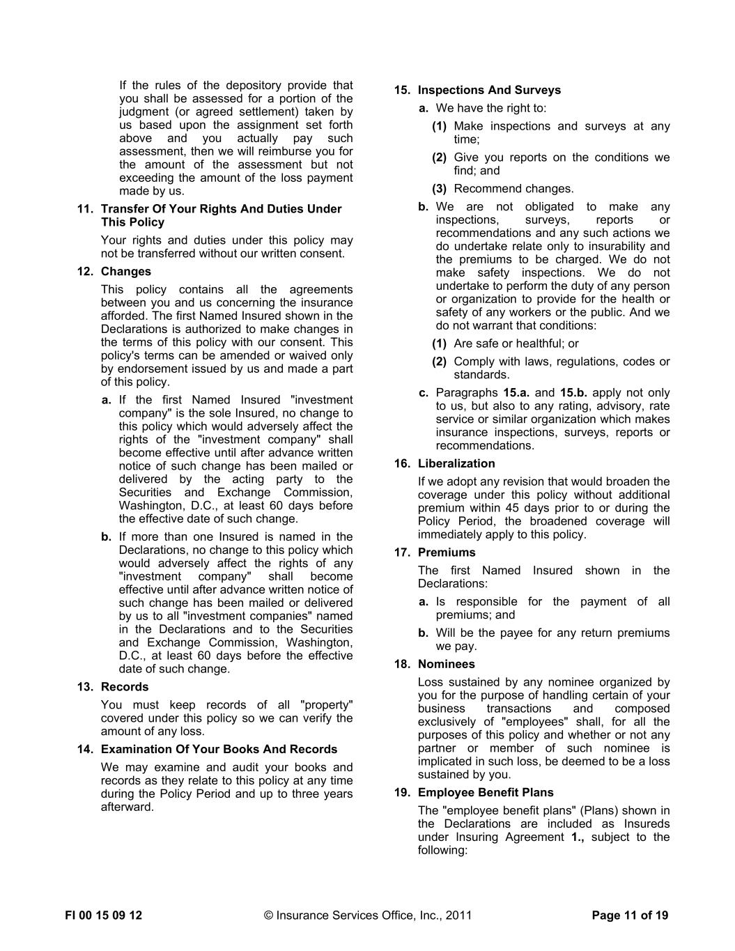 FI 00 15 09 12 © Insurance Services Office, Inc., 2011 Page 11 of 19 If the rules of the depository provide that you shall be assessed for a portion of the judgment (or agreed settlement) taken by us based upon the assignment set forth above and you actually pay such assessment, then we will reimburse you for the amount of the assessment but not exceeding the amount of the loss payment made by us. 11. Transfer Of Your Rights And Duties Under This Policy Your rights and duties under this policy may not be transferred without our written consent. 12. Changes This policy contains all the agreements between you and us concerning the insurance afforded. The first Named Insured shown in the Declarations is authorized to make changes in the terms of this policy with our consent. This policy's terms can be amended or waived only by endorsement issued by us and made a part of this policy. a. If the first Named Insured "investment company" is the sole Insured, no change to this policy which would adversely affect the rights of the "investment company" shall become effective until after advance written notice of such change has been mailed or delivered by the acting party to the Securities and Exchange Commission, Washington, D.C., at least 60 days before the effective date of such change. b. If more than one Insured is named in the Declarations, no change to this policy which would adversely affect the rights of any "investment company" shall become effective until after advance written notice of such change has been mailed or delivered by us to all "investment companies" named in the Declarations and to the Securities and Exchange Commission, Washington, D.C., at least 60 days before the effective date of such change. 13. Records You must keep records of all "property" covered under this policy so we can verify the amount of any loss. 14. Examination Of Your Books And Records We may examine and audit your books and records as they relate to this policy at any time during the Policy Period and up to three years afterward. 15. Inspections And Surveys a. We have the right to: (1) Make inspections and surveys at any time; (2) Give you reports on the conditions we find; and (3) Recommend changes. b. We are not obligated to make any inspections, surveys, reports or recommendations and any such actions we do undertake relate only to insurability and the premiums to be charged. We do not make safety inspections. We do not undertake to perform the duty of any person or organization to provide for the health or safety of any workers or the public. And we do not warrant that conditions: (1) Are safe or healthful; or (2) Comply with laws, regulations, codes or standards. c. Paragraphs 15.a. and 15.b. apply not only to us, but also to any rating, advisory, rate service or similar organization which makes insurance inspections, surveys, reports or recommendations. 16. Liberalization If we adopt any revision that would broaden the coverage under this policy without additional premium within 45 days prior to or during the Policy Period, the broadened coverage will immediately apply to this policy. 17. Premiums The first Named Insured shown in the Declarations: a. Is responsible for the payment of all premiums; and b. Will be the payee for any return premiums we pay. 18. Nominees Loss sustained by any nominee organized by you for the purpose of handling certain of your business transactions and composed exclusively of "employees" shall, for all the purposes of this policy and whether or not any partner or member of such nominee is implicated in such loss, be deemed to be a loss sustained by you. 19. Employee Benefit Plans The "employee benefit plans" (Plans) shown in the Declarations are included as Insureds under Insuring Agreement 1., subject to the following: