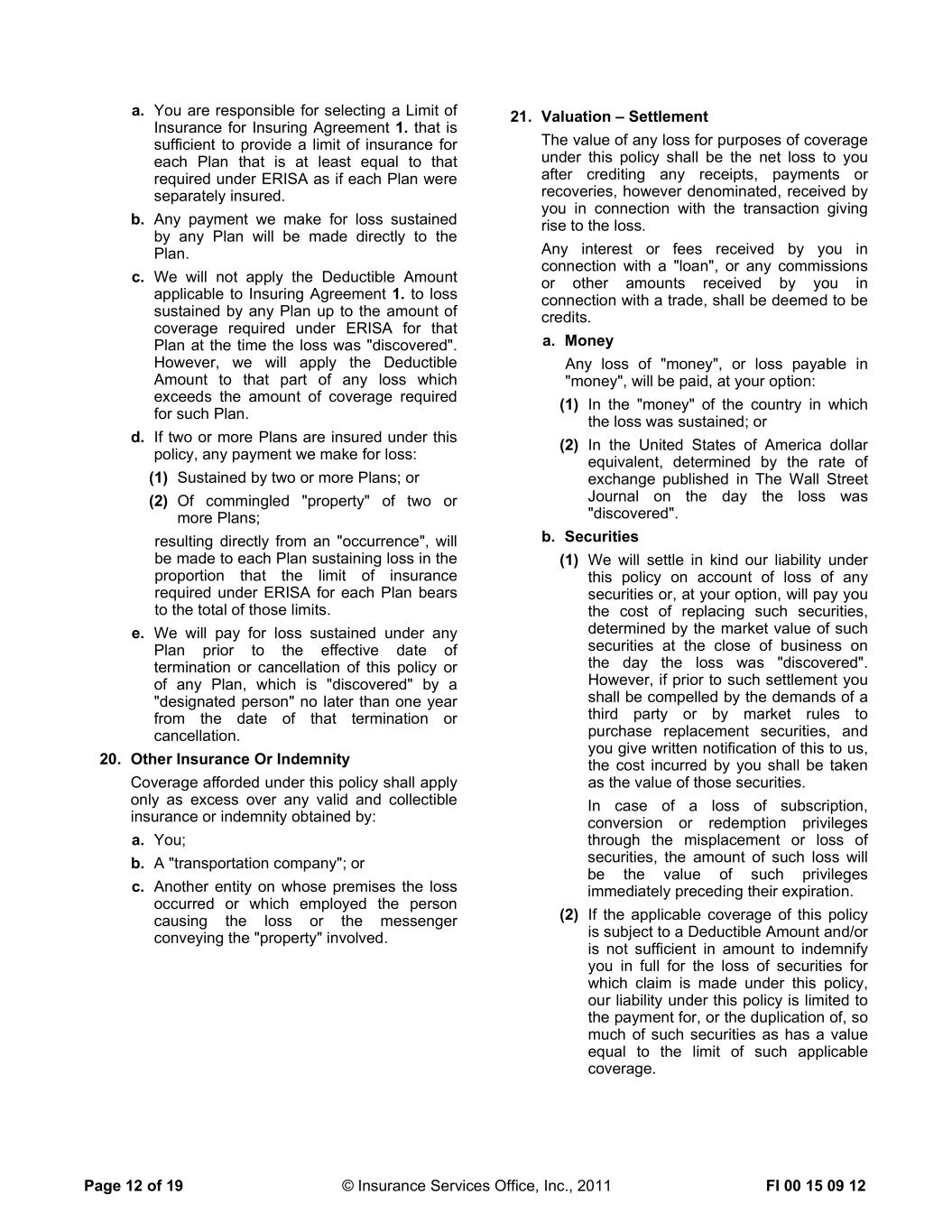 Page 12 of 19 © Insurance Services Office, Inc., 2011 FI 00 15 09 12 a. You are responsible for selecting a Limit of Insurance for Insuring Agreement 1. that is sufficient to provide a limit of insurance for each Plan that is at least equal to that required under ERISA as if each Plan were separately insured. b. Any payment we make for loss sustained by any Plan will be made directly to the Plan. c. We will not apply the Deductible Amount applicable to Insuring Agreement 1. to loss sustained by any Plan up to the amount of coverage required under ERISA for that Plan at the time the loss was "discovered". However, we will apply the Deductible Amount to that part of any loss which exceeds the amount of coverage required for such Plan. d. If two or more Plans are insured under this policy, any payment we make for loss: (1) Sustained by two or more Plans; or (2) Of commingled "property" of two or more Plans; resulting directly from an "occurrence", will be made to each Plan sustaining loss in the proportion that the limit of insurance required under ERISA for each Plan bears to the total of those limits. e. We will pay for loss sustained under any Plan prior to the effective date of termination or cancellation of this policy or of any Plan, which is "discovered" by a "designated person" no later than one year from the date of that termination or cancellation. 20. Other Insurance Or Indemnity Coverage afforded under this policy shall apply only as excess over any valid and collectible insurance or indemnity obtained by: a. You; b. A "transportation company"; or c. Another entity on whose premises the loss occurred or which employed the person causing the loss or the messenger conveying the "property" involved. 21. Valuation – Settlement The value of any loss for purposes of coverage under this policy shall be the net loss to you after crediting any receipts, payments or recoveries, however denominated, received by you in connection with the transaction giving rise to the loss. Any interest or fees received by you in connection with a "loan", or any commissions or other amounts received by you in connection with a trade, shall be deemed to be credits. a. Money Any loss of "money", or loss payable in "money", will be paid, at your option: (1) In the "money" of the country in which the loss was sustained; or (2) In the United States of America dollar equivalent, determined by the rate of exchange published in The Wall Street Journal on the day the loss was "discovered". b. Securities (1) We will settle in kind our liability under this policy on account of loss of any securities or, at your option, will pay you the cost of replacing such securities, determined by the market value of such securities at the close of business on the day the loss was "discovered". However, if prior to such settlement you shall be compelled by the demands of a third party or by market rules to purchase replacement securities, and you give written notification of this to us, the cost incurred by you shall be taken as the value of those securities. In case of a loss of subscription, conversion or redemption privileges through the misplacement or loss of securities, the amount of such loss will be the value of such privileges immediately preceding their expiration. (2) If the applicable coverage of this policy is subject to a Deductible Amount and/or is not sufficient in amount to indemnify you in full for the loss of securities for which claim is made under this policy, our liability under this policy is limited to the payment for, or the duplication of, so much of such securities as has a value equal to the limit of such applicable coverage.