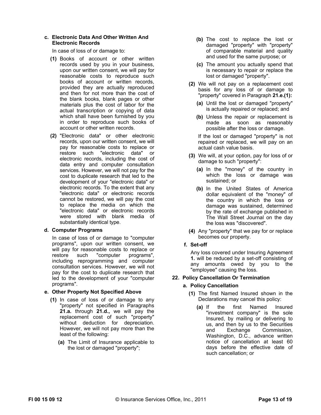 FI 00 15 09 12 © Insurance Services Office, Inc., 2011 Page 13 of 19 c. Electronic Data And Other Written And Electronic Records In case of loss of or damage to: (1) Books of account or other written records used by you in your business, upon our written consent, we will pay for reasonable costs to reproduce such books of account or written records, provided they are actually reproduced and then for not more than the cost of the blank books, blank pages or other materials plus the cost of labor for the actual transcription or copying of data which shall have been furnished by you in order to reproduce such books of account or other written records. (2) "Electronic data" or other electronic records, upon our written consent, we will pay for reasonable costs to replace or restore such "electronic data" or electronic records, including the cost of data entry and computer consultation services. However, we will not pay for the cost to duplicate research that led to the development of your "electronic data" or electronic records. To the extent that any "electronic data" or electronic records cannot be restored, we will pay the cost to replace the media on which the "electronic data" or electronic records were stored with blank media of substantially identical type. d. Computer Programs In case of loss of or damage to "computer programs", upon our written consent, we will pay for reasonable costs to replace or restore such "computer programs", including reprogramming and computer consultation services. However, we will not pay for the cost to duplicate research that led to the development of your "computer programs". e. Other Property Not Specified Above (1) In case of loss of or damage to any "property" not specified in Paragraphs 21.a. through 21.d., we will pay the replacement cost of such "property" without deduction for depreciation. However, we will not pay more than the least of the following: (a) The Limit of Insurance applicable to the lost or damaged "property"; (b) The cost to replace the lost or damaged "property" with "property" of comparable material and quality and used for the same purpose; or (c) The amount you actually spend that is necessary to repair or replace the lost or damaged "property". (2) We will not pay on a replacement cost basis for any loss of or damage to "property" covered in Paragraph 21.e.(1): (a) Until the lost or damaged "property" is actually repaired or replaced; and (b) Unless the repair or replacement is made as soon as reasonably possible after the loss or damage. If the lost or damaged "property" is not repaired or replaced, we will pay on an actual cash value basis. (3) We will, at your option, pay for loss of or damage to such "property": (a) In the "money" of the country in which the loss or damage was sustained; or (b) In the United States of America dollar equivalent of the "money" of the country in which the loss or damage was sustained, determined by the rate of exchange published in The Wall Street Journal on the day the loss was "discovered". (4) Any "property" that we pay for or replace becomes our property. f. Set-off Any loss covered under Insuring Agreement 1. will be reduced by a set-off consisting of any amounts owed by you to the "employee" causing the loss. 22. Policy Cancellation Or Termination a. Policy Cancellation (1) The first Named Insured shown in the Declarations may cancel this policy: (a) If the first Named Insured "investment company" is the sole Insured, by mailing or delivering to us, and then by us to the Securities and Exchange Commission, Washington, D.C., advance written notice of cancellation at least 60 days before the effective date of such cancellation; or