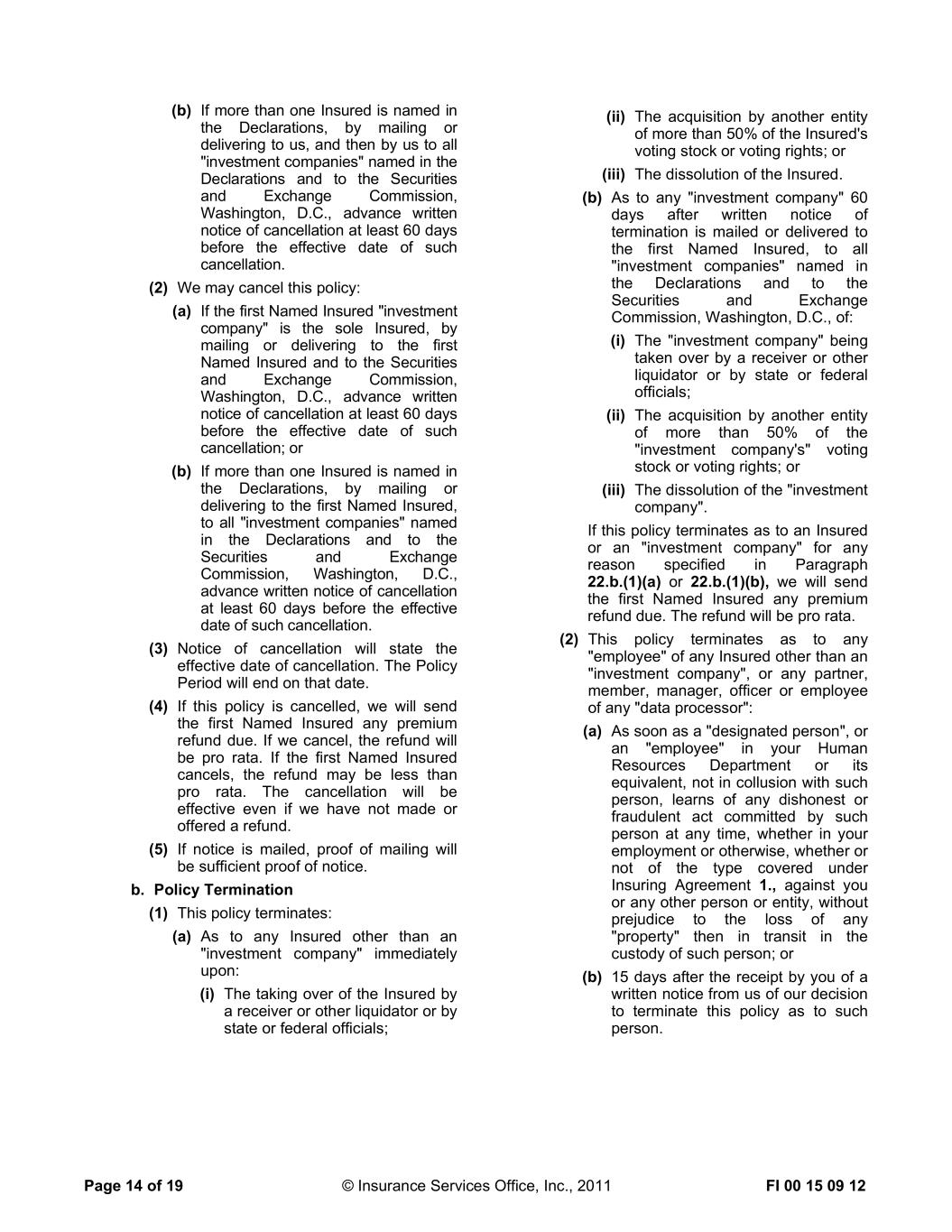 Page 14 of 19 © Insurance Services Office, Inc., 2011 FI 00 15 09 12 (b) If more than one Insured is named in the Declarations, by mailing or delivering to us, and then by us to all "investment companies" named in the Declarations and to the Securities and Exchange Commission, Washington, D.C., advance written notice of cancellation at least 60 days before the effective date of such cancellation. (2) We may cancel this policy: (a) If the first Named Insured "investment company" is the sole Insured, by mailing or delivering to the first Named Insured and to the Securities and Exchange Commission, Washington, D.C., advance written notice of cancellation at least 60 days before the effective date of such cancellation; or (b) If more than one Insured is named in the Declarations, by mailing or delivering to the first Named Insured, to all "investment companies" named in the Declarations and to the Securities and Exchange Commission, Washington, D.C., advance written notice of cancellation at least 60 days before the effective date of such cancellation. (3) Notice of cancellation will state the effective date of cancellation. The Policy Period will end on that date. (4) If this policy is cancelled, we will send the first Named Insured any premium refund due. If we cancel, the refund will be pro rata. If the first Named Insured cancels, the refund may be less than pro rata. The cancellation will be effective even if we have not made or offered a refund. (5) If notice is mailed, proof of mailing will be sufficient proof of notice. b. Policy Termination (1) This policy terminates: (a) As to any Insured other than an "investment company" immediately upon: (i) The taking over of the Insured by a receiver or other liquidator or by state or federal officials; (ii) The acquisition by another entity of more than 50% of the Insured's voting stock or voting rights; or (iii) The dissolution of the Insured. (b) As to any "investment company" 60 days after written notice of termination is mailed or delivered to the first Named Insured, to all "investment companies" named in the Declarations and to the Securities and Exchange Commission, Washington, D.C., of: (i) The "investment company" being taken over by a receiver or other liquidator or by state or federal officials; (ii) The acquisition by another entity of more than 50% of the "investment company's" voting stock or voting rights; or (iii) The dissolution of the "investment company". If this policy terminates as to an Insured or an "investment company" for any reason specified in Paragraph 22.b.(1)(a) or 22.b.(1)(b), we will send the first Named Insured any premium refund due. The refund will be pro rata. (2) This policy terminates as to any "employee" of any Insured other than an "investment company", or any partner, member, manager, officer or employee of any "data processor": (a) As soon as a "designated person", or an "employee" in your Human Resources Department or its equivalent, not in collusion with such person, learns of any dishonest or fraudulent act committed by such person at any time, whether in your employment or otherwise, whether or not of the type covered under Insuring Agreement 1., against you or any other person or entity, without prejudice to the loss of any "property" then in transit in the custody of such person; or (b) 15 days after the receipt by you of a written notice from us of our decision to terminate this policy as to such person.