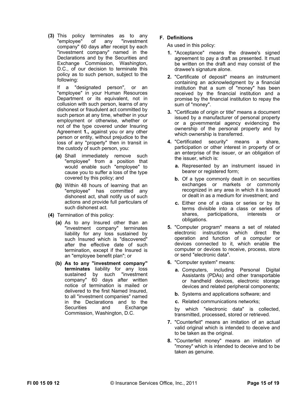 FI 00 15 09 12 © Insurance Services Office, Inc., 2011 Page 15 of 19 (3) This policy terminates as to any "employee" of any "investment company" 60 days after receipt by each "investment company" named in the Declarations and by the Securities and Exchange Commission, Washington, D.C., of our decision to terminate this policy as to such person, subject to the following: If a "designated person", or an "employee" in your Human Resources Department or its equivalent, not in collusion with such person, learns of any dishonest or fraudulent act committed by such person at any time, whether in your employment or otherwise, whether or not of the type covered under Insuring Agreement 1., against you or any other person or entity, without prejudice to the loss of any "property" then in transit in the custody of such person, you: (a) Shall immediately remove such "employee" from a position that would enable such "employee" to cause you to suffer a loss of the type covered by this policy; and (b) Within 48 hours of learning that an "employee" has committed any dishonest act, shall notify us of such actions and provide full particulars of such dishonest act. (4) Termination of this policy: (a) As to any Insured other than an "investment company" terminates liability for any loss sustained by such Insured which is "discovered" after the effective date of such termination, except if the Insured is an "employee benefit plan"; or (b) As to any "investment company" terminates liability for any loss sustained by such "investment company" 60 days after written notice of termination is mailed or delivered to the first Named Insured, to all "investment companies" named in the Declarations and to the Securities and Exchange Commission, Washington, D.C. F. Definitions As used in this policy: 1. "Acceptance" means the drawee's signed agreement to pay a draft as presented. It must be written on the draft and may consist of the drawee's signature alone. 2. "Certificate of deposit" means an instrument containing an acknowledgment by a financial institution that a sum of "money" has been received by the financial institution and a promise by the financial institution to repay the sum of "money". 3. "Certificate of origin or title" means a document issued by a manufacturer of personal property or a governmental agency evidencing the ownership of the personal property and by which ownership is transferred. 4. "Certificated security" means a share, participation or other interest in property of or an enterprise of the issuer, or an obligation of the issuer, which is: a. Represented by an instrument issued in bearer or registered form; b. Of a type commonly dealt in on securities exchanges or markets or commonly recognized in any area in which it is issued or dealt in as a medium for investment; and c. Either one of a class or series or by its terms divisible into a class or series of shares, participations, interests or obligations. 5. "Computer program" means a set of related electronic instructions which direct the operation and function of a computer or devices connected to it, which enable the computer or devices to receive, process, store or send "electronic data". 6. "Computer system" means: a. Computers, including Personal Digital Assistants (PDAs) and other transportable or handheld devices, electronic storage devices and related peripheral components; b. Systems and applications software; and c. Related communications networks; by which "electronic data" is collected, transmitted, processed, stored or retrieved. 7. "Counterfeit" means an imitation of an actual valid original which is intended to deceive and to be taken as the original. 8. "Counterfeit money" means an imitation of "money" which is intended to deceive and to be taken as genuine.