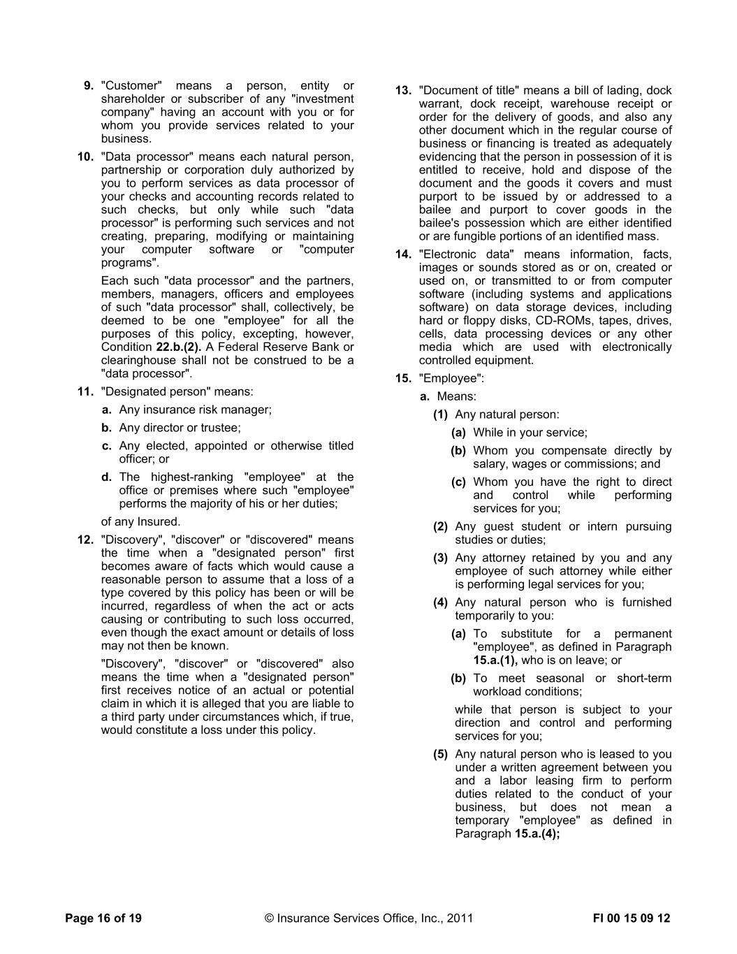 Page 16 of 19 © Insurance Services Office, Inc., 2011 FI 00 15 09 12 9. "Customer" means a person, entity or shareholder or subscriber of any "investment company" having an account with you or for whom you provide services related to your business. 10. "Data processor" means each natural person, partnership or corporation duly authorized by you to perform services as data processor of your checks and accounting records related to such checks, but only while such "data processor" is performing such services and not creating, preparing, modifying or maintaining your computer software or "computer programs". Each such "data processor" and the partners, members, managers, officers and employees of such "data processor" shall, collectively, be deemed to be one "employee" for all the purposes of this policy, excepting, however, Condition 22.b.(2). A Federal Reserve Bank or clearinghouse shall not be construed to be a "data processor". 11. "Designated person" means: a. Any insurance risk manager; b. Any director or trustee; c. Any elected, appointed or otherwise titled officer; or d. The highest-ranking "employee" at the office or premises where such "employee" performs the majority of his or her duties; of any Insured. 12. "Discovery", "discover" or "discovered" means the time when a "designated person" first becomes aware of facts which would cause a reasonable person to assume that a loss of a type covered by this policy has been or will be incurred, regardless of when the act or acts causing or contributing to such loss occurred, even though the exact amount or details of loss may not then be known. "Discovery", "discover" or "discovered" also means the time when a "designated person" first receives notice of an actual or potential claim in which it is alleged that you are liable to a third party under circumstances which, if true, would constitute a loss under this policy. 13. "Document of title" means a bill of lading, dock warrant, dock receipt, warehouse receipt or order for the delivery of goods, and also any other document which in the regular course of business or financing is treated as adequately evidencing that the person in possession of it is entitled to receive, hold and dispose of the document and the goods it covers and must purport to be issued by or addressed to a bailee and purport to cover goods in the bailee's possession which are either identified or are fungible portions of an identified mass. 14. "Electronic data" means information, facts, images or sounds stored as or on, created or used on, or transmitted to or from computer software (including systems and applications software) on data storage devices, including hard or floppy disks, CD-ROMs, tapes, drives, cells, data processing devices or any other media which are used with electronically controlled equipment. 15. "Employee": a. Means: (1) Any natural person: (a) While in your service; (b) Whom you compensate directly by salary, wages or commissions; and (c) Whom you have the right to direct and control while performing services for you; (2) Any guest student or intern pursuing studies or duties; (3) Any attorney retained by you and any employee of such attorney while either is performing legal services for you; (4) Any natural person who is furnished temporarily to you: (a) To substitute for a permanent "employee", as defined in Paragraph 15.a.(1), who is on leave; or (b) To meet seasonal or short-term workload conditions; while that person is subject to your direction and control and performing services for you; (5) Any natural person who is leased to you under a written agreement between you and a labor leasing firm to perform duties related to the conduct of your business, but does not mean a temporary "employee" as defined in Paragraph 15.a.(4);
