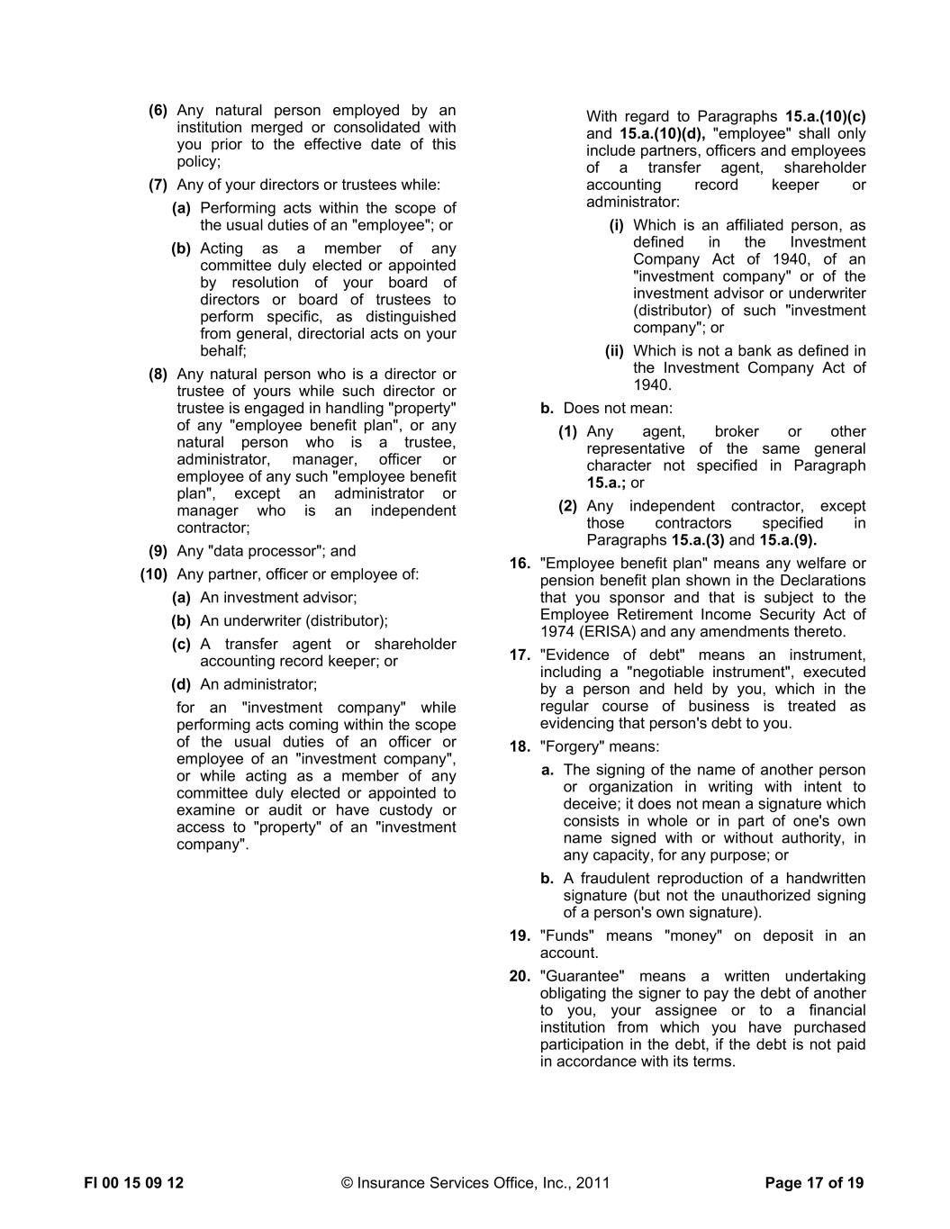FI 00 15 09 12 © Insurance Services Office, Inc., 2011 Page 17 of 19 (6) Any natural person employed by an institution merged or consolidated with you prior to the effective date of this policy; (7) Any of your directors or trustees while: (a) Performing acts within the scope of the usual duties of an "employee"; or (b) Acting as a member of any committee duly elected or appointed by resolution of your board of directors or board of trustees to perform specific, as distinguished from general, directorial acts on your behalf; (8) Any natural person who is a director or trustee of yours while such director or trustee is engaged in handling "property" of any "employee benefit plan", or any natural person who is a trustee, administrator, manager, officer or employee of any such "employee benefit plan", except an administrator or manager who is an independent contractor; (9) Any "data processor"; and (10) Any partner, officer or employee of: (a) An investment advisor; (b) An underwriter (distributor); (c) A transfer agent or shareholder accounting record keeper; or (d) An administrator; for an "investment company" while performing acts coming within the scope of the usual duties of an officer or employee of an "investment company", or while acting as a member of any committee duly elected or appointed to examine or audit or have custody or access to "property" of an "investment company". With regard to Paragraphs 15.a.(10)(c) and 15.a.(10)(d), "employee" shall only include partners, officers and employees of a transfer agent, shareholder accounting record keeper or administrator: (i) Which is an affiliated person, as defined in the Investment Company Act of 1940, of an "investment company" or of the investment advisor or underwriter (distributor) of such "investment company"; or (ii) Which is not a bank as defined in the Investment Company Act of 1940. b. Does not mean: (1) Any agent, broker or other representative of the same general character not specified in Paragraph 15.a.; or (2) Any independent contractor, except those contractors specified in Paragraphs 15.a.(3) and 15.a.(9). 16. "Employee benefit plan" means any welfare or pension benefit plan shown in the Declarations that you sponsor and that is subject to the Employee Retirement Income Security Act of 1974 (ERISA) and any amendments thereto. 17. "Evidence of debt" means an instrument, including a "negotiable instrument", executed by a person and held by you, which in the regular course of business is treated as evidencing that person's debt to you. 18. "Forgery" means: a. The signing of the name of another person or organization in writing with intent to deceive; it does not mean a signature which consists in whole or in part of one's own name signed with or without authority, in any capacity, for any purpose; or b. A fraudulent reproduction of a handwritten signature (but not the unauthorized signing of a person's own signature). 19. "Funds" means "money" on deposit in an account. 20. "Guarantee" means a written undertaking obligating the signer to pay the debt of another to you, your assignee or to a financial institution from which you have purchased participation in the debt, if the debt is not paid in accordance with its terms.