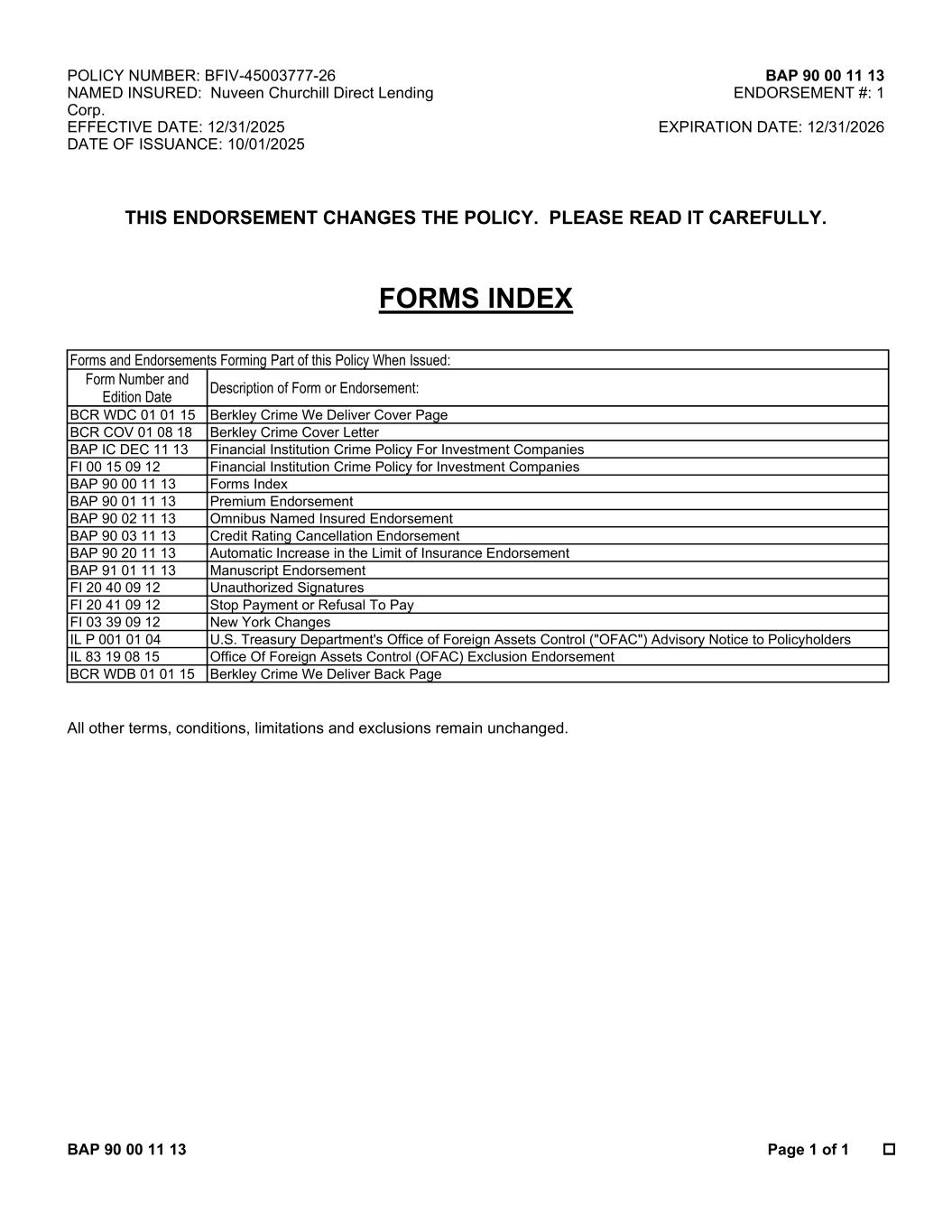 BAP 90 00 11 13 Page 1 of 1 POLICY NUMBER: BFIV-45003777-26 BAP 90 00 11 13 NAMED INSURED: Nuveen Churchill Direct Lending Corp. ENDORSEMENT #: 1 EFFECTIVE DATE: 12/31/2025 EXPIRATION DATE: 12/31/2026 DATE OF ISSUANCE: 10/01/2025 THIS ENDORSEMENT CHANGES THE POLICY. PLEASE READ IT CAREFULLY. FORMS INDEX Forms and Endorsements Forming Part of this Policy When Issued: Form Number and Edition Date Description of Form or Endorsement: BCR WDC 01 01 15 Berkley Crime We Deliver Cover Page BCR COV 01 08 18 Berkley Crime Cover Letter BAP IC DEC 11 13 Financial Institution Crime Policy For Investment Companies FI 00 15 09 12 Financial Institution Crime Policy for Investment Companies BAP 90 00 11 13 Forms Index BAP 90 01 11 13 Premium Endorsement BAP 90 02 11 13 Omnibus Named Insured Endorsement BAP 90 03 11 13 Credit Rating Cancellation Endorsement BAP 90 20 11 13 Automatic Increase in the Limit of Insurance Endorsement BAP 91 01 11 13 Manuscript Endorsement FI 20 40 09 12 Unauthorized Signatures FI 20 41 09 12 Stop Payment or Refusal To Pay FI 03 39 09 12 New York Changes IL P 001 01 04 U.S. Treasury Department's Office of Foreign Assets Control ("OFAC") Advisory Notice to Policyholders IL 83 19 08 15 Office Of Foreign Assets Control (OFAC) Exclusion Endorsement BCR WDB 01 01 15 Berkley Crime We Deliver Back Page All other terms, conditions, limitations and exclusions remain unchanged.
