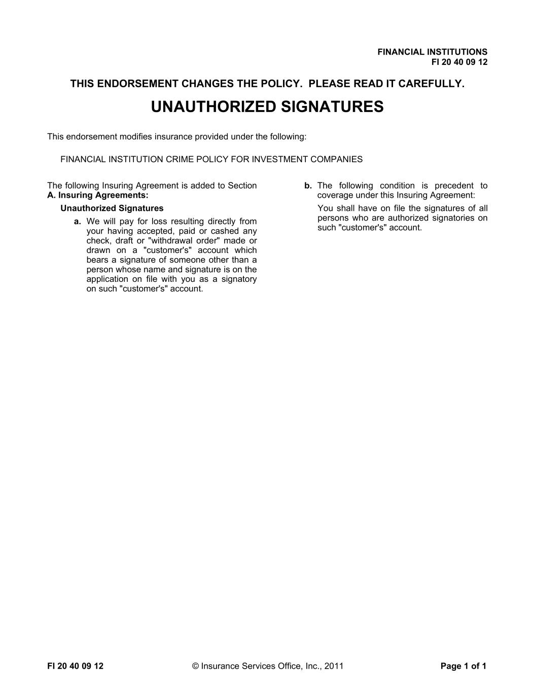 FINANCIAL INSTITUTIONS FI 20 40 09 12 THIS ENDORSEMENT CHANGES THE POLICY. PLEASE READ IT CAREFULLY. FI 20 40 09 12 © Insurance Services Office, Inc., 2011 Page 1 of 1 UNAUTHORIZED SIGNATURES This endorsement modifies insurance provided under the following: FINANCIAL INSTITUTION CRIME POLICY FOR INVESTMENT COMPANIES The following Insuring Agreement is added to Section A. Insuring Agreements: Unauthorized Signatures a. We will pay for loss resulting directly from your having accepted, paid or cashed any check, draft or "withdrawal order" made or drawn on a "customer's" account which bears a signature of someone other than a person whose name and signature is on the application on file with you as a signatory on such "customer's" account. b. The following condition is precedent to coverage under this Insuring Agreement: You shall have on file the signatures of all persons who are authorized signatories on such "customer's" account.
