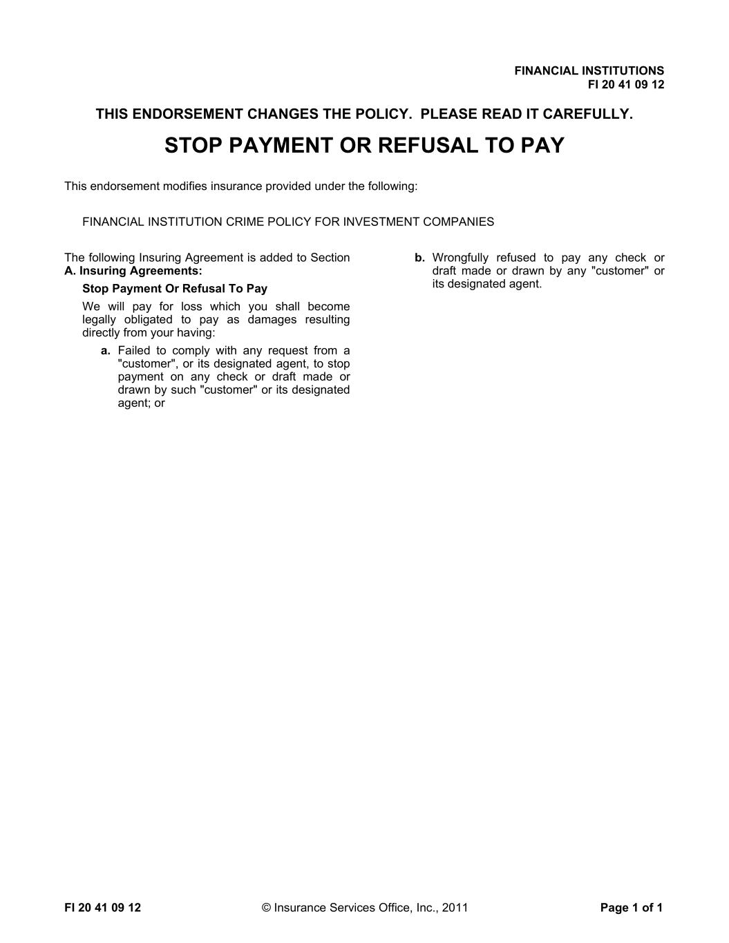 FINANCIAL INSTITUTIONS FI 20 41 09 12 THIS ENDORSEMENT CHANGES THE POLICY. PLEASE READ IT CAREFULLY. FI 20 41 09 12 © Insurance Services Office, Inc., 2011 Page 1 of 1 STOP PAYMENT OR REFUSAL TO PAY This endorsement modifies insurance provided under the following: FINANCIAL INSTITUTION CRIME POLICY FOR INVESTMENT COMPANIES The following Insuring Agreement is added to Section A. Insuring Agreements: Stop Payment Or Refusal To Pay We will pay for loss which you shall become legally obligated to pay as damages resulting directly from your having: a. Failed to comply with any request from a "customer", or its designated agent, to stop payment on any check or draft made or drawn by such "customer" or its designated agent; or b. Wrongfully refused to pay any check or draft made or drawn by any "customer" or its designated agent.