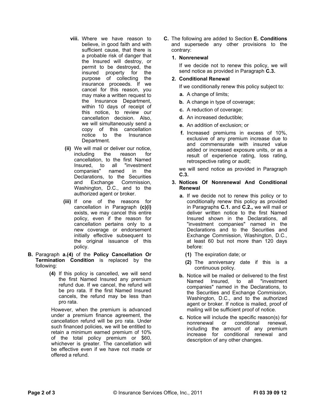 Page 2 of 3 © Insurance Services Office, Inc., 2011 FI 03 39 09 12 viii. Where we have reason to believe, in good faith and with sufficient cause, that there is a probable risk of danger that the Insured will destroy, or permit to be destroyed, the insured property for the purpose of collecting the insurance proceeds. If we cancel for this reason, you may make a written request to the Insurance Department, within 10 days of receipt of this notice, to review our cancellation decision. Also, we will simultaneously send a copy of this cancellation notice to the Insurance Department. (ii) We will mail or deliver our notice, including the reason for cancellation, to the first Named Insured, to all "investment companies" named in the Declarations, to the Securities and Exchange Commission, Washington, D.C., and to the authorized agent or broker. (iii) If one of the reasons for cancellation in Paragraph (c)(i) exists, we may cancel this entire policy, even if the reason for cancellation pertains only to a new coverage or endorsement initially effective subsequent to the original issuance of this policy. B. Paragraph a.(4) of the Policy Cancellation Or Termination Condition is replaced by the following: (4) If this policy is cancelled, we will send the first Named Insured any premium refund due. If we cancel, the refund will be pro rata. If the first Named Insured cancels, the refund may be less than pro rata. However, when the premium is advanced under a premium finance agreement, the cancellation refund will be pro rata. Under such financed policies, we will be entitled to retain a minimum earned premium of 10% of the total policy premium or $60, whichever is greater. The cancellation will be effective even if we have not made or offered a refund. C. The following are added to Section E. Conditions and supersede any other provisions to the contrary: 1. Nonrenewal If we decide not to renew this policy, we will send notice as provided in Paragraph C.3. 2. Conditional Renewal If we conditionally renew this policy subject to: a. A change of limits; b. A change in type of coverage; c. A reduction of coverage; d. An increased deductible; e. An addition of exclusion; or f. Increased premiums in excess of 10%, exclusive of any premium increase due to and commensurate with insured value added or increased exposure units, or as a result of experience rating, loss rating, retrospective rating or audit; we will send notice as provided in Paragraph C.3. 3. Notices Of Nonrenewal And Conditional Renewal a. If we decide not to renew this policy or to conditionally renew this policy as provided in Paragraphs C.1. and C.2., we will mail or deliver written notice to the first Named Insured shown in the Declarations, all "investment companies" named in the Declarations and to the Securities and Exchange Commission, Washington, D.C., at least 60 but not more than 120 days before: (1) The expiration date; or (2) The anniversary date if this is a continuous policy. b. Notice will be mailed or delivered to the first Named Insured, to all "investment companies" named in the Declarations, to the Securities and Exchange Commission, Washington, D.C., and to the authorized agent or broker. If notice is mailed, proof of mailing will be sufficient proof of notice. c. Notice will include the specific reason(s) for nonrenewal or conditional renewal, including the amount of any premium increase for conditional renewal and description of any other changes.