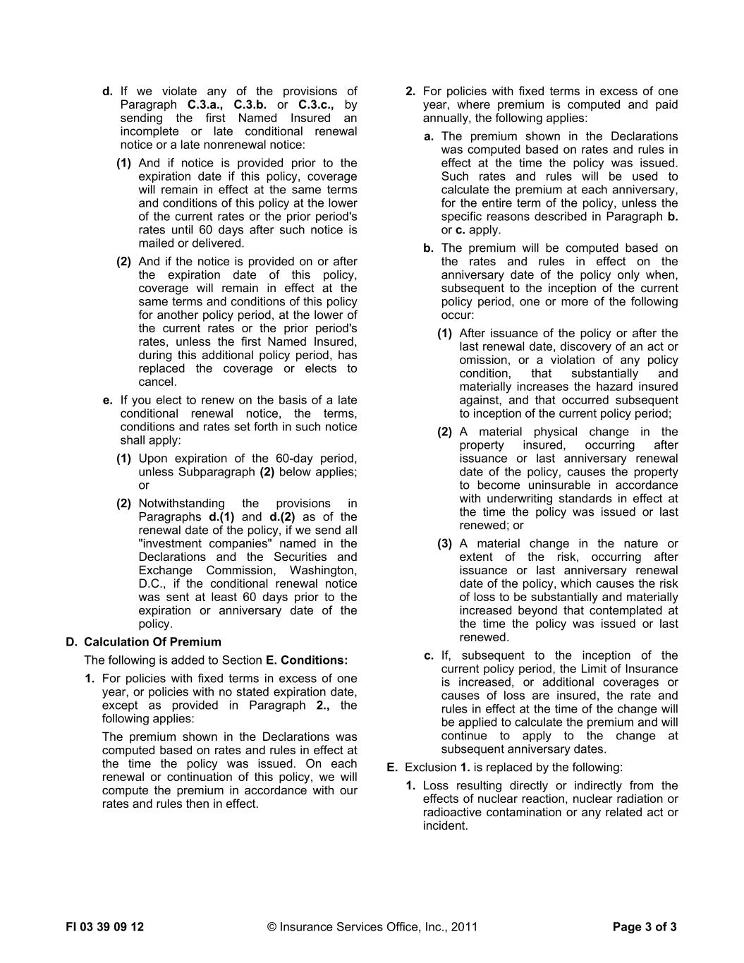 FI 03 39 09 12 © Insurance Services Office, Inc., 2011 Page 3 of 3 d. If we violate any of the provisions of Paragraph C.3.a., C.3.b. or C.3.c., by sending the first Named Insured an incomplete or late conditional renewal notice or a late nonrenewal notice: (1) And if notice is provided prior to the expiration date if this policy, coverage will remain in effect at the same terms and conditions of this policy at the lower of the current rates or the prior period's rates until 60 days after such notice is mailed or delivered. (2) And if the notice is provided on or after the expiration date of this policy, coverage will remain in effect at the same terms and conditions of this policy for another policy period, at the lower of the current rates or the prior period's rates, unless the first Named Insured, during this additional policy period, has replaced the coverage or elects to cancel. e. If you elect to renew on the basis of a late conditional renewal notice, the terms, conditions and rates set forth in such notice shall apply: (1) Upon expiration of the 60-day period, unless Subparagraph (2) below applies; or (2) Notwithstanding the provisions in Paragraphs d.(1) and d.(2) as of the renewal date of the policy, if we send all "investment companies" named in the Declarations and the Securities and Exchange Commission, Washington, D.C., if the conditional renewal notice was sent at least 60 days prior to the expiration or anniversary date of the policy. D. Calculation Of Premium The following is added to Section E. Conditions: 1. For policies with fixed terms in excess of one year, or policies with no stated expiration date, except as provided in Paragraph 2., the following applies: The premium shown in the Declarations was computed based on rates and rules in effect at the time the policy was issued. On each renewal or continuation of this policy, we will compute the premium in accordance with our rates and rules then in effect. 2. For policies with fixed terms in excess of one year, where premium is computed and paid annually, the following applies: a. The premium shown in the Declarations was computed based on rates and rules in effect at the time the policy was issued. Such rates and rules will be used to calculate the premium at each anniversary, for the entire term of the policy, unless the specific reasons described in Paragraph b. or c. apply. b. The premium will be computed based on the rates and rules in effect on the anniversary date of the policy only when, subsequent to the inception of the current policy period, one or more of the following occur: (1) After issuance of the policy or after the last renewal date, discovery of an act or omission, or a violation of any policy condition, that substantially and materially increases the hazard insured against, and that occurred subsequent to inception of the current policy period; (2) A material physical change in the property insured, occurring after issuance or last anniversary renewal date of the policy, causes the property to become uninsurable in accordance with underwriting standards in effect at the time the policy was issued or last renewed; or (3) A material change in the nature or extent of the risk, occurring after issuance or last anniversary renewal date of the policy, which causes the risk of loss to be substantially and materially increased beyond that contemplated at the time the policy was issued or last renewed. c. If, subsequent to the inception of the current policy period, the Limit of Insurance is increased, or additional coverages or causes of loss are insured, the rate and rules in effect at the time of the change will be applied to calculate the premium and will continue to apply to the change at subsequent anniversary dates. E. Exclusion 1. is replaced by the following: 1. Loss resulting directly or indirectly from the effects of nuclear reaction, nuclear radiation or radioactive contamination or any related act or incident.