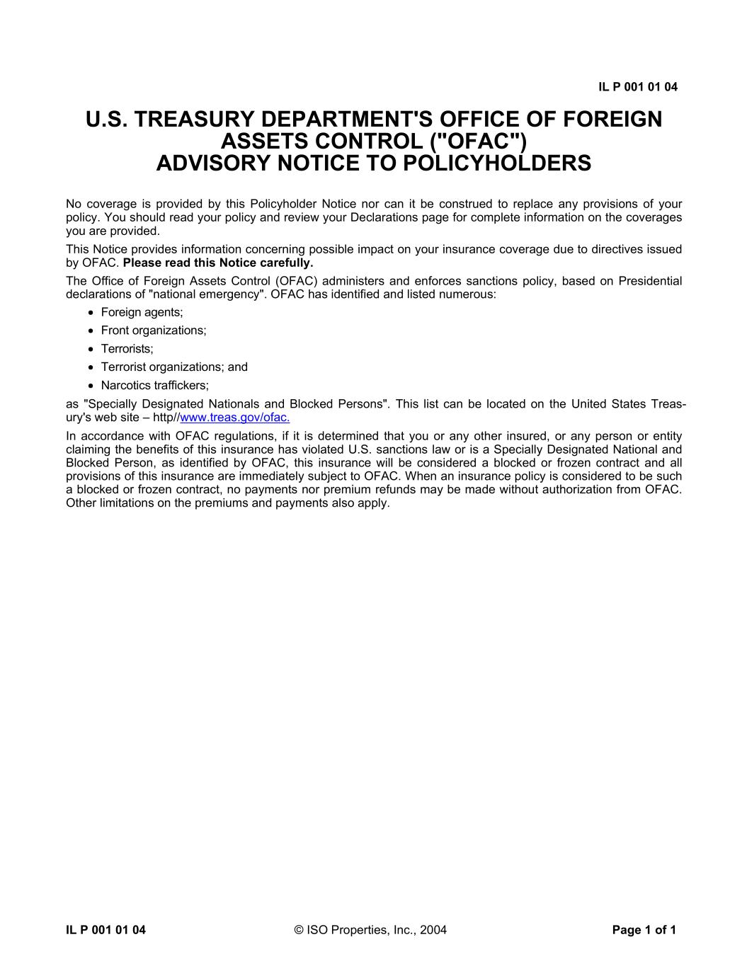 IL P 001 01 04 © ISO Properties, Inc., 2004 Page 1 of 1 IL P 001 01 04 U.S. TREASURY DEPARTMENT'S OFFICE OF FOREIGN ASSETS CONTROL ("OFAC") ADVISORY NOTICE TO POLICYHOLDERS No coverage is provided by this Policyholder Notice nor can it be construed to replace any provisions of your policy. You should read your policy and review your Declarations page for complete information on the coverages you are provided. This Notice provides information concerning possible impact on your insurance coverage due to directives issued by OFAC. Please read this Notice carefully. The Office of Foreign Assets Control (OFAC) administers and enforces sanctions policy, based on Presidential declarations of "national emergency". OFAC has identified and listed numerous: Foreign agents; Front organizations; Terrorists; Terrorist organizations; and Narcotics traffickers; as "Specially Designated Nationals and Blocked Persons". This list can be located on the United States Treas- ury's web site – http//www.treas.gov/ofac. In accordance with OFAC regulations, if it is determined that you or any other insured, or any person or entity claiming the benefits of this insurance has violated U.S. sanctions law or is a Specially Designated National and Blocked Person, as identified by OFAC, this insurance will be considered a blocked or frozen contract and all provisions of this insurance are immediately subject to OFAC. When an insurance policy is considered to be such a blocked or frozen contract, no payments nor premium refunds may be made without authorization from OFAC. Other limitations on the premiums and payments also apply.